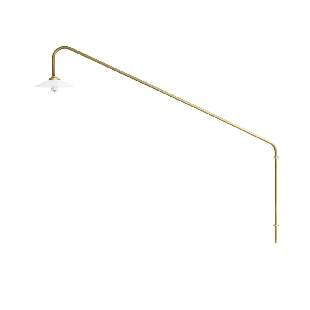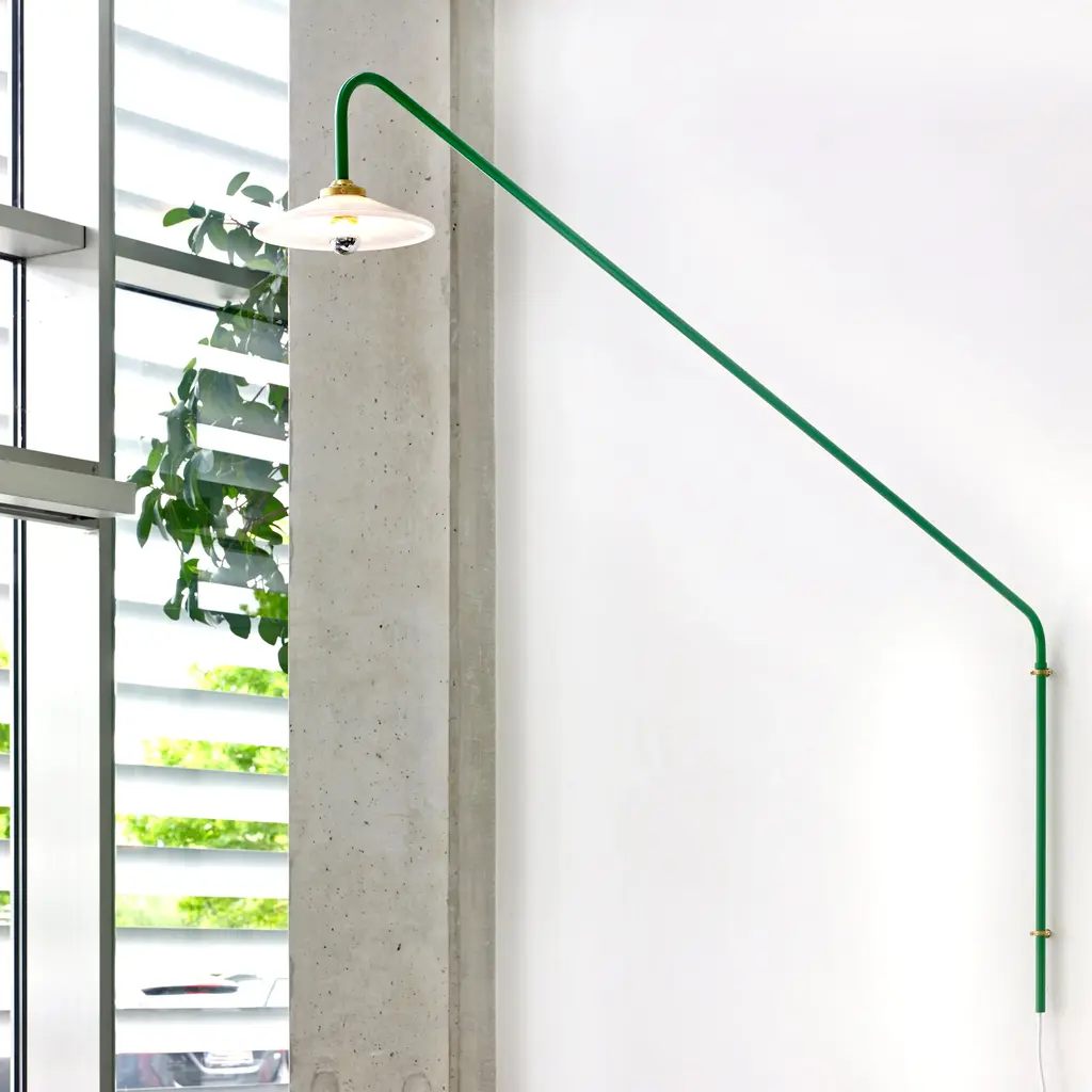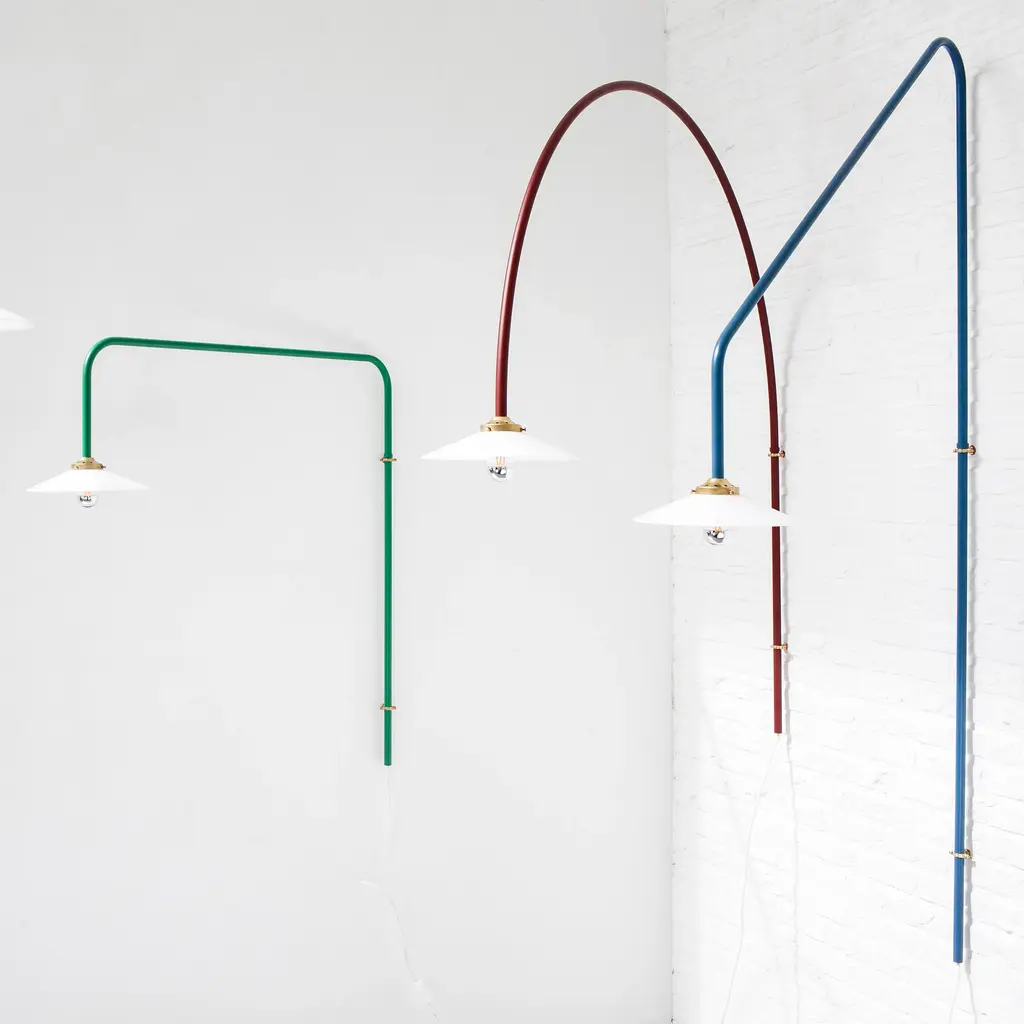 Muller Van Severen’s initial version of their wall-mounted pendant makes a dramatic upward slant. The series was conceived the duo needed a dining table light in a room without a ceiling outlet. The linear fixture makes a statement without dominating a space and is crafted in steel tubing in brass, black or several curated colors.