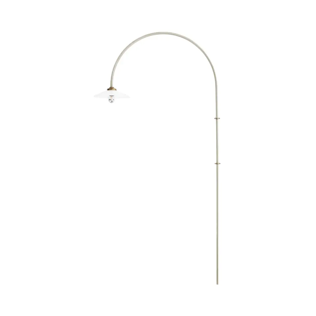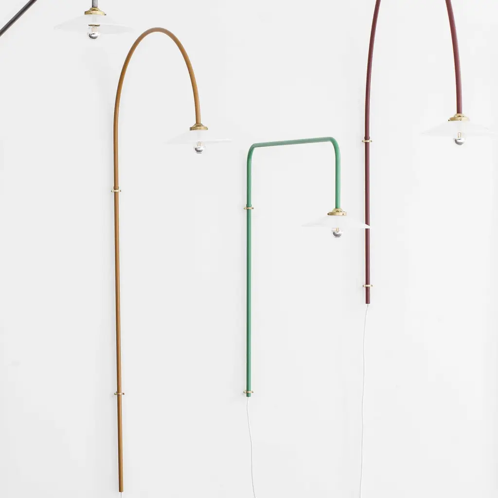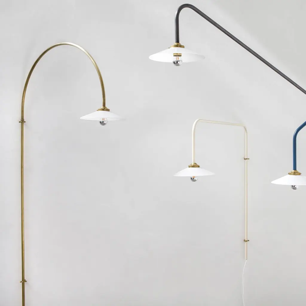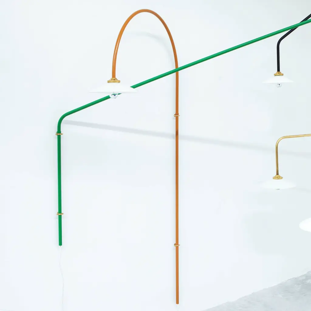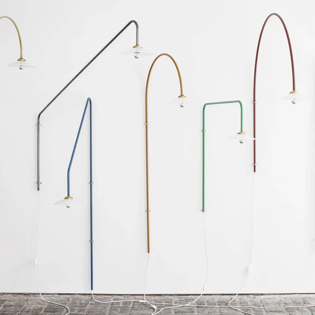 A taller version of their Hanging Lamp series, the curved N°2 would be ideal to light a seating area or work table. Designer duo Muller Van Severen first conceived the striking wall-mounted pendant when they lacked a ceiling connector in their own home. With the crisp clarity of a line drawing, the steel-tubing frame gracefully bisects overhead space, capped by its partially exposed lightbulb and simple white glass shade. Available in a variety of finishes—brass, black or a selection of curated colors.