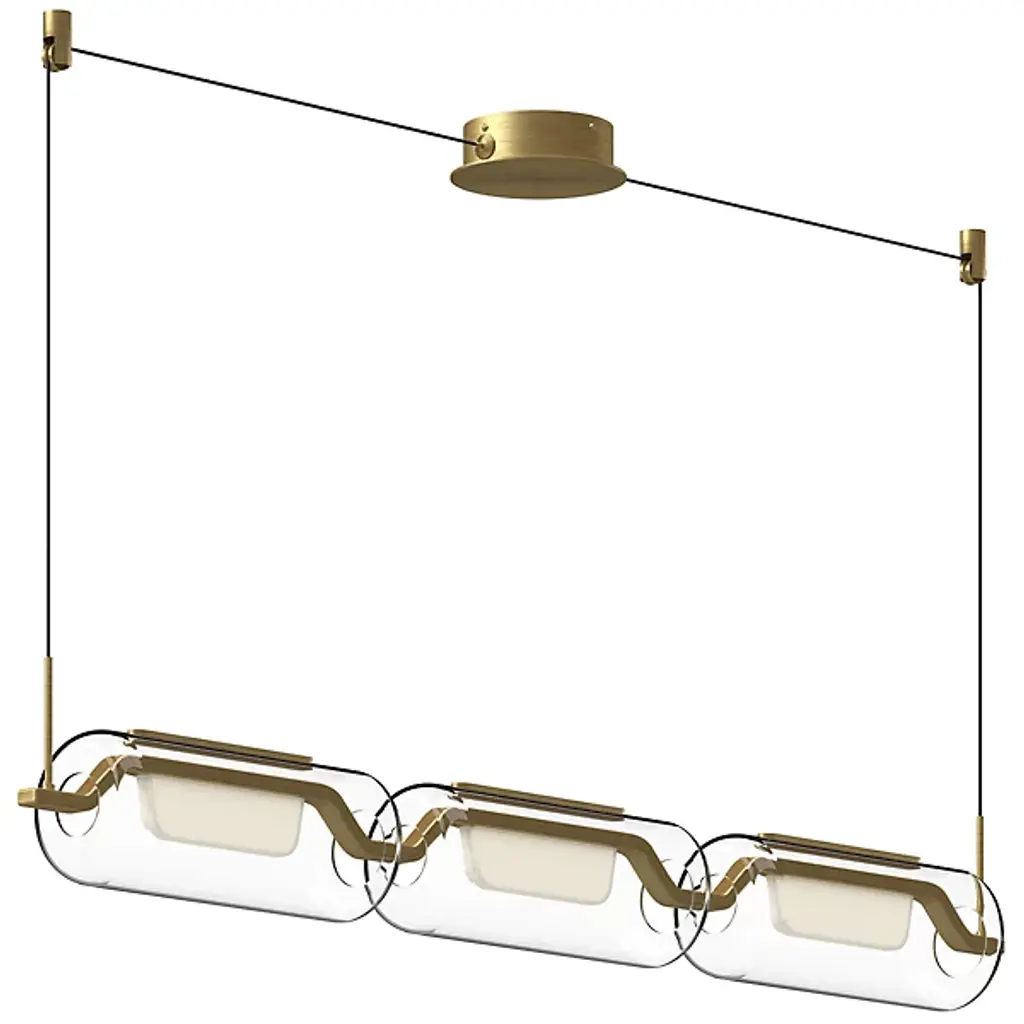 Eloquent, elegant, and airy with a signature lightness of character, the Hilo LED Linear Suspension from Kuzco Lighting provides equal measures of decoration and illumination. Suspended via a strong, slim cable strung through small anchors and a central disc canopy, it uses a curving crossbar that sweeps up and over to hold three installations of softly LED lamping set behind softly-curving translucent glass. Kuzco’s signature Light Guide technology is on full display, delivering an inspired warmth.