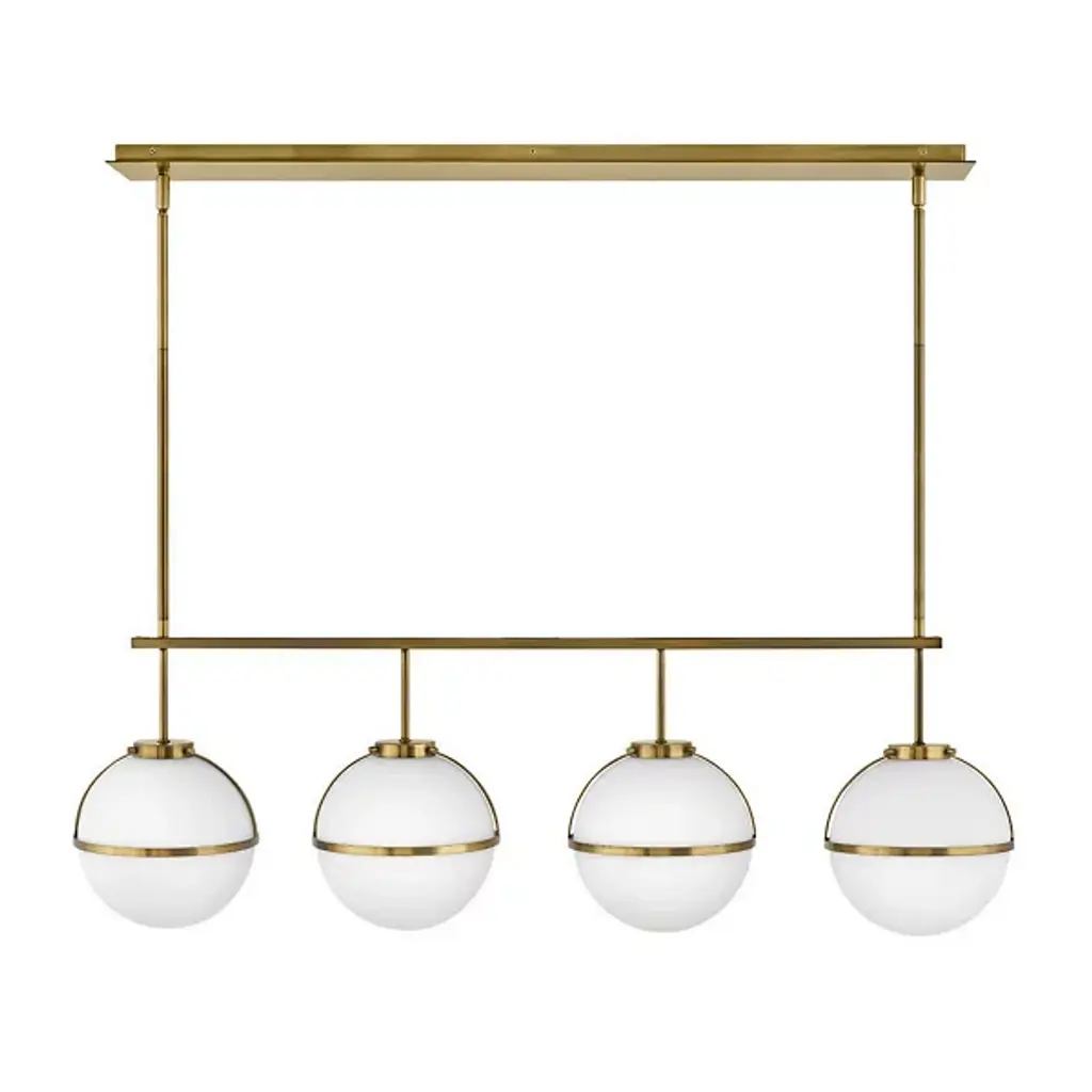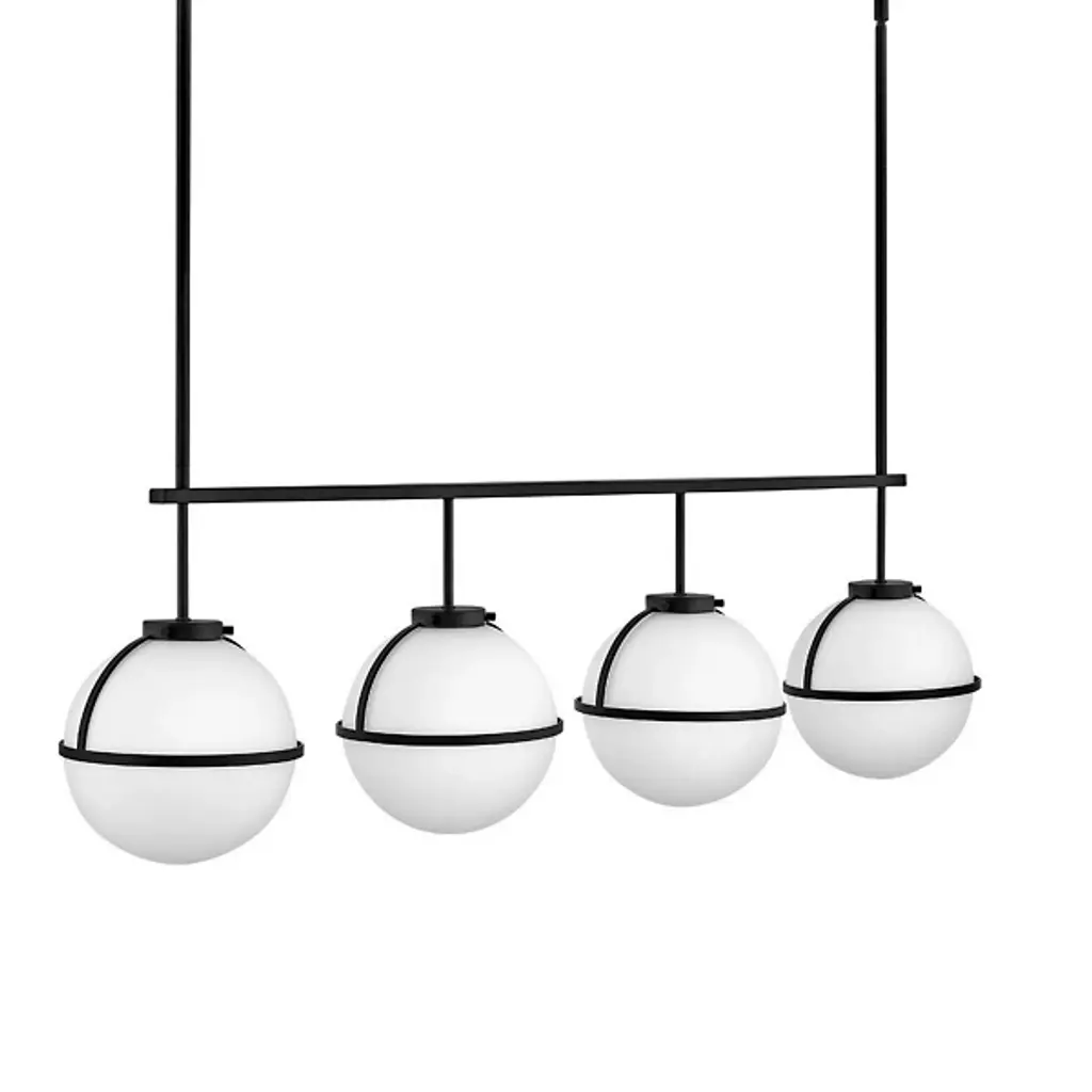 Bring a simple and elegant statement to your home with the Hollis Linear Suspension from Hinkley Lighting. Inspired by Art Deco pieces of the past, this minimalistic fixture features an array of etched opal glass globes held in an evenly spaced formation. Slender metal bars drop from its elongated canopy to frame the shades while smooth banding wraps around each piece. When illuminated, the fixture creates a balanced blanket of light.