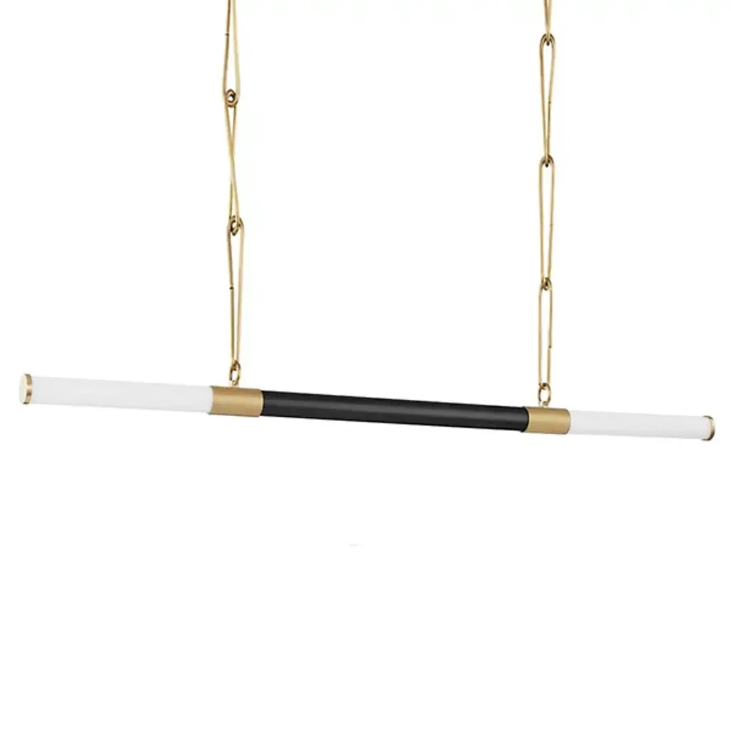 Clean, refined, stylish. The Huntington LED Linear Suspension from Hudson Valley Lighting lines up and brightens up your rooms in its rod of visual richness. Dining tables and kitchen islands are a perfect candidate for this modern piece as it streams beautifully across. It delivers a chic aesthetic with the fine shape of its hand-twisted metal chains. Milk glass and metal act in harmony as they stream across a long tubular form. The two segments of white glass stun as they catch the warmth and radiance of the integrated LEDs. The linear design makes light exit out as an even, inviting glow.