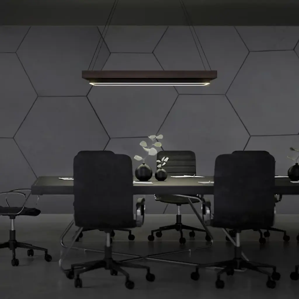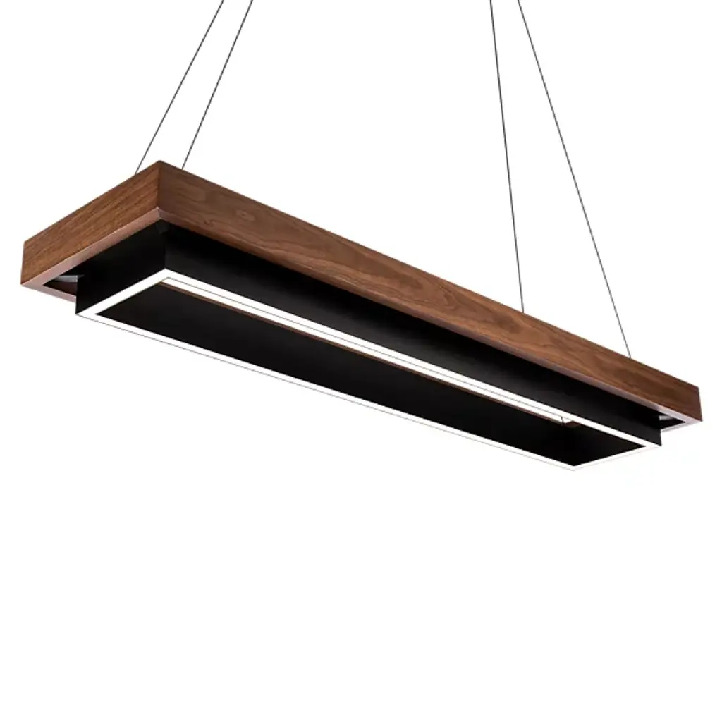 The Hustler LED Linear Suspension from Modern Forms introduces a striking fusion of aluminum and natural wood materials. This fixture, with its billiard table-inspired design, brings generous illumination to any space. Durable and damp-listed, it effortlessly caters to lighting needs. Blending contemporary and ultra-modern styles, its rectangular shape features a layered design of rectangular frames in black and dark walnut accents. It's designed to impress, making it the perfect addition for winning over guests with its unique aesthetic and ample light.