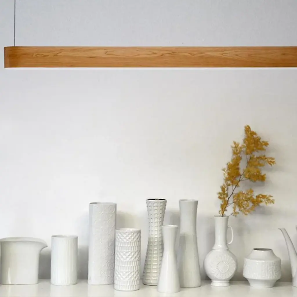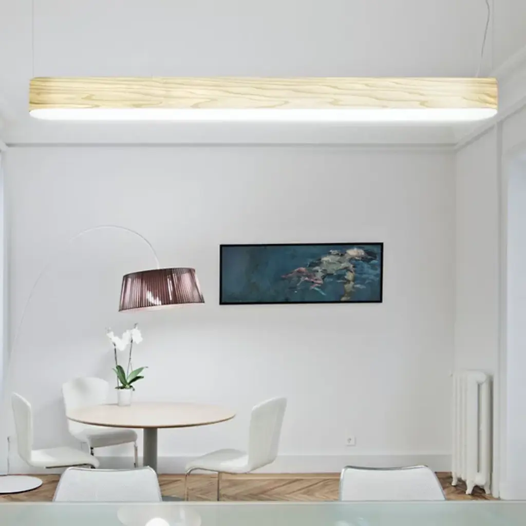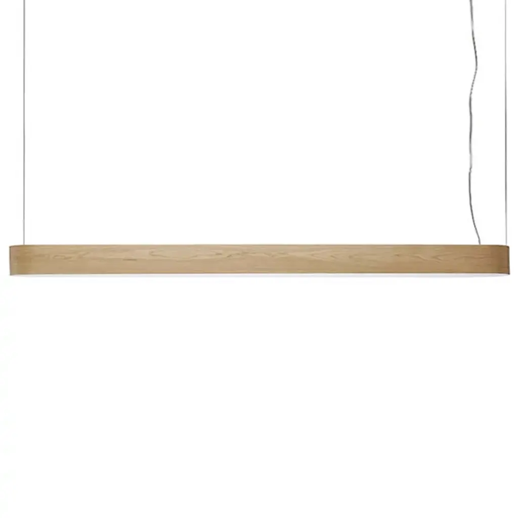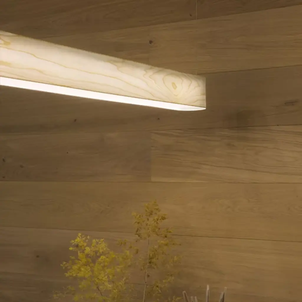 The LZF I-Club Slim Linear Suspension is an elegant lozenge-shape shade with direct and indirect lighting. Wrapped with wood veneers in a variety of colors, the I-Club Slim is able to create ambient light in addition to the task light shining through opal polycarbonate diffuser. The grain of the wood softens the look of the minimalist silhouette, giving the design a natural appeal with warm illumination.