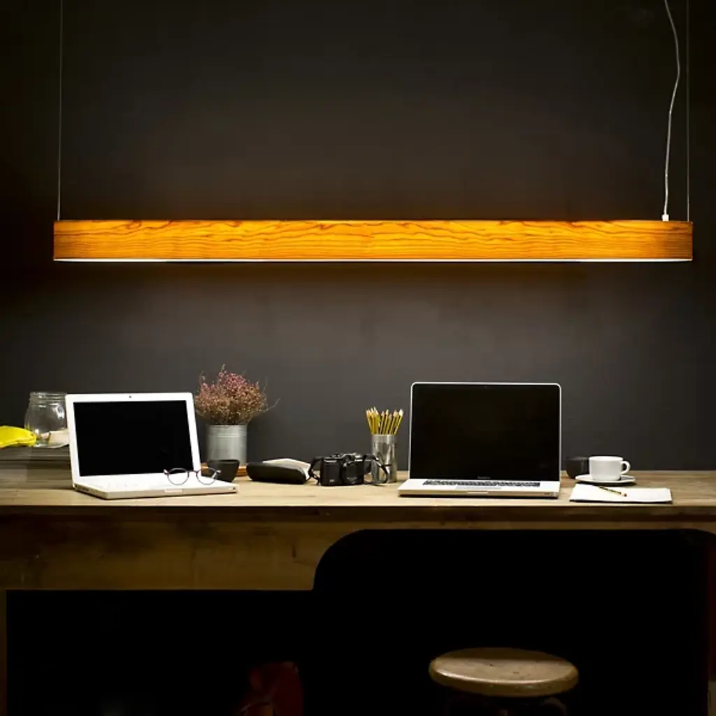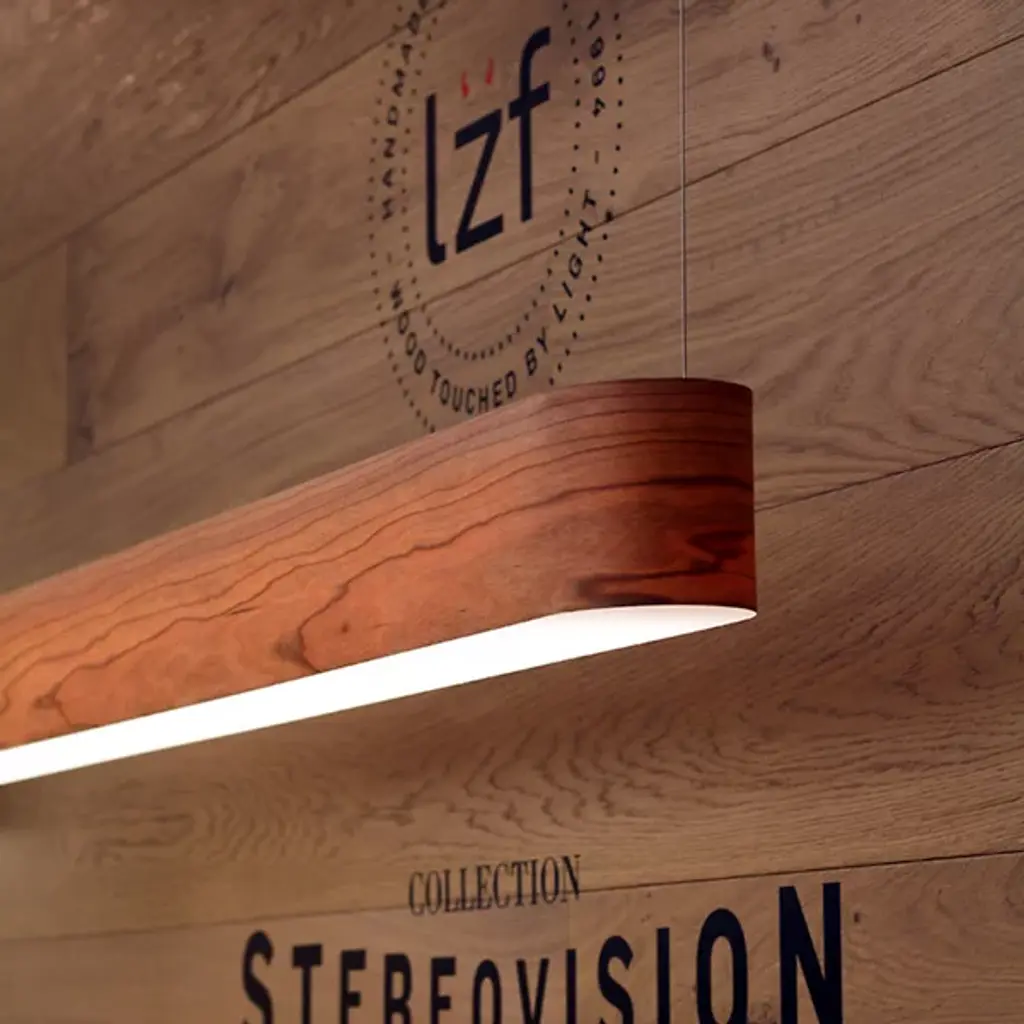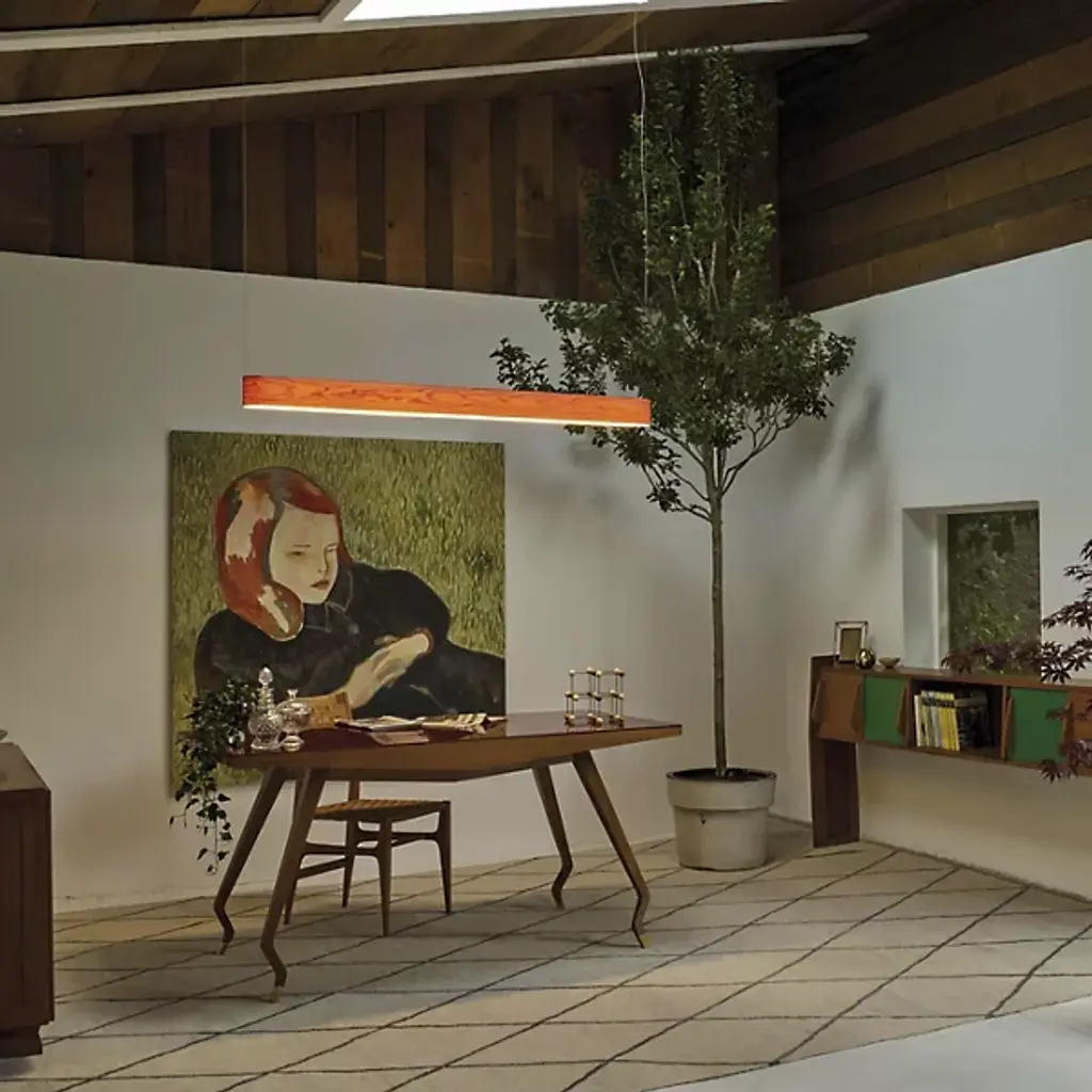 The LZF I-Club Slim Linear Suspension is an elegant lozenge-shape shade with direct and indirect lighting. Wrapped with wood veneers in a variety of colors, the I-Club Slim is able to create ambient light in addition to the task light shining through opal polycarbonate diffuser. The grain of the wood softens the look of the minimalist silhouette, giving the design a natural appeal with warm illumination.