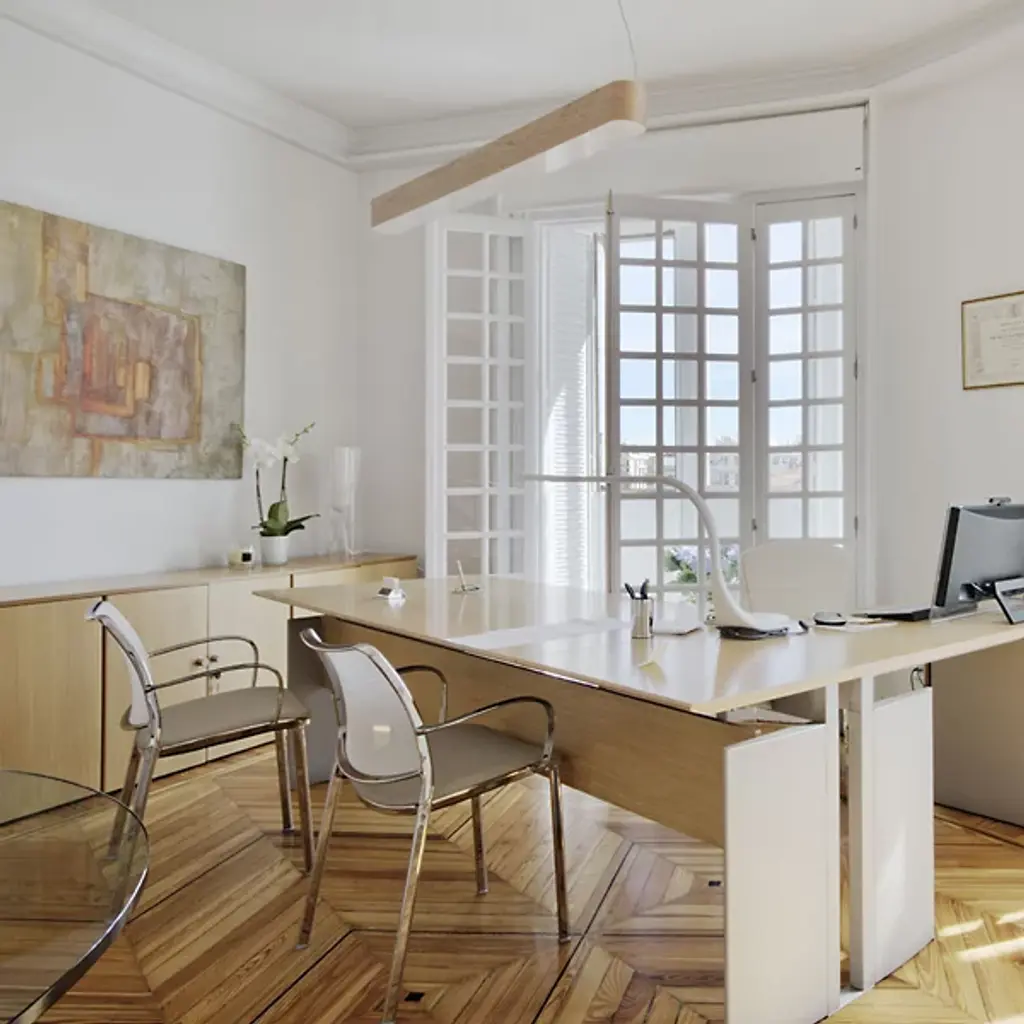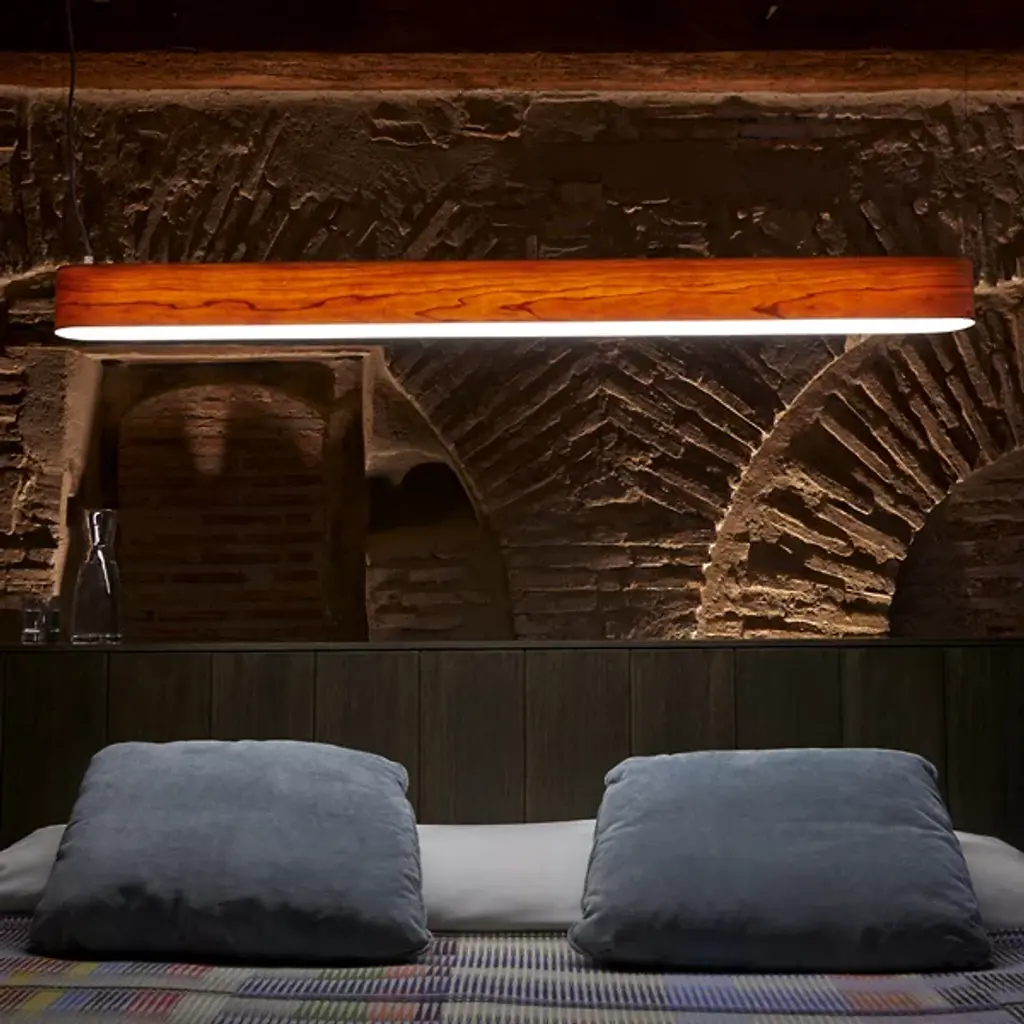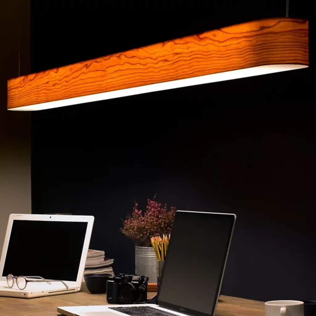 The LZF I-Club Slim Linear Suspension is an elegant lozenge-shape shade with direct and indirect lighting. Wrapped with wood veneers in a variety of colors, the I-Club Slim is able to create ambient light in addition to the task light shining through opal polycarbonate diffuser. The grain of the wood softens the look of the minimalist silhouette, giving the design a natural appeal with warm illumination.