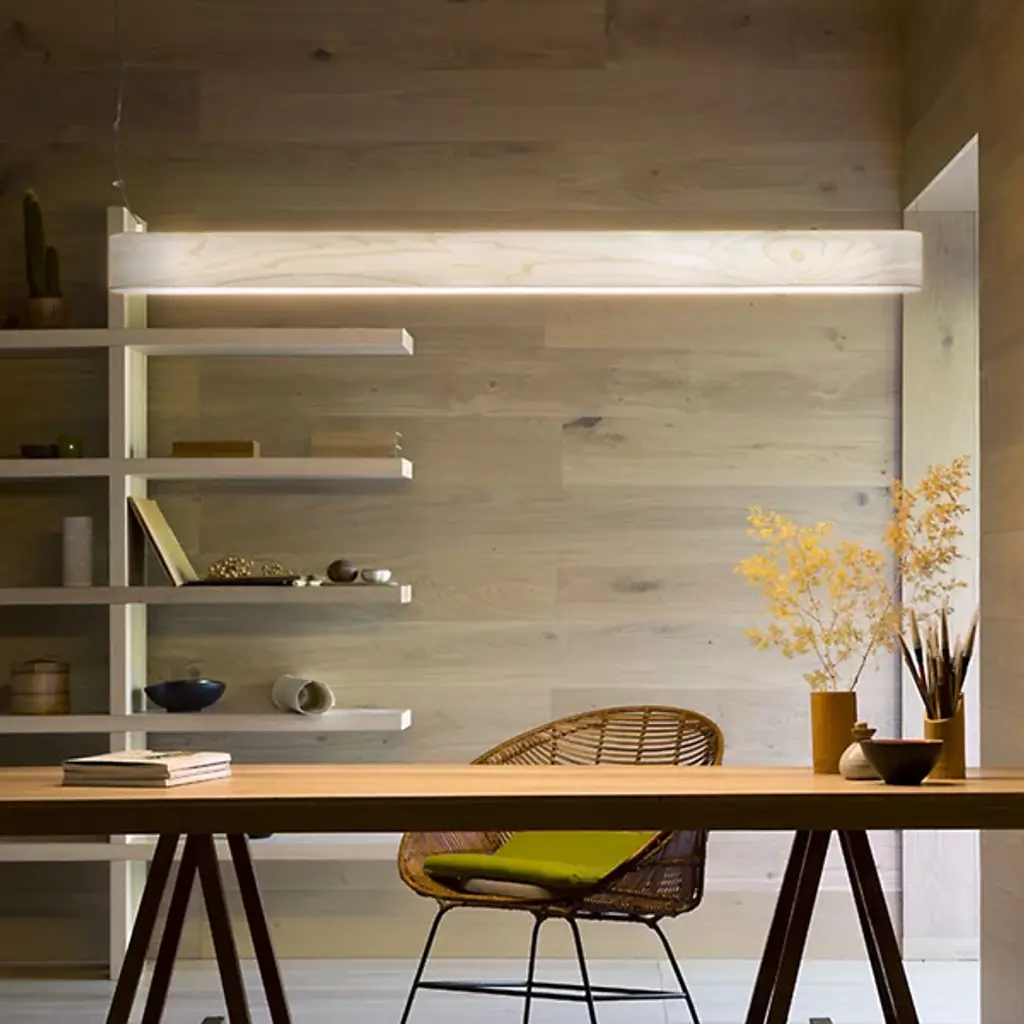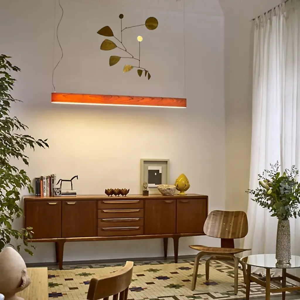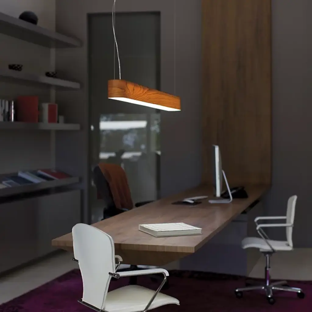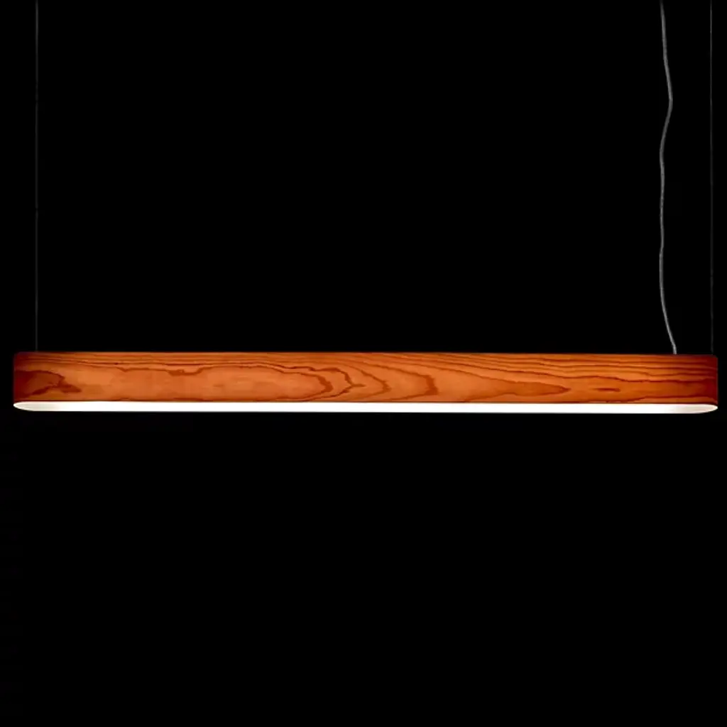 The LZF I-Club Slim Linear Suspension is an elegant lozenge-shape shade with direct and indirect lighting. Wrapped with wood veneers in a variety of colors, the I-Club Slim is able to create ambient light in addition to the task light shining through opal polycarbonate diffuser. The grain of the wood softens the look of the minimalist silhouette, giving the design a natural appeal with warm illumination.