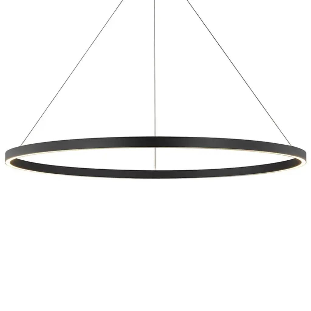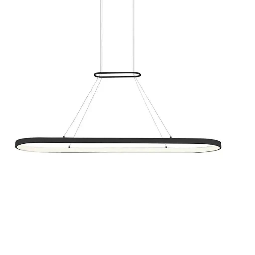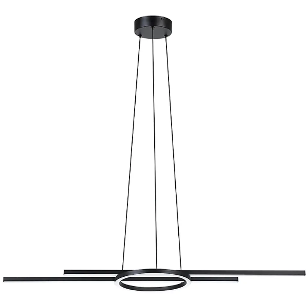 Geometric minimalism for modern dining rooms and living spaces. The Iker LED Linear Suspension by Huxe uses just 3 components to make a big design impact as well as an expansive wash of ambient light. The central element is a round metal ring, with 2 rods above extending out in opposite directions. All the pieces have acrylic lenses on the bottom to hide the many integrated LEDs within and transform their light into a bright but glare-free glow.