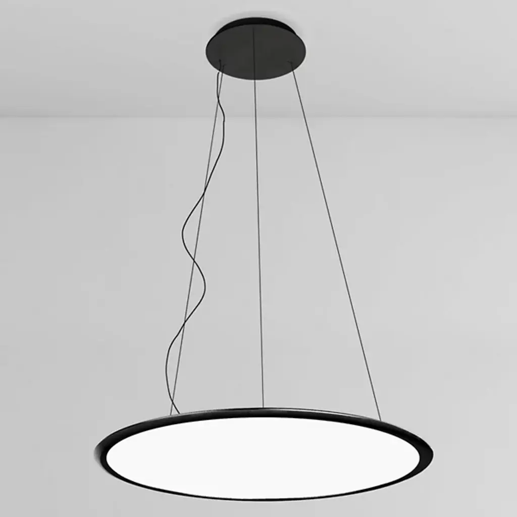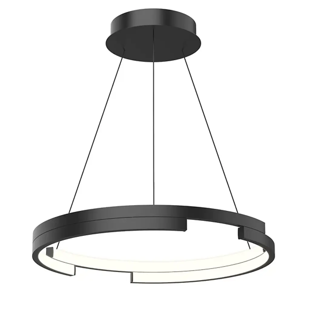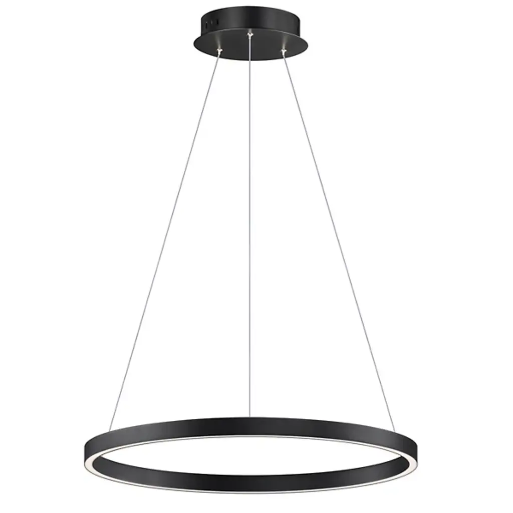 Geometric minimalism for modern dining rooms and living spaces. The Iker LED Linear Suspension by Huxe uses just 3 components to make a big design impact as well as an expansive wash of ambient light. The central element is a round metal ring, with 2 rods above extending out in opposite directions. All the pieces have acrylic lenses on the bottom to hide the many integrated LEDs within and transform their light into a bright but glare-free glow.