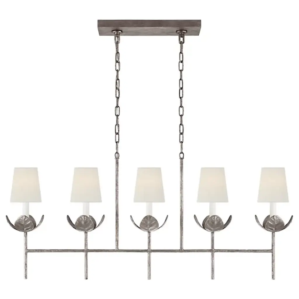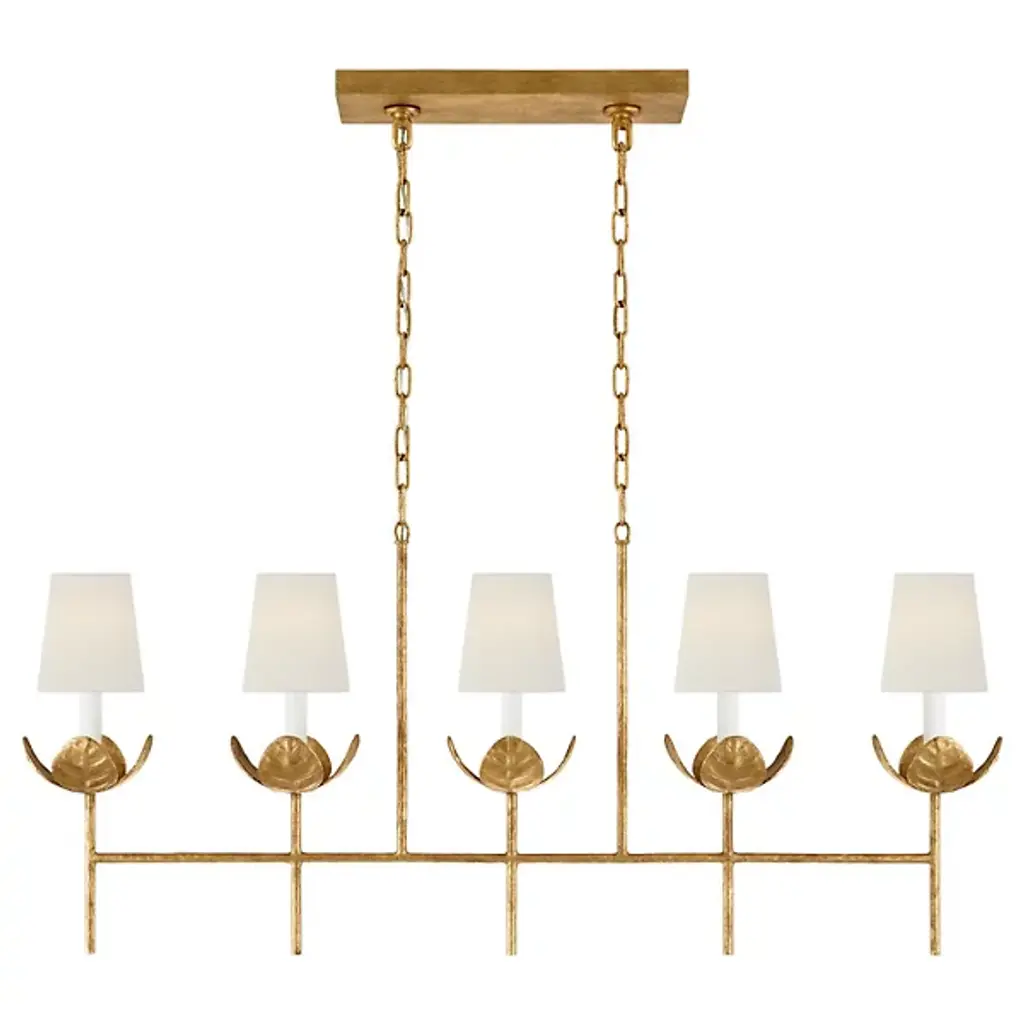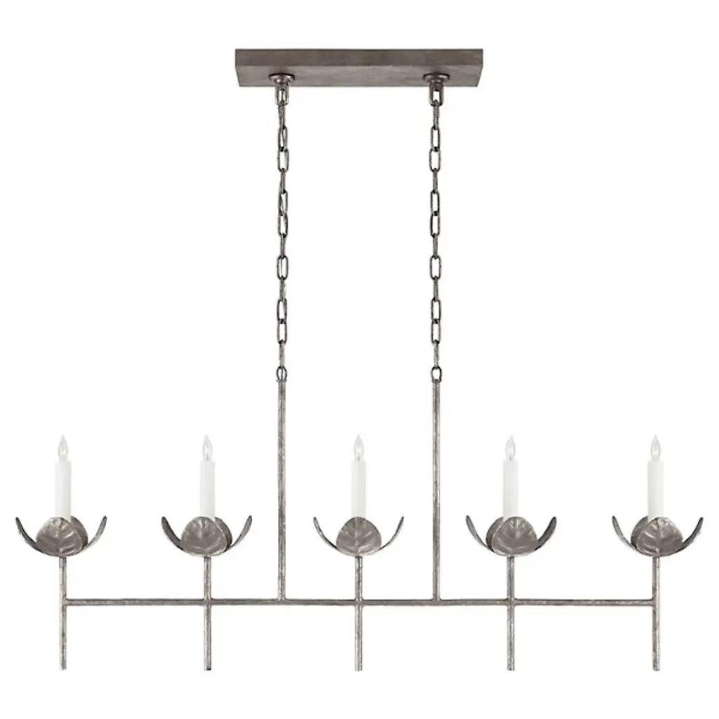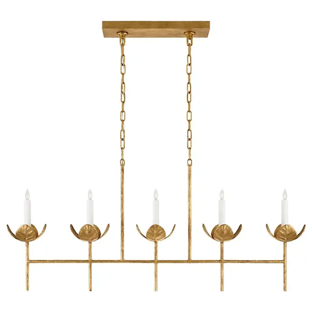 Designed by Julie Neill and presented by Visual Comfort Signature, formerly known as Visual Comfort, brand, the visually striking Illana Linear Suspension is a contemporary example of elevated artistry. Nature-inspired candelabra bases with leaf-like detailing are lined up evenly along the sturdy steel structure. It hangs from two chain links and anchors to the shared canopy above. This high-quality example of design will beautifully brighten interiors across the spectrum of work and play.