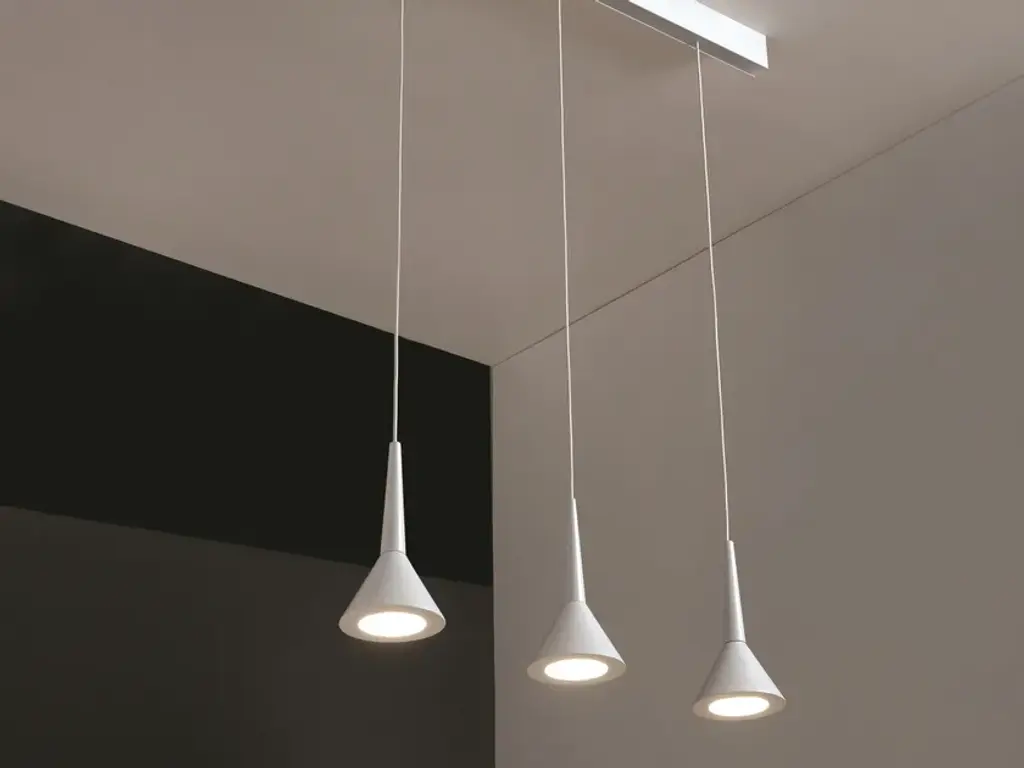 The IO SO 3L Linear Suspension by ITAMA is ideal for hanging over modern kitchen counters and dining room tables. The cone-shape of the fixture creates a downward directed glow. There are a variety of finishes and light options (not included) that create a textured look for any modern kitchen or dining room.