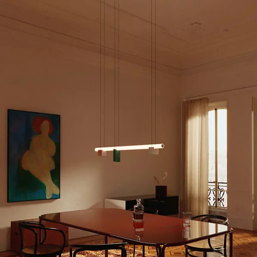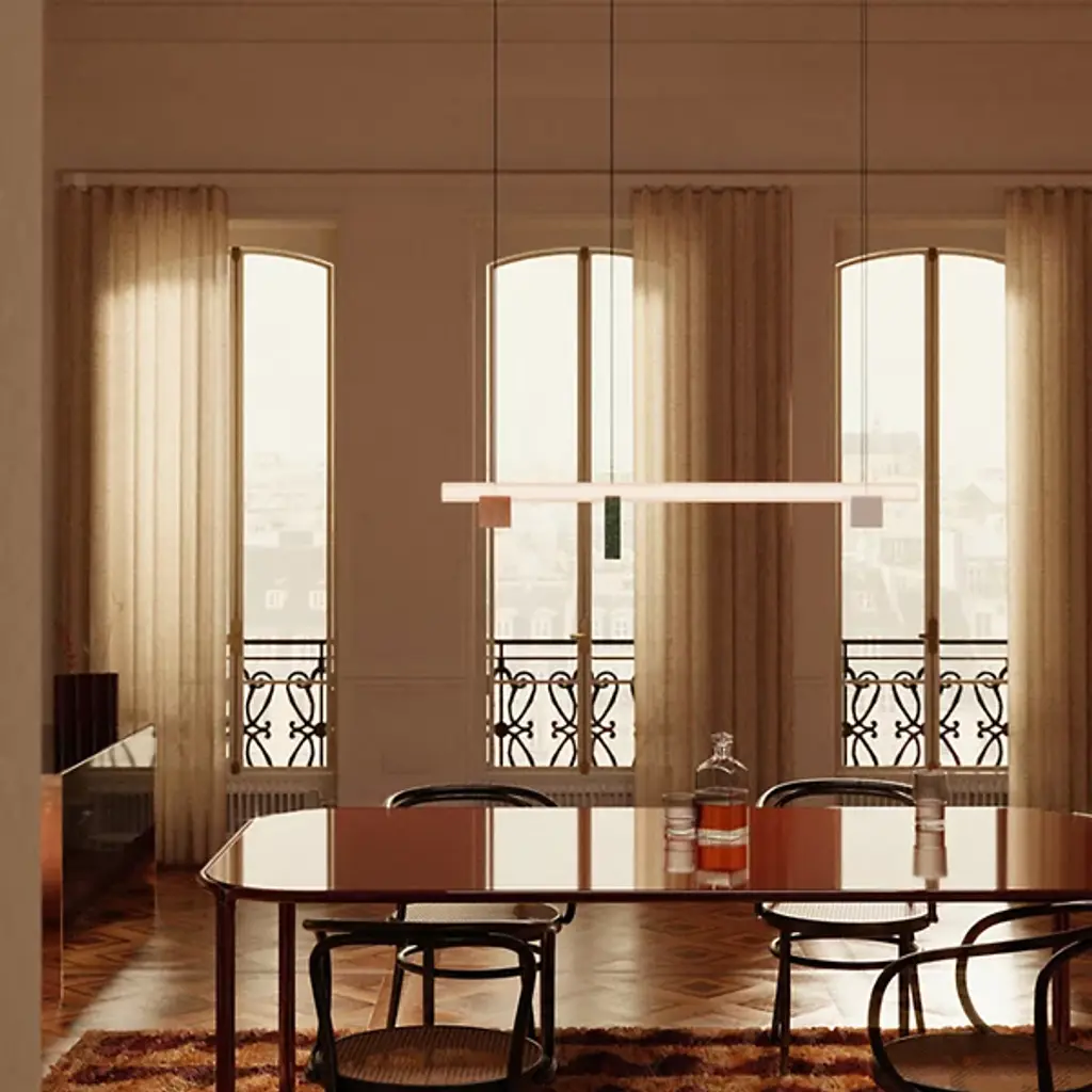 Make an ultra-modern design statement with the Isle 02 B LED Linear Suspension from Lambert & Fils. Your linear suspension is designed by Zoë Mowat, who showcases the beauty of precise geometry. Sturdy pedestals add an artistic touch while providing support for a frosted glass tube illuminated by an integrated LED, bringing illumination from above. Isle is designed with convenience in mind. Sloped-ceiling adaptability allows you to place this light fixture in various settings.