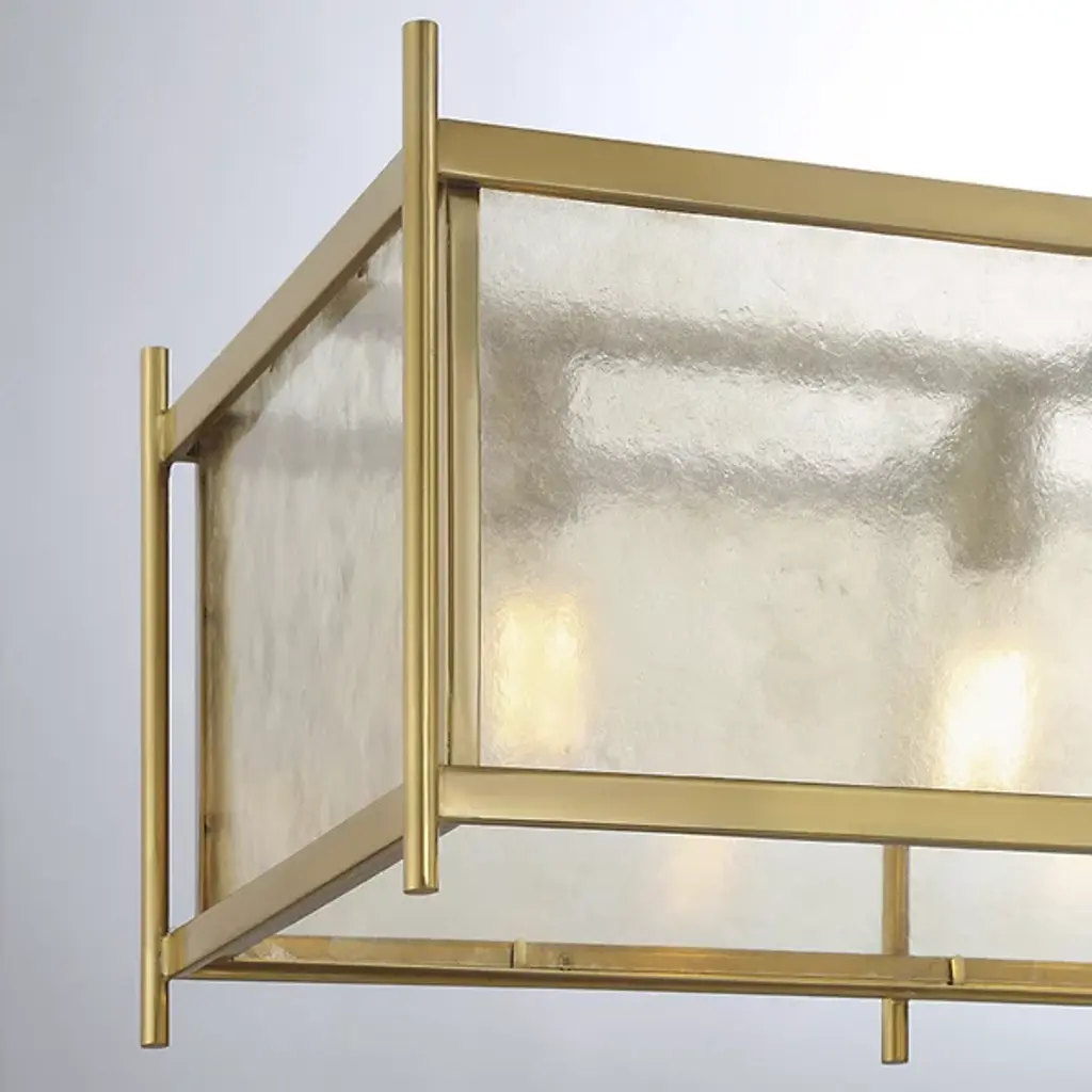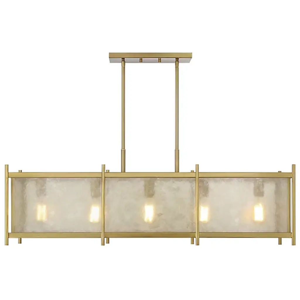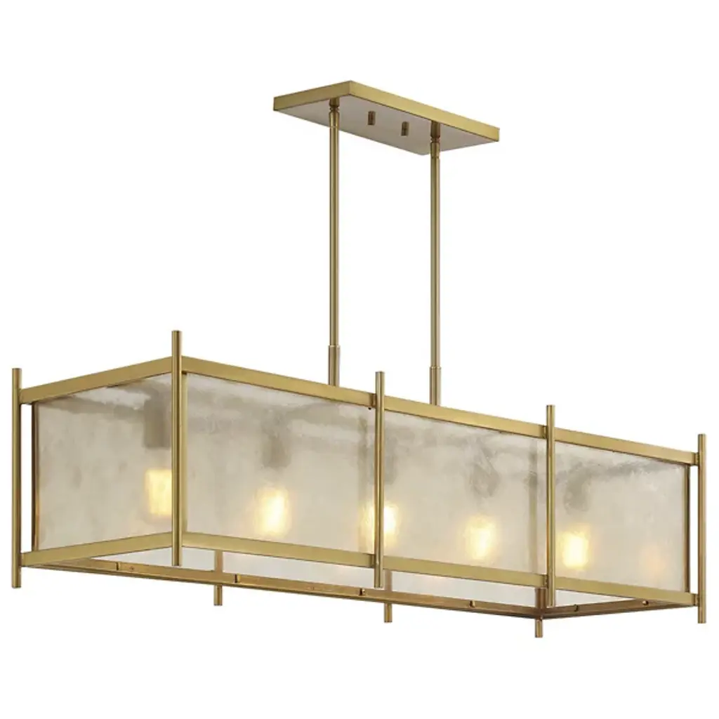 The Jacobs Linear Suspension from Savoy House is a floating gallery of light and shadow. It appears to be a magnificent bookshelf of illumination, each pane of clear mica a page from a luminous novel. This chandelier hovers above your space like a collection of golden hour sunbeams, trapped and tamed for your pleasure. Suspended over a long dining table, it becomes a conversation piece that whispers tales of glamour and timeless style to your guests.