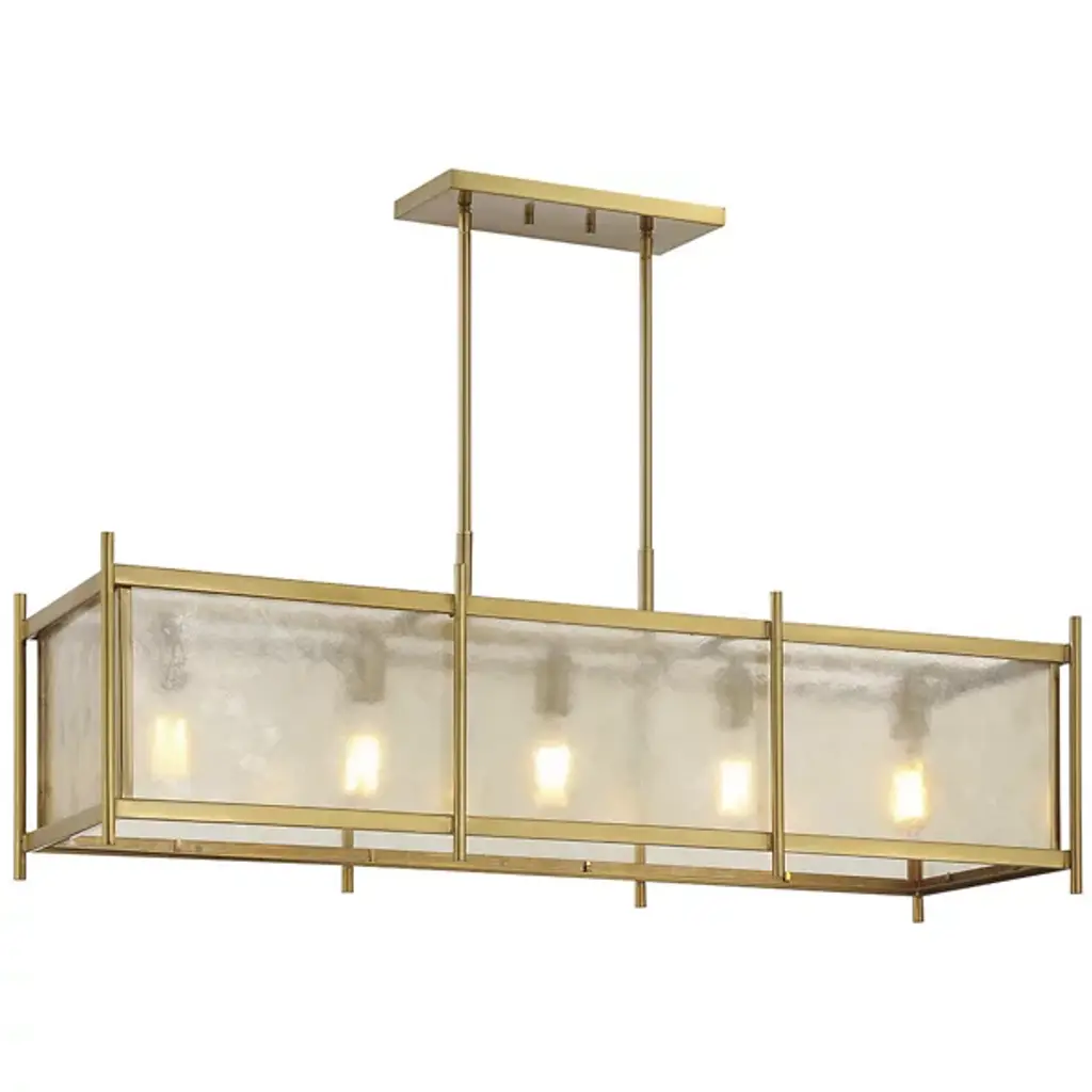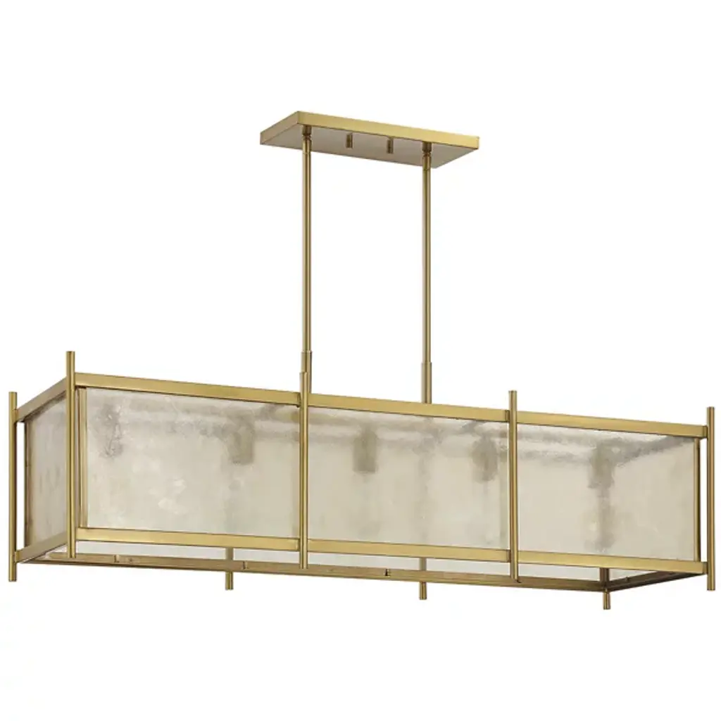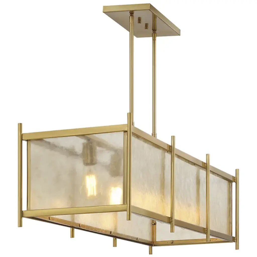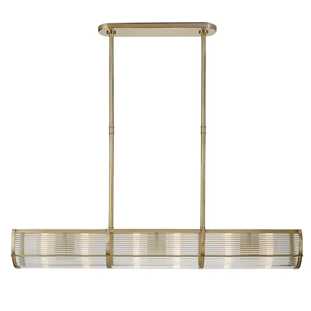 The Jacobs Linear Suspension from Savoy House is a floating gallery of light and shadow. It appears to be a magnificent bookshelf of illumination, each pane of clear mica a page from a luminous novel. This chandelier hovers above your space like a collection of golden hour sunbeams, trapped and tamed for your pleasure. Suspended over a long dining table, it becomes a conversation piece that whispers tales of glamour and timeless style to your guests.