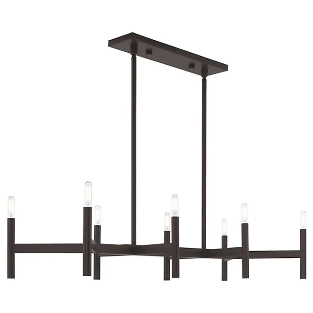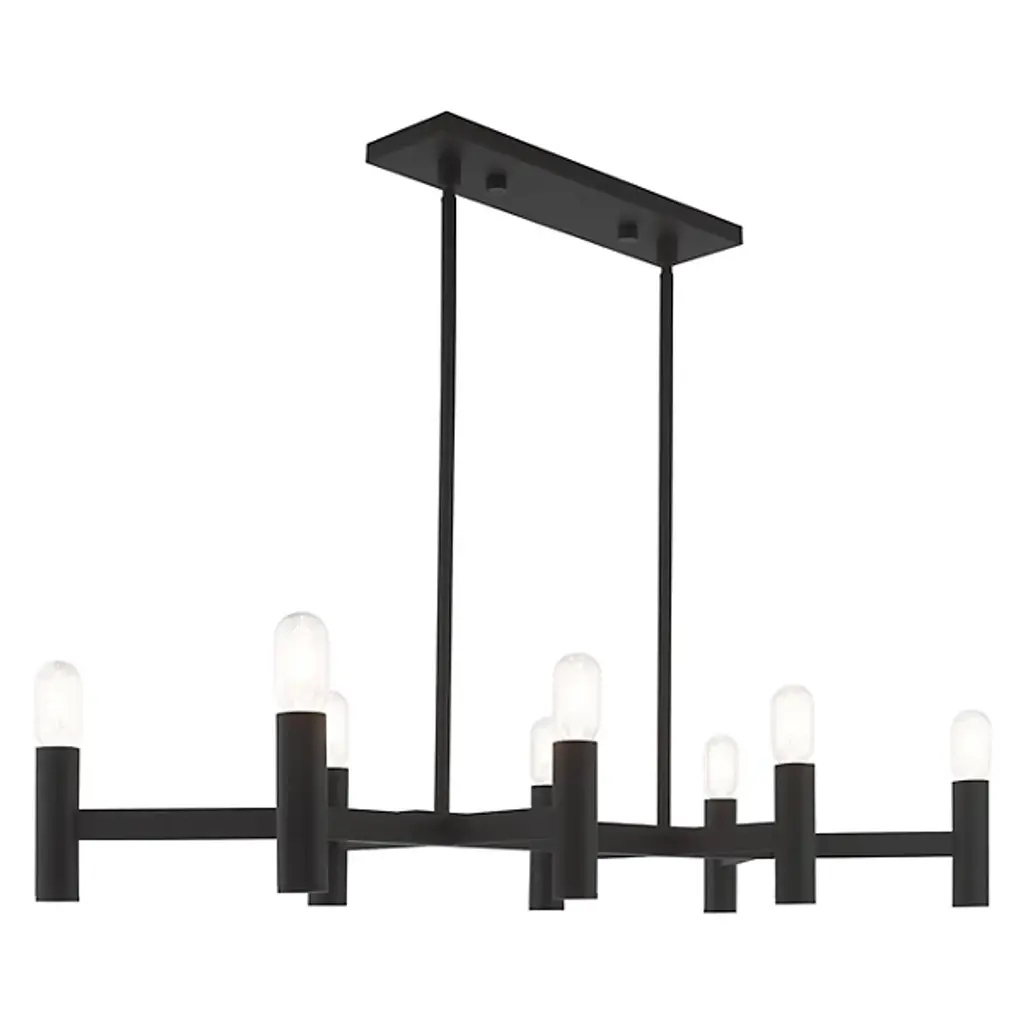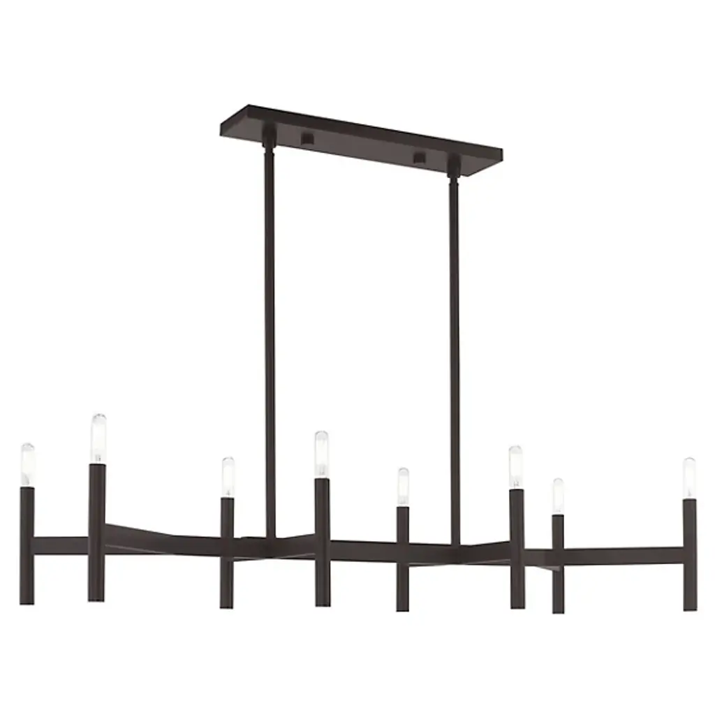 The Joanna Linear Suspension from Alder & Ore spans one’s table surfaces with a refined linear silhouette and a charming composition of exposed lighting. This piece pleases the modern or contemporary space as it features the refined visuals of Scandinavian design. It follows the length of the dining table or kitchen island with a wide metal framework. Sleek arms shoot out from the framework in dynamic angles, creating a network-like silhouette. Elegant in their minimalist design, candle-style holders wrap the piece with a familiar note. Candelabra bulbs dot the piece with shimmering details. The collection of bulbs together produces a generous spread of illumination.