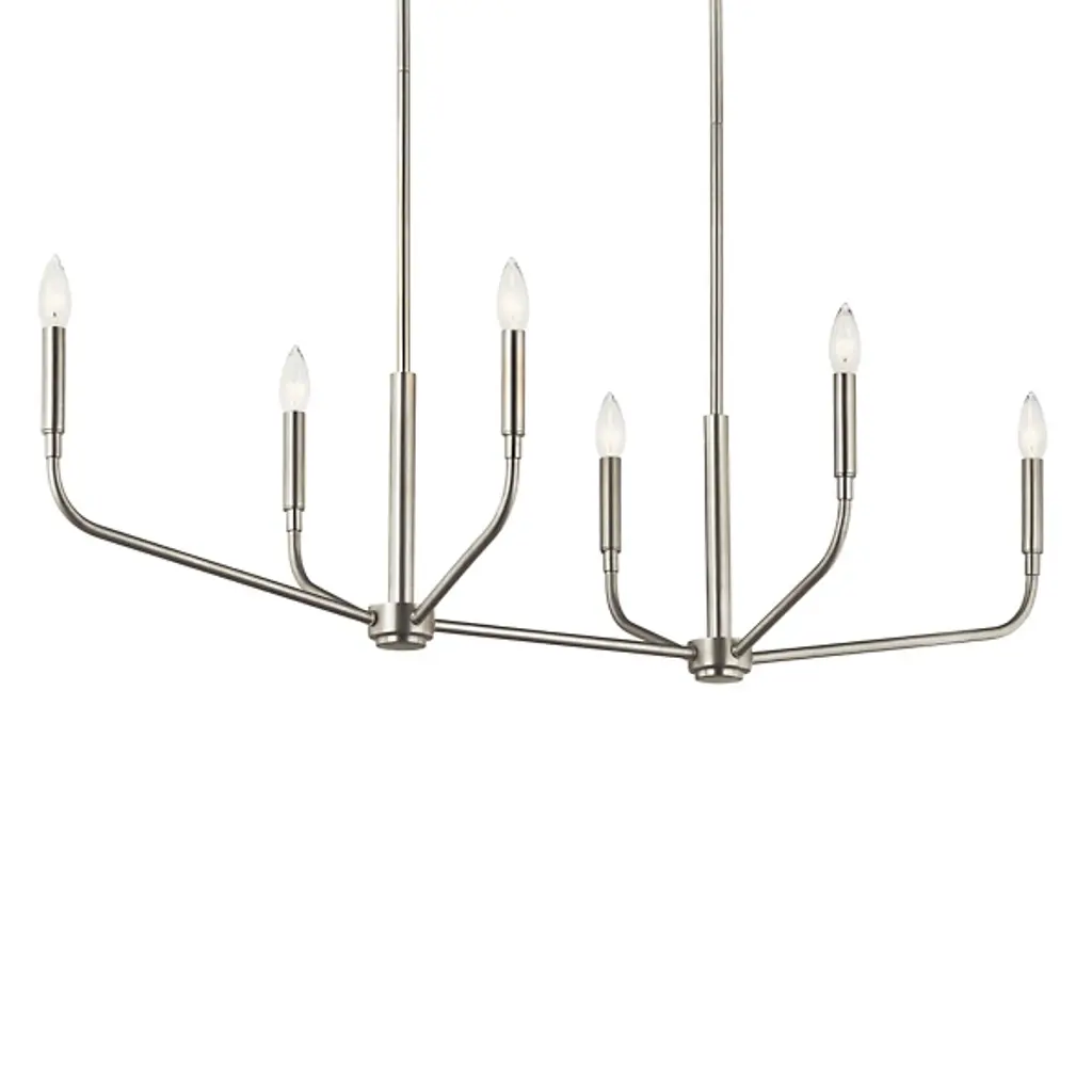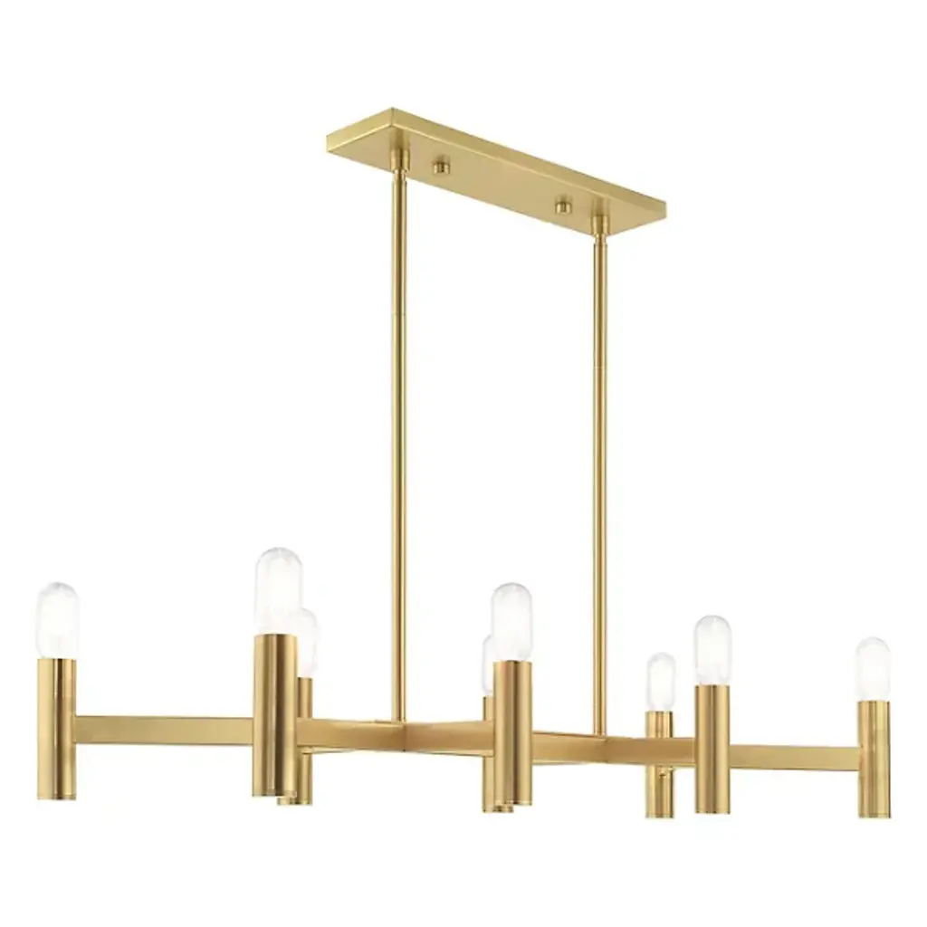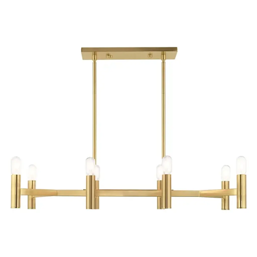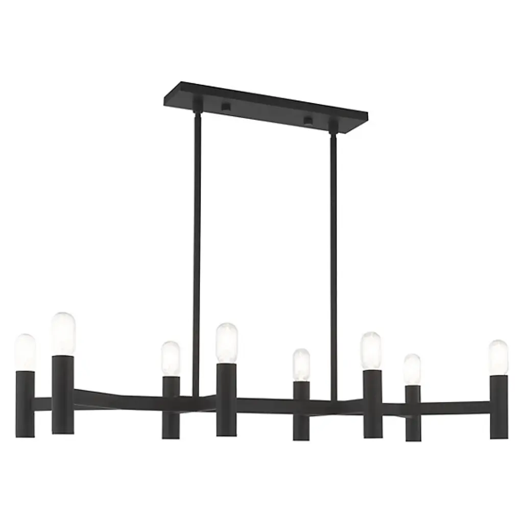 The Joanna Linear Suspension from Alder & Ore spans one’s table surfaces with a refined linear silhouette and a charming composition of exposed lighting. This piece pleases the modern or contemporary space as it features the refined visuals of Scandinavian design. It follows the length of the dining table or kitchen island with a wide metal framework. Sleek arms shoot out from the framework in dynamic angles, creating a network-like silhouette. Elegant in their minimalist design, candle-style holders wrap the piece with a familiar note. Candelabra bulbs dot the piece with shimmering details. The collection of bulbs together produces a generous spread of illumination.