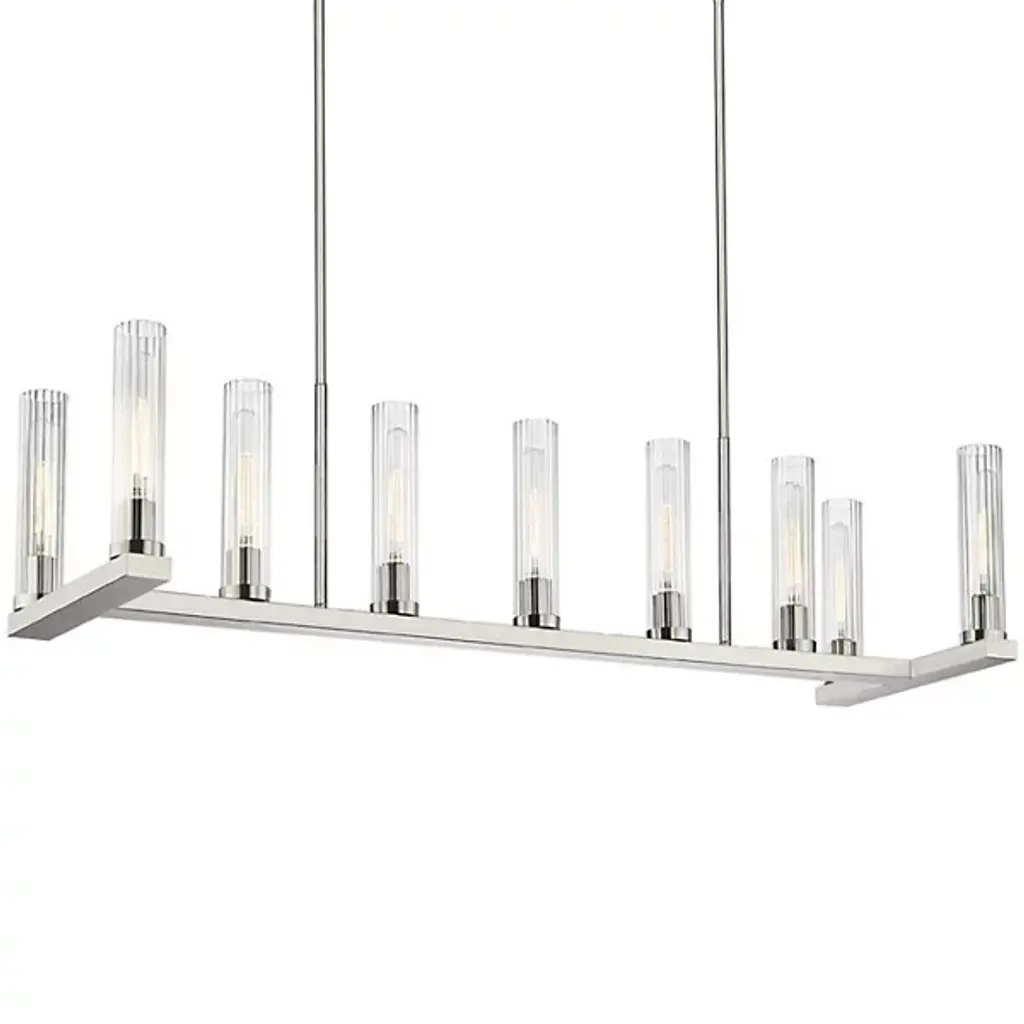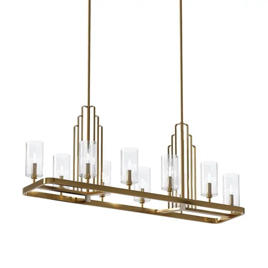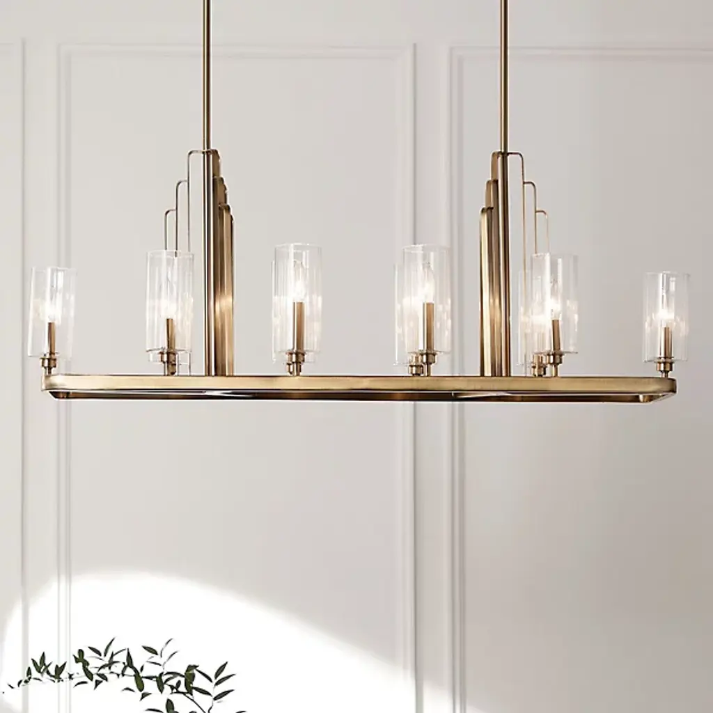 Elevate your interiors with the elegant Art Deco lines of the Kimrose Linear Suspension from Kichler. Suspended from above via a sleek rectangular ceiling mount, it uses two parallel downrods with softly stepped metal accents to suspend a larger, similarly round-cornered structure below, extending up a series of candelabra style lamps. Each socket is surrounded by a single cylinder of clear fluted glass that sweeps up around the lamping, blunting bright glare into an elegant, wide-reaching glow.