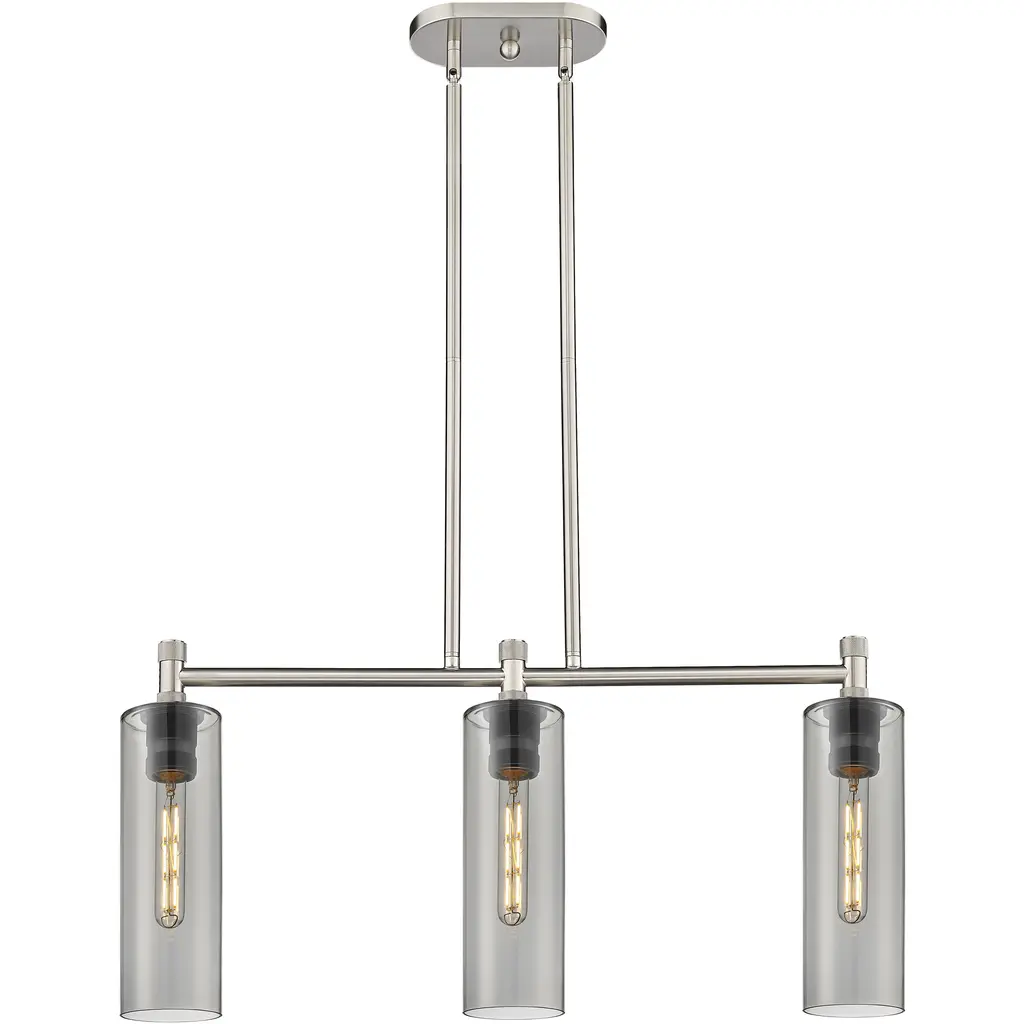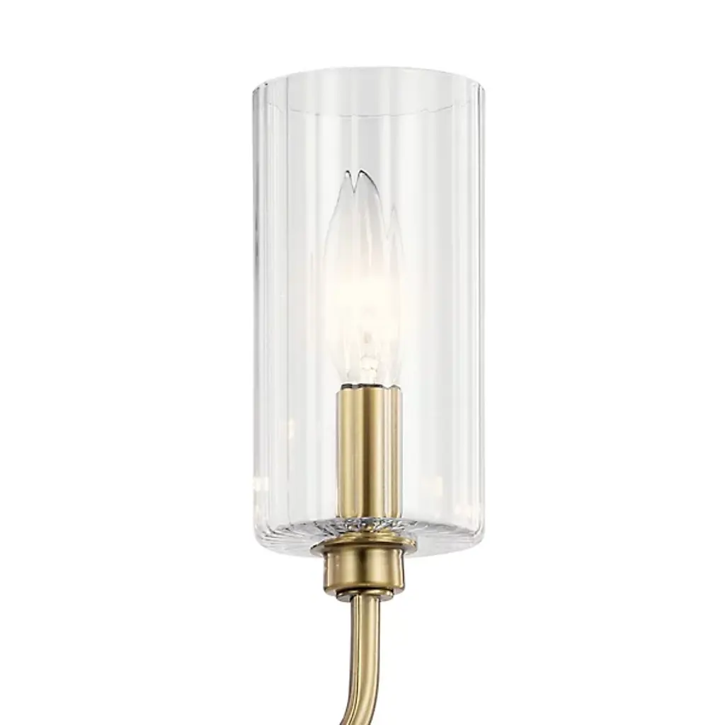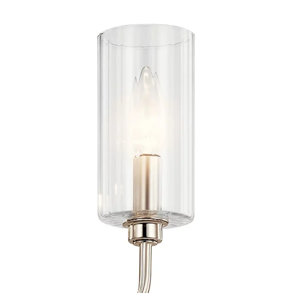Elevate your interiors with the elegant Art Deco lines of the Kimrose Linear Suspension from Kichler. Suspended from above via a sleek rectangular ceiling mount, it uses two parallel downrods with softly stepped metal accents to suspend a larger, similarly round-cornered structure below, extending up a series of candelabra style lamps. Each socket is surrounded by a single cylinder of clear fluted glass that sweeps up around the lamping, blunting bright glare into an elegant, wide-reaching glow.