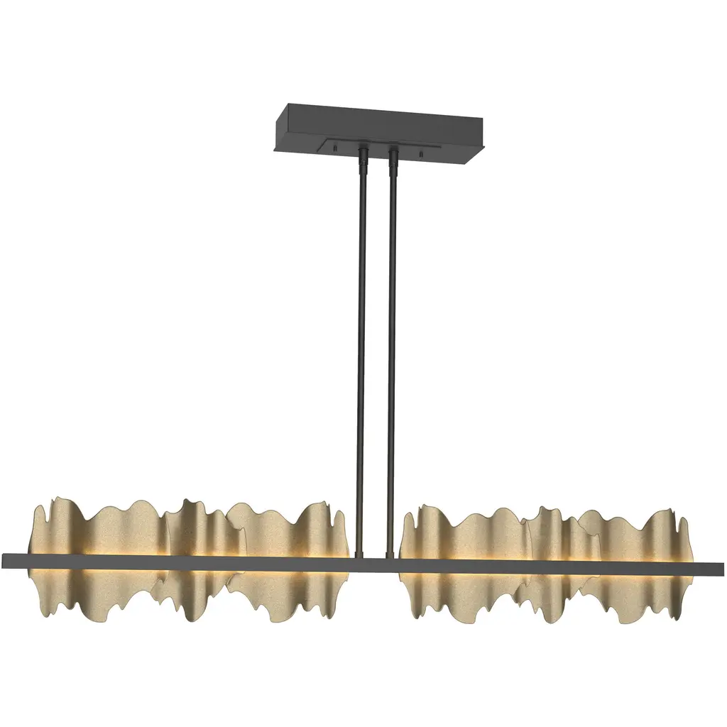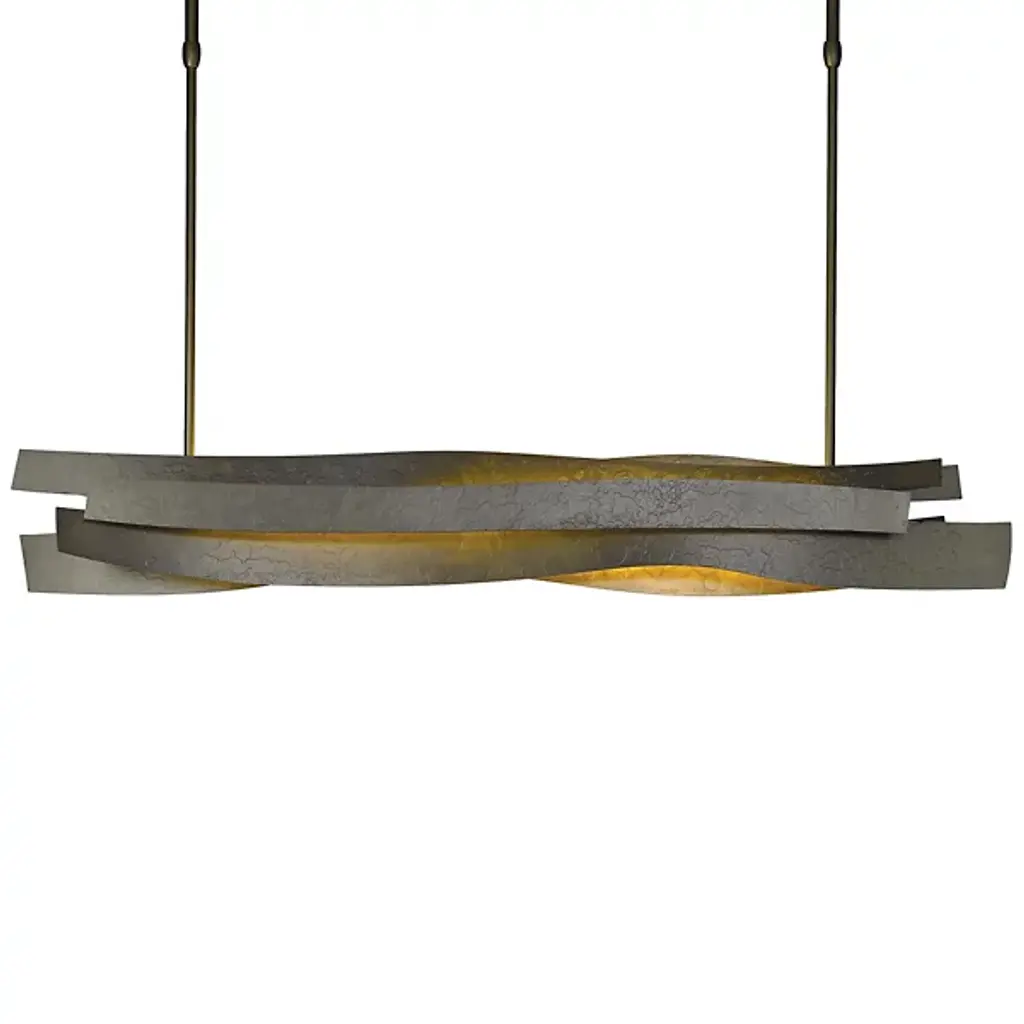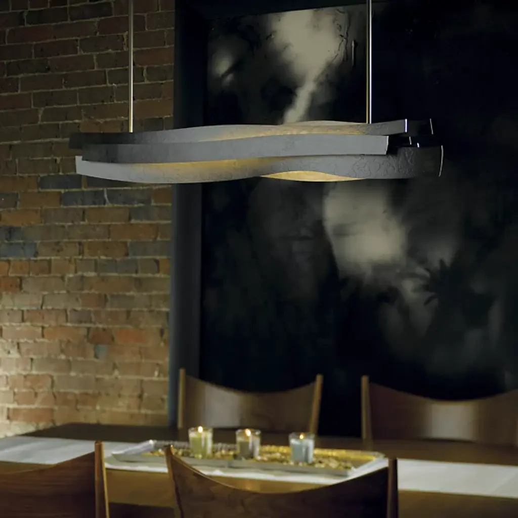 Meant to invoke thoughts of a pleasant scene of rolling hills, the Hubbardton Forge Landscape LED Linear Suspension features undulating steel planes surrounding a horizontal plate. A row of LEDs on the horizontal guide plate create a wash of up and down light, creating enough light for a dining or living space.