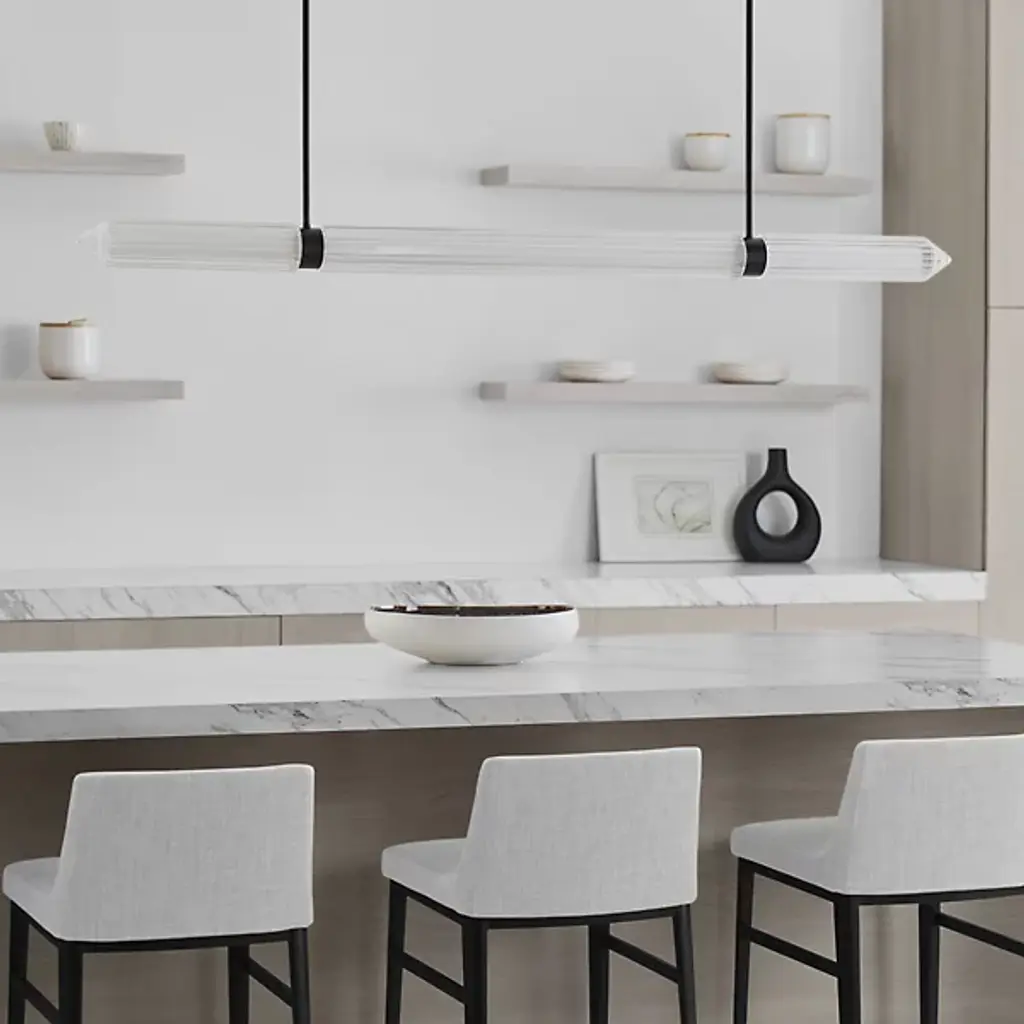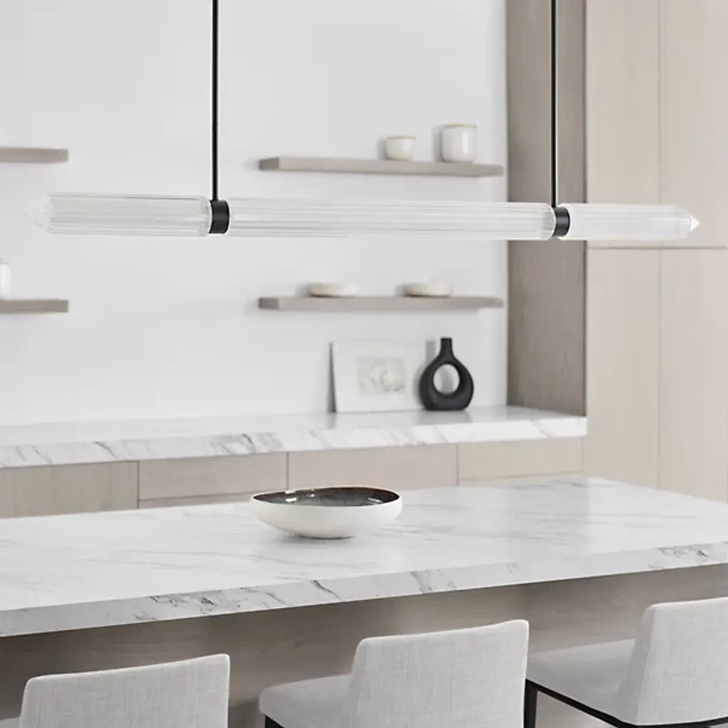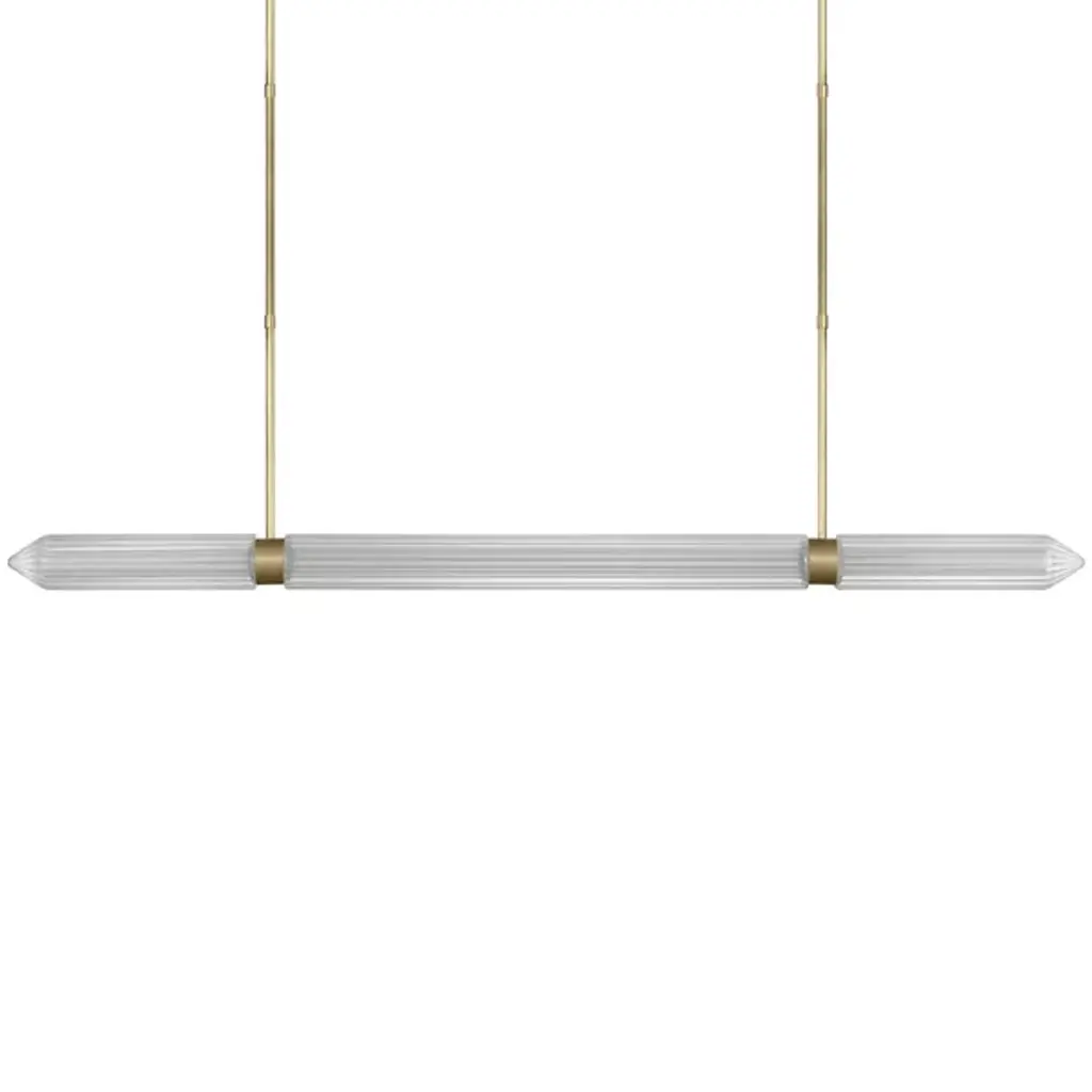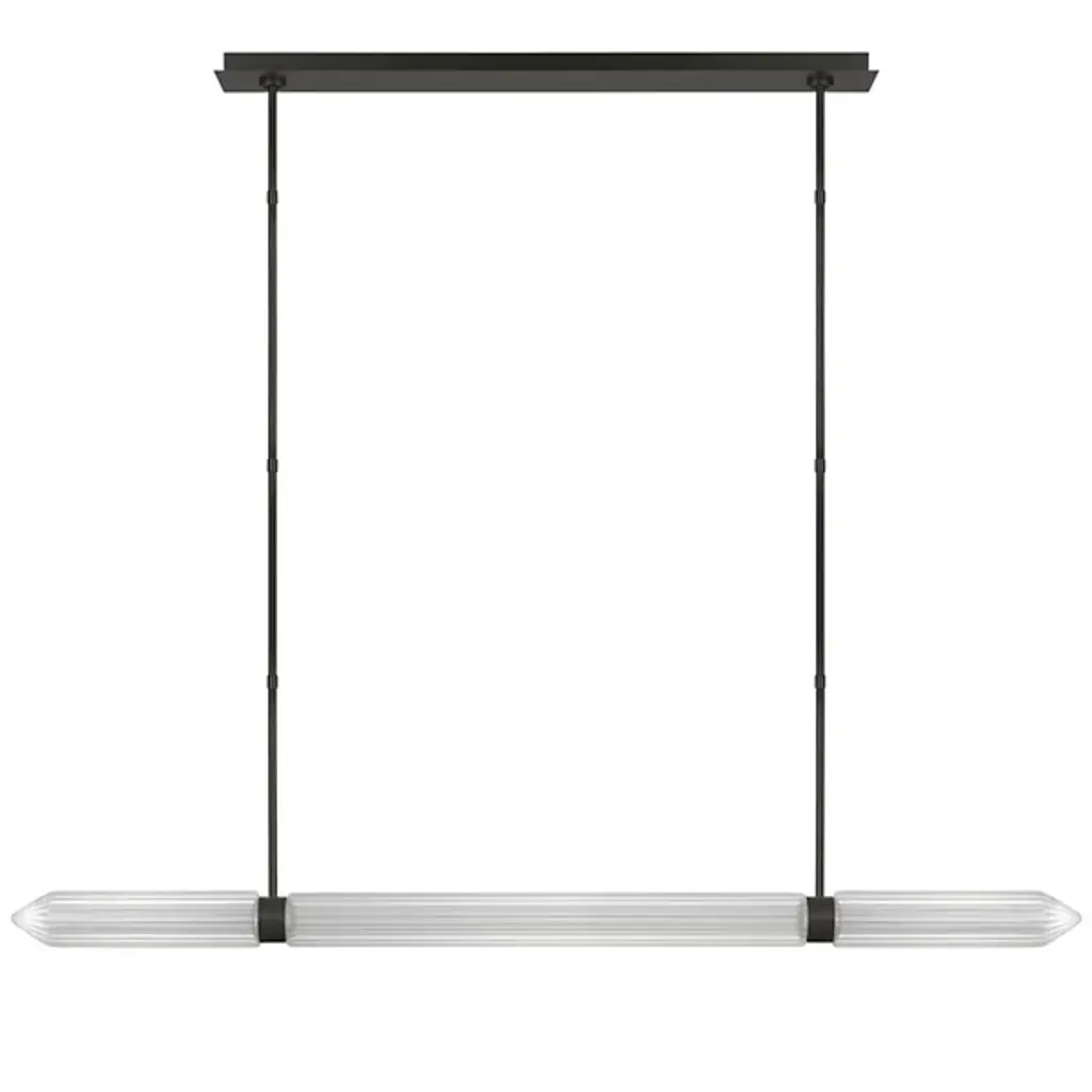 The Langston LED Linear Suspension by Visual Comfort Modern combines elegant crystal forms with an organic, nature-inspired assembly. Designed by AvroKO, crafted from steel with crystal shades, this damp-listed chandelier seamlessly blends mid-century modern and contemporary styles, offering a timeless addition to any space. Minimalist structural details highlight a tubular glass shade, softly pointed at each end, internally illuminated in layers. A bold armature descends from a stepped rectangular canopy, supporting a contoured crystal shade with metal collars. The fixture exudes confidence, expressing its distinct character through decorative warmth cast by integrated LED lamping inside the shade, casting a sophisticated glow.