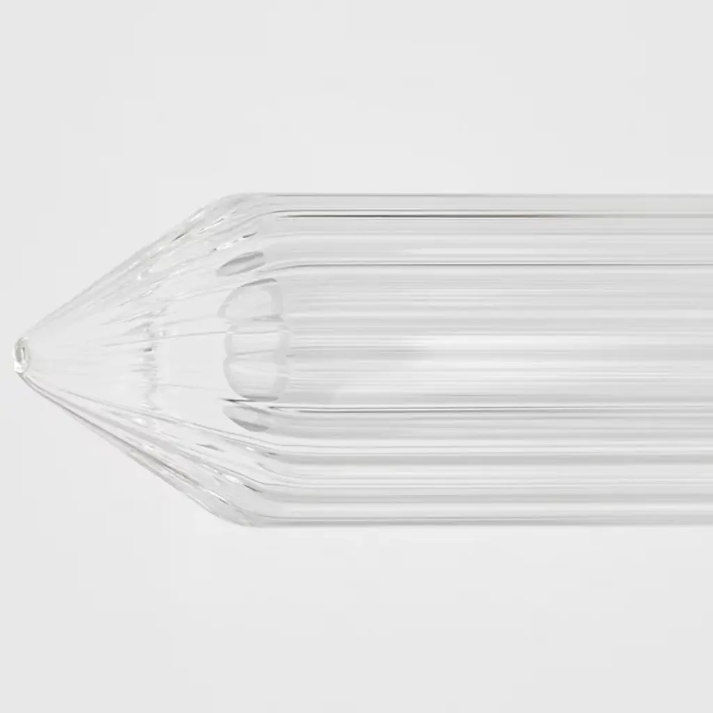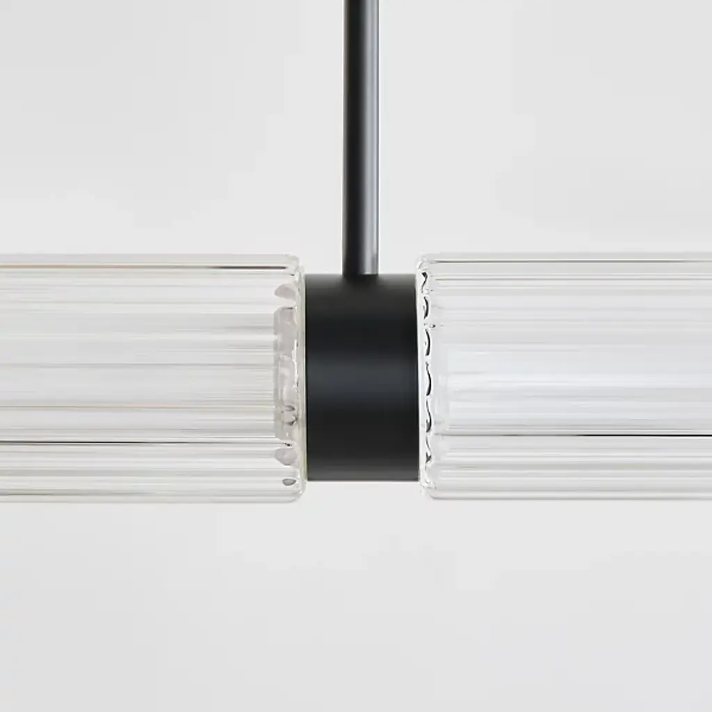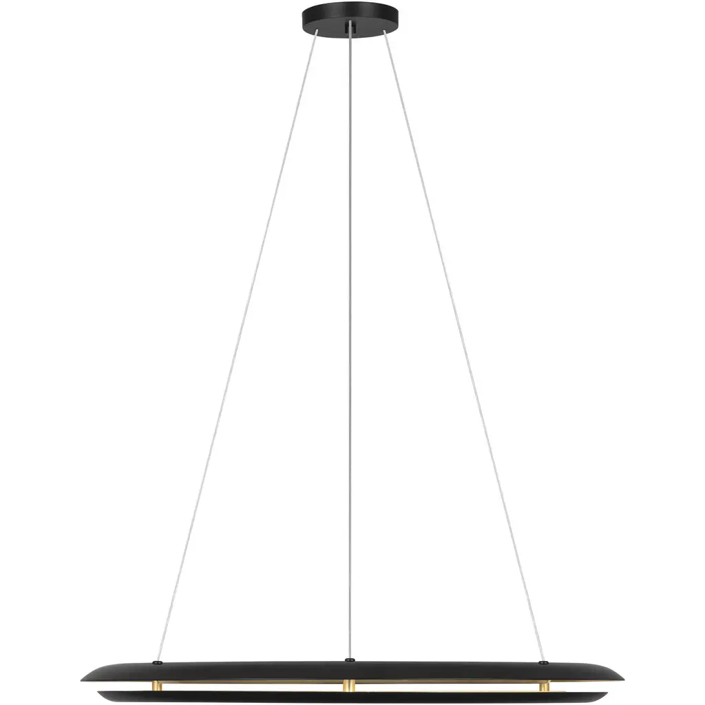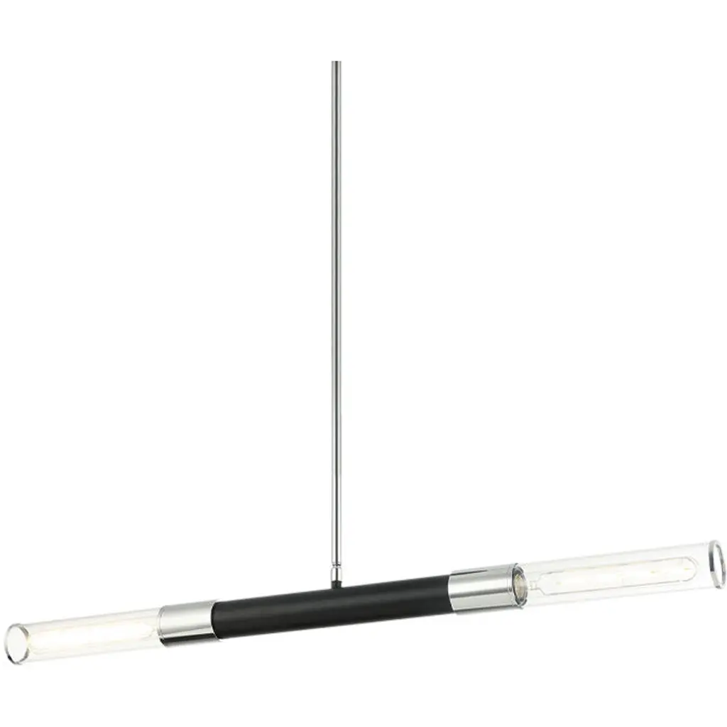 The Langston LED Linear Suspension by Visual Comfort Modern combines elegant crystal forms with an organic, nature-inspired assembly. Designed by AvroKO, crafted from steel with crystal shades, this damp-listed chandelier seamlessly blends mid-century modern and contemporary styles, offering a timeless addition to any space. Minimalist structural details highlight a tubular glass shade, softly pointed at each end, internally illuminated in layers. A bold armature descends from a stepped rectangular canopy, supporting a contoured crystal shade with metal collars. The fixture exudes confidence, expressing its distinct character through decorative warmth cast by integrated LED lamping inside the shade, casting a sophisticated glow.