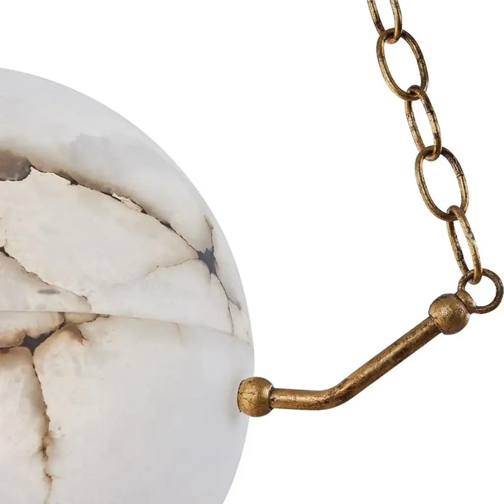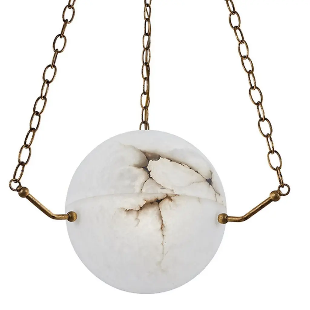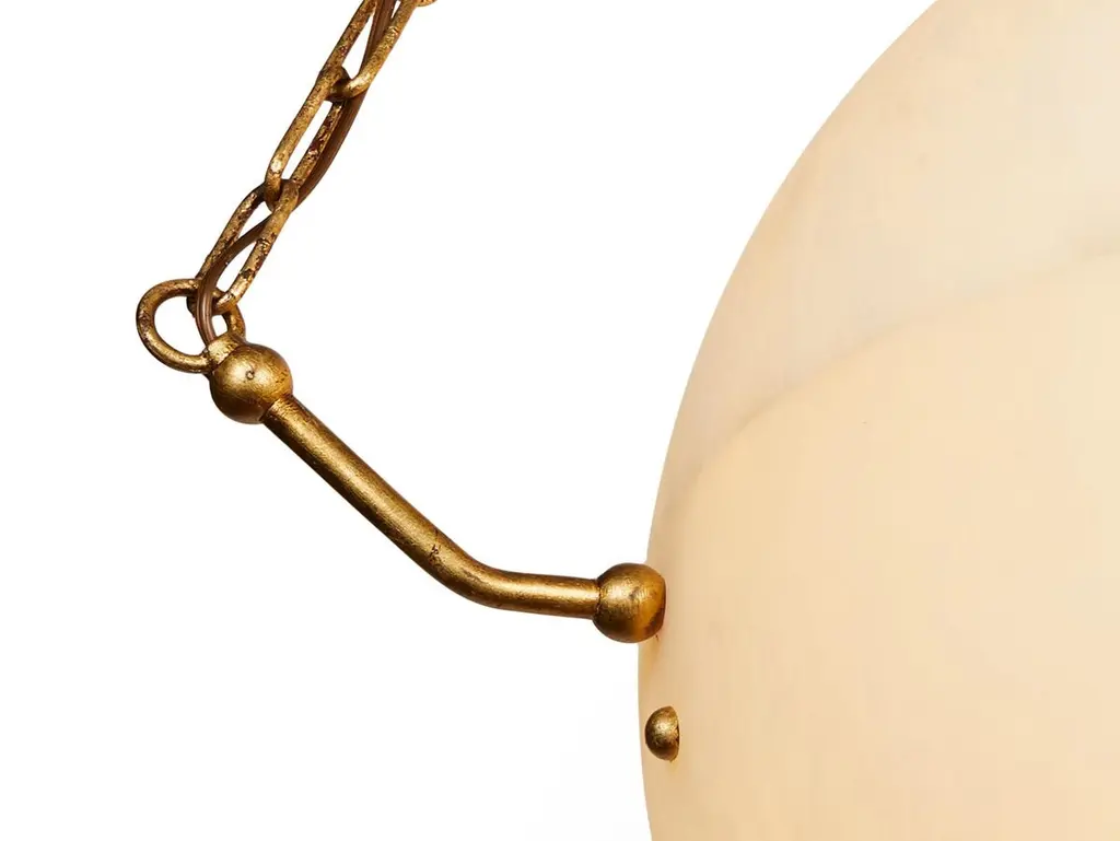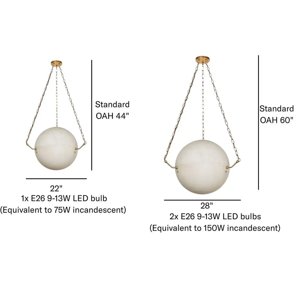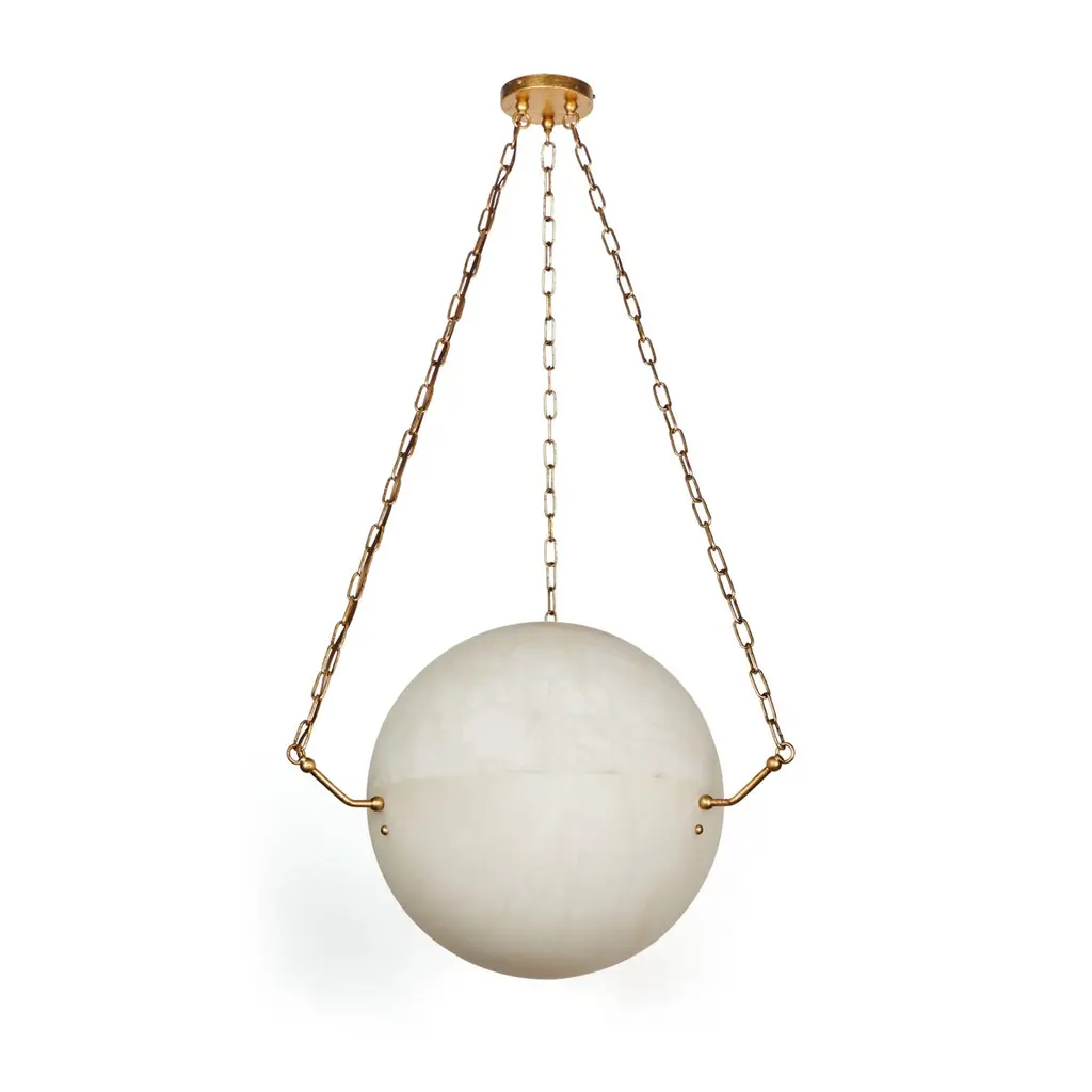 Large 'Atlas' Alabaster Suspension Lamp by Denis de la MesiereHandcrafted in Los Angeles in the workshop of noted French designer and antiques dealer Denis de le Mesiere, who meticulously pays homage to the work of Pierre Chareau with scrupulous attention to detail and materials.Executed in the highest quality European alabaster sphere mounted on metal chain in choice of a number of metal finishes, this ultra refined design adds a dramatic sculptural element and focal point of incomparable beauty. Available in 2 sizes. Accommodates 2x standard medium base e26 dimmable 13W LED bulbs with a maximum 13W (equivalent to 75W incandescent bulbs). LED only. Compatible for hardwiring with US electrical junction boxes. UL listed.Standard 60" drop can be lengthened or shortened upon request for additional fee. Comes standard in polished brass as shown. Customizable to any RAL K5 classic color as well as bronze, nickel or gold leaf finishes for an additional fee.Price is per item. Available in unlimited quantities. In-stock lead time 7-8 weeks. Out of stock up to 8 weeks or more. Inventory availability subject to change at any time. For time sensitive order, please contact us prior to ordering.Note that alabaster will vary from item to item due to the organic nature of the material. Handmade to order. All sales are final.