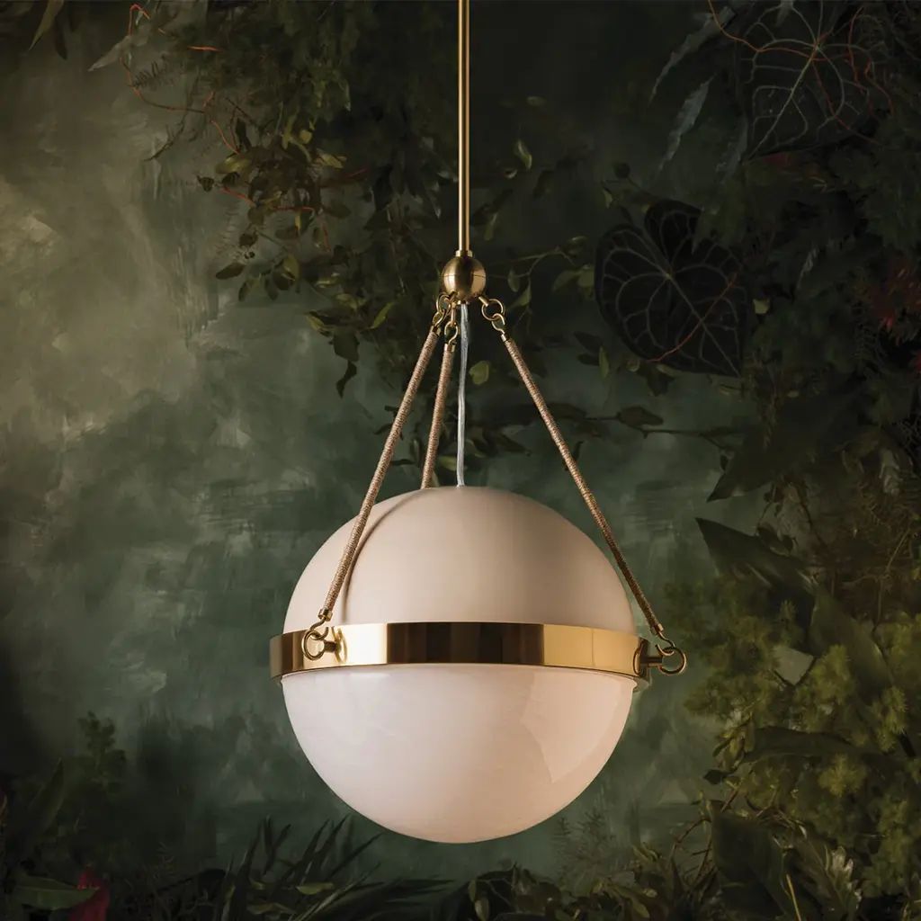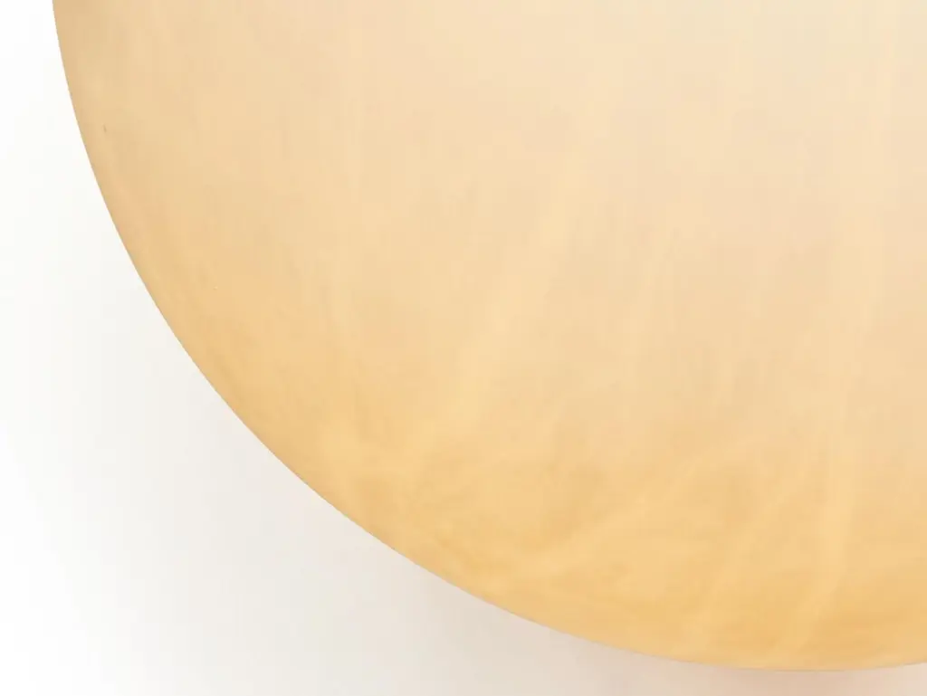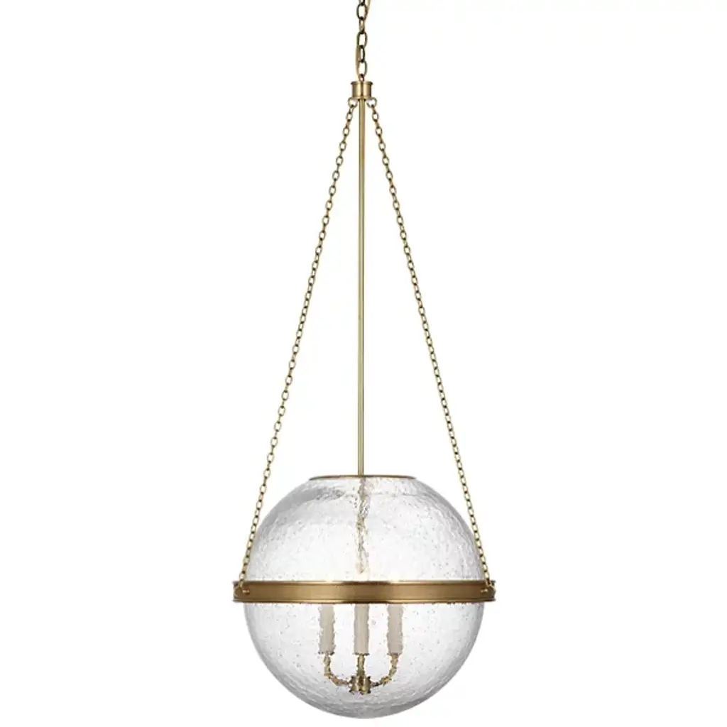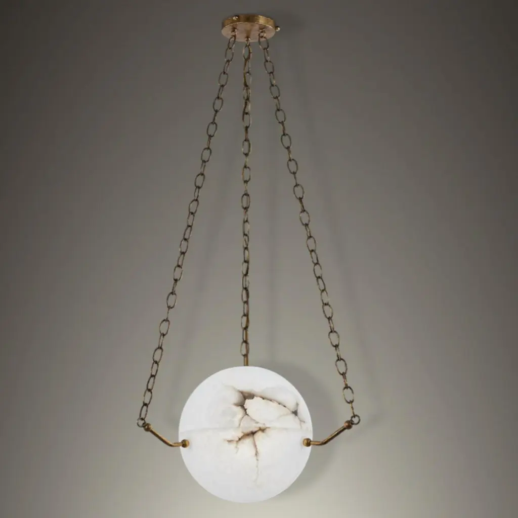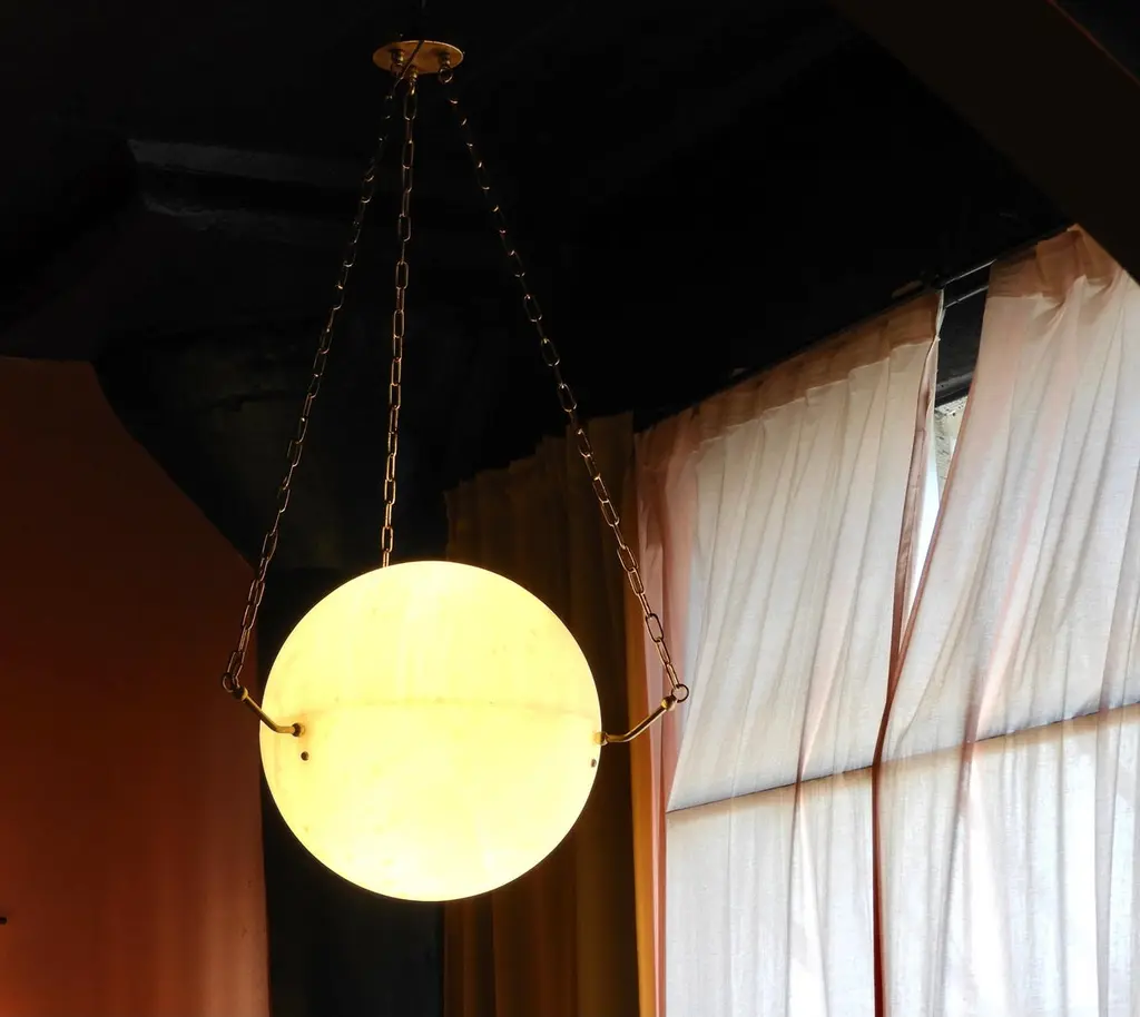 Large 'Atlas' Alabaster Suspension Lamp by Denis de la MesiereHandcrafted in Los Angeles in the workshop of noted French designer and antiques dealer Denis de le Mesiere, who meticulously pays homage to the work of Pierre Chareau with scrupulous attention to detail and materials.Executed in the highest quality European alabaster sphere mounted on metal chain in choice of a number of metal finishes, this ultra refined design adds a dramatic sculptural element and focal point of incomparable beauty. Available in 2 sizes. Accommodates 2x standard medium base e26 dimmable 13W LED bulbs with a maximum 13W (equivalent to 75W incandescent bulbs). LED only. Compatible for hardwiring with US electrical junction boxes. UL listed.Standard 60" drop can be lengthened or shortened upon request for additional fee. Comes standard in polished brass as shown. Customizable to any RAL K5 classic color as well as bronze, nickel or gold leaf finishes for an additional fee.Price is per item. Available in unlimited quantities. In-stock lead time 7-8 weeks. Out of stock up to 8 weeks or more. Inventory availability subject to change at any time. For time sensitive order, please contact us prior to ordering.Note that alabaster will vary from item to item due to the organic nature of the material. Handmade to order. All sales are final.