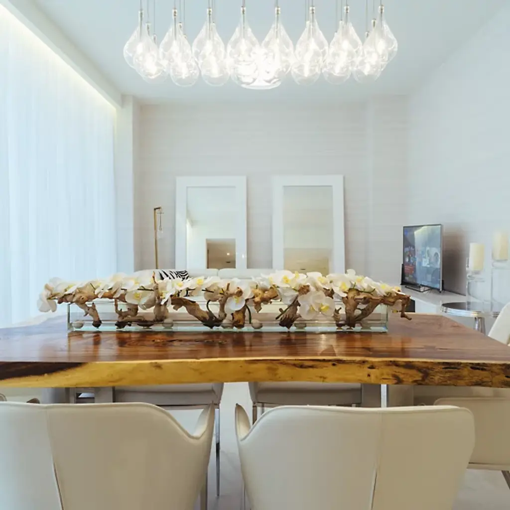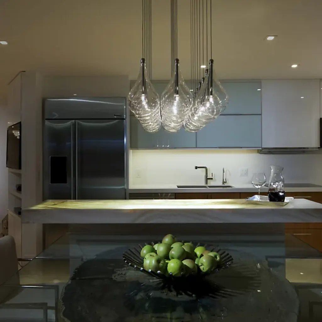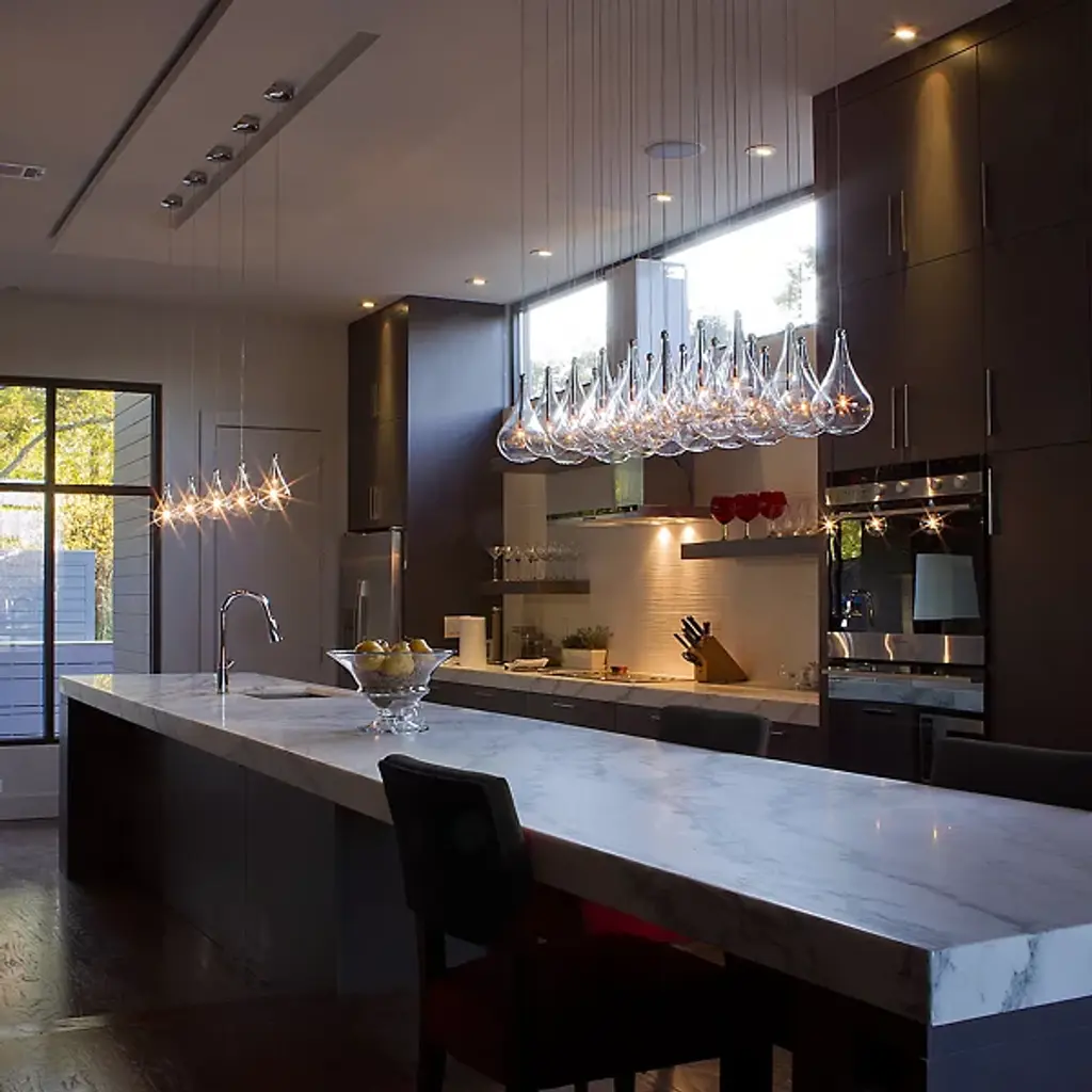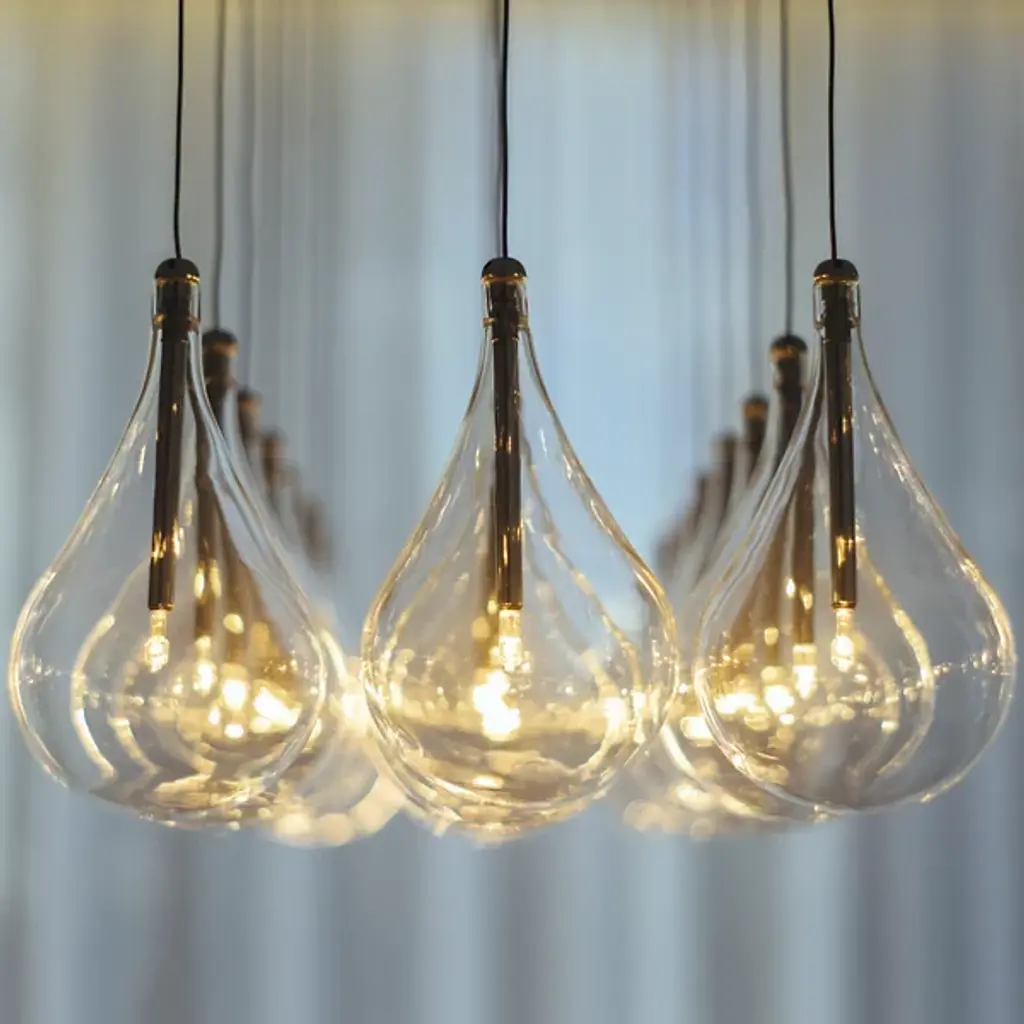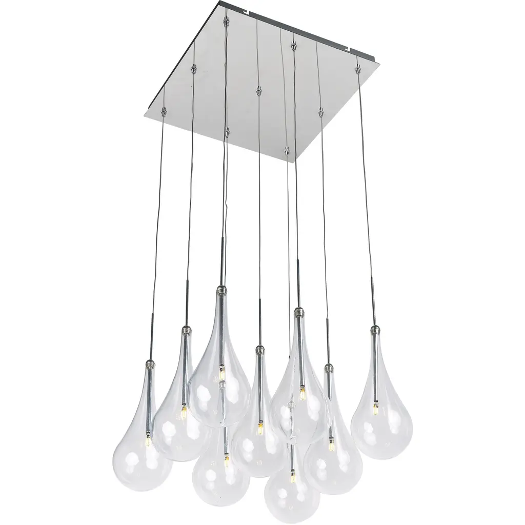 Hanging like droplets of glass, the ET2 Lighting Larmes 24-Light LED Linear Suspension is a forward thinking and contemporary fixture. 24 glass pendants hang from a metallic rectangular canopy, suspended with thin wire. Each glass bubble contains its own LED light source, having an impressive amount of light output.