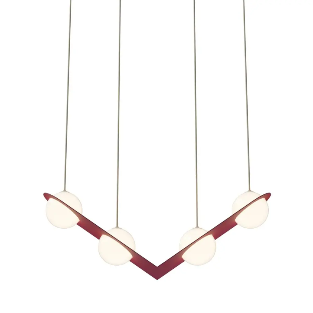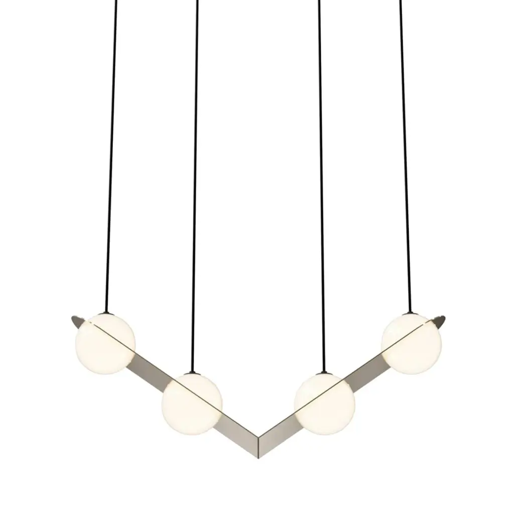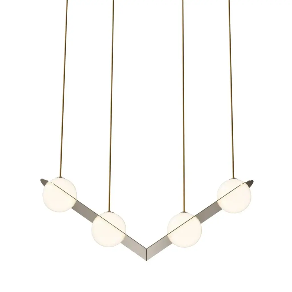 Laurent 02 follows Lambert & Fils collection's geometric template with its 4 handblown opaline globes "sliced" by a classic V-shaped metal structure. Offering an ambient LED glow via the milky glass forms, the suspension light is available in an curated choice of finishes in polished brass, nickel-plate or varied colors of powder-coated aluminum. With a choice of angled- or parallel-mount models, the striking fixture is handmade at the brand's Montreal atelier.