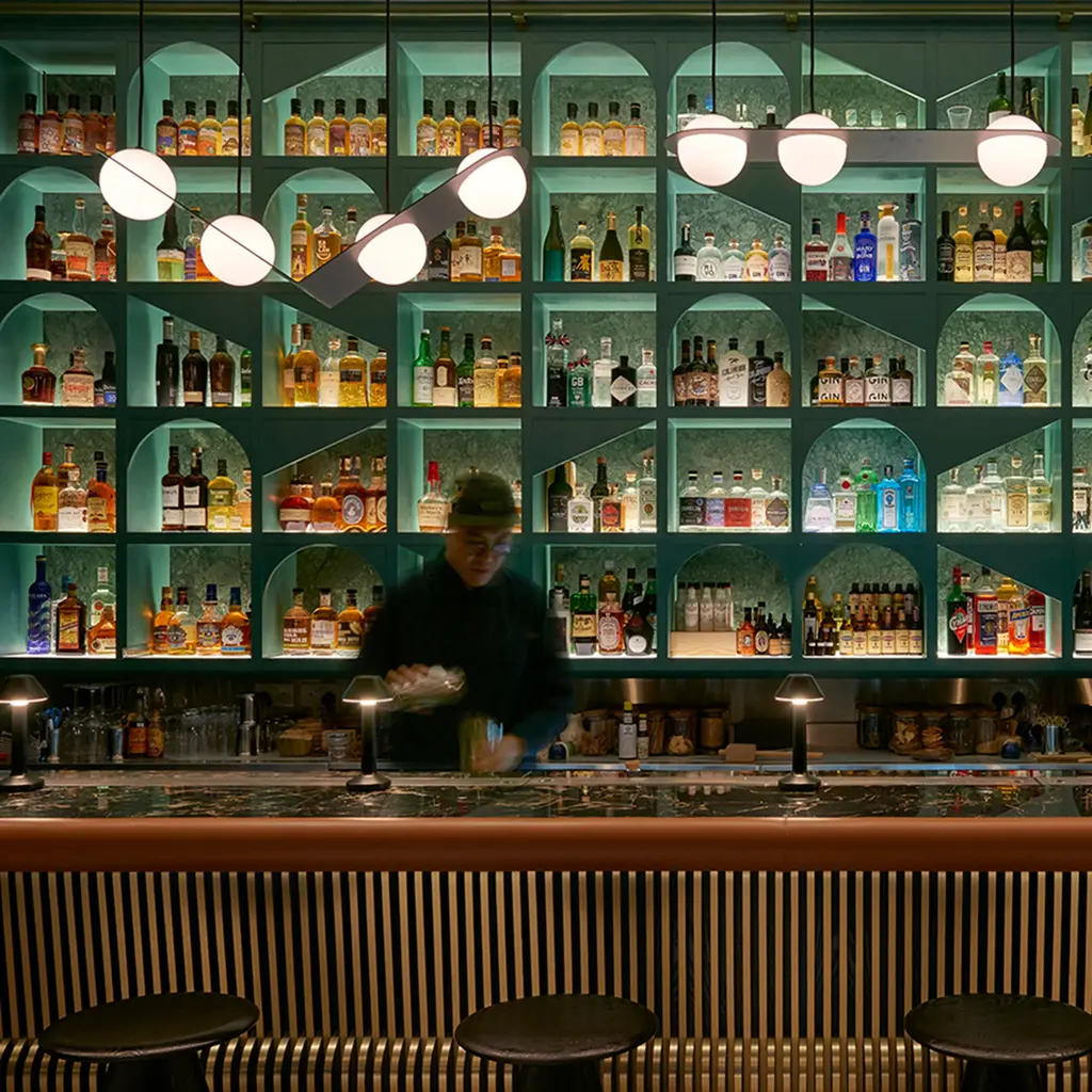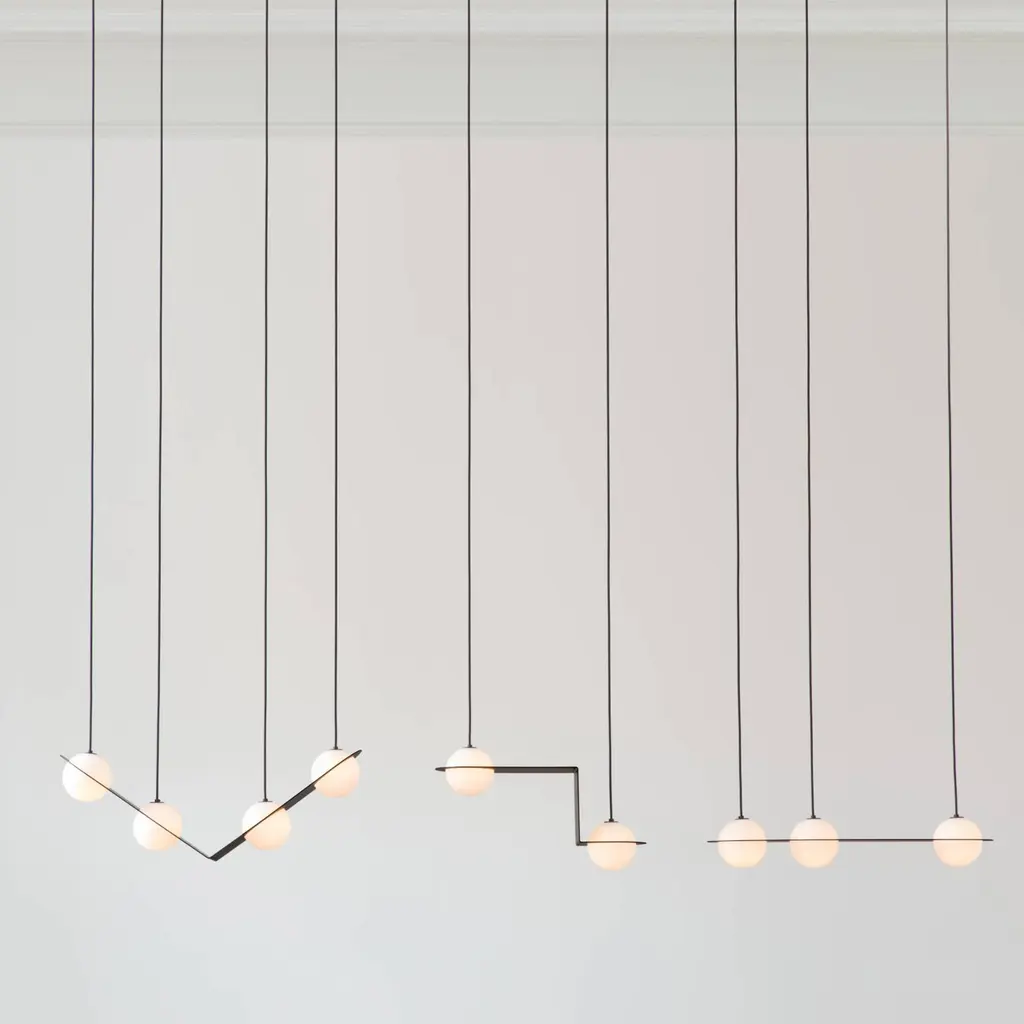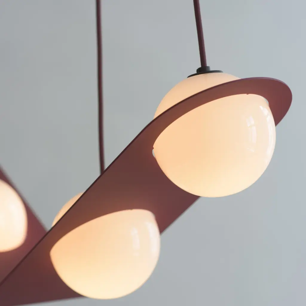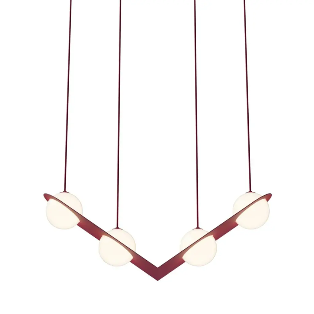 Laurent 02 follows Lambert & Fils collection's geometric template with its 4 handblown opaline globes "sliced" by a classic V-shaped metal structure. Offering an ambient LED glow via the milky glass forms, the suspension light is available in an curated choice of finishes in polished brass, nickel-plate or varied colors of powder-coated aluminum. With a choice of angled- or parallel-mount models, the striking fixture is handmade at the brand's Montreal atelier.