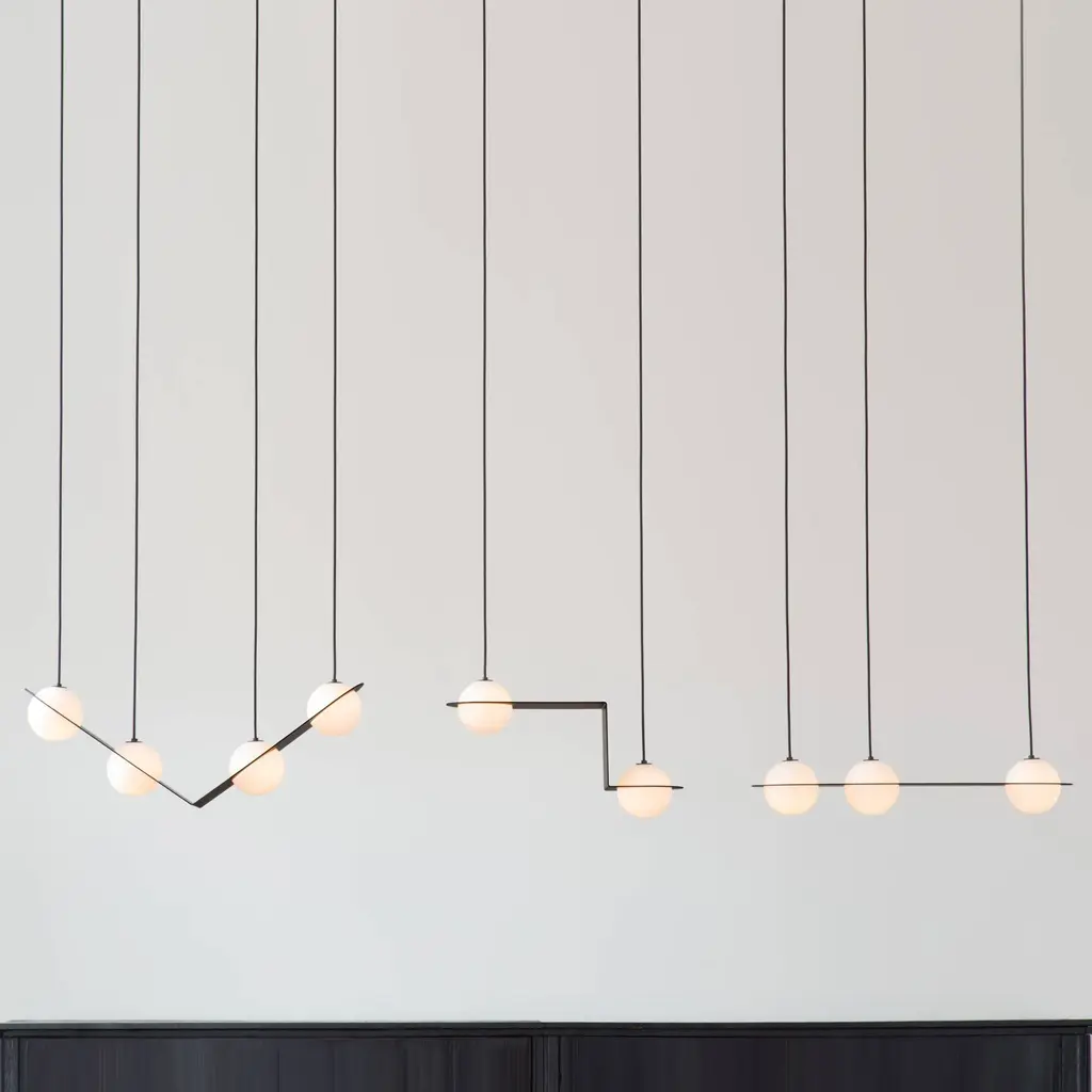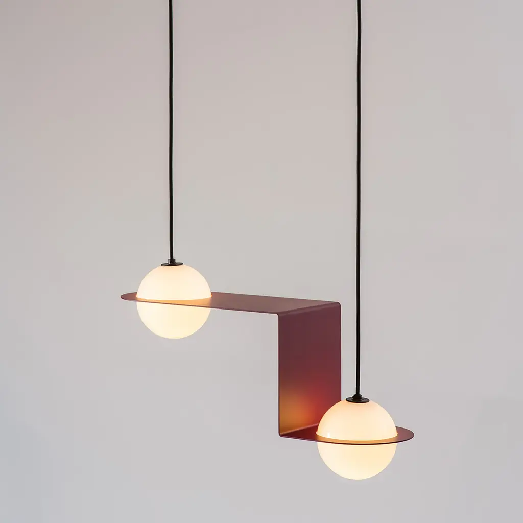 Dual staggered opaline globes in a horizontal stepped arrangement denote the Lambert 06 variation of Lambert & Fils' suspension lamp. The handblown milk glass forms emit warm diffused LED light while the metal structure comes in a range of select finishes—polished brass, nickel-plate or varied shades of powder-coated aluminum. In a choice of angled- or parallel-mount models, this eye-catching design is handmade at the brand's Montreal atelier.
