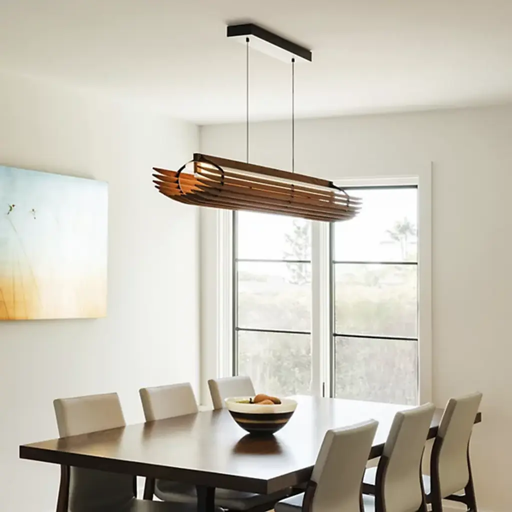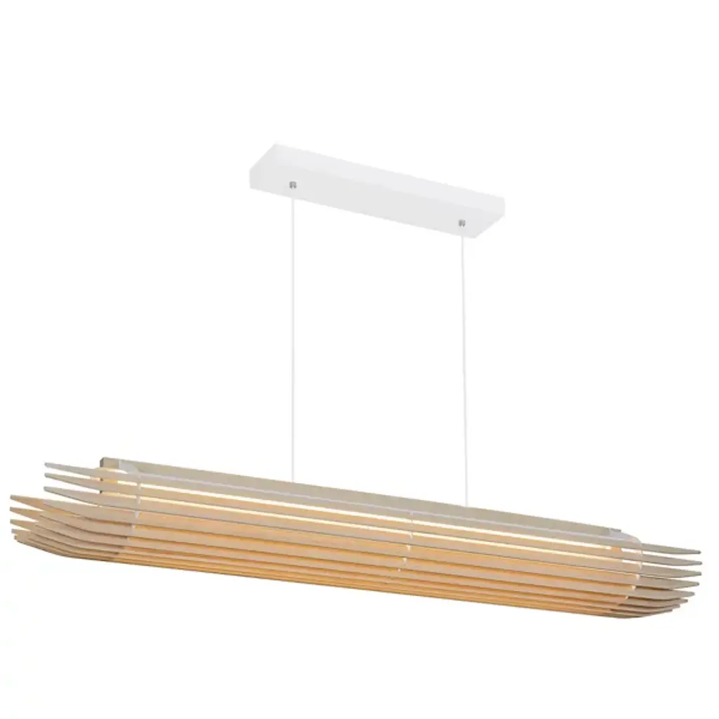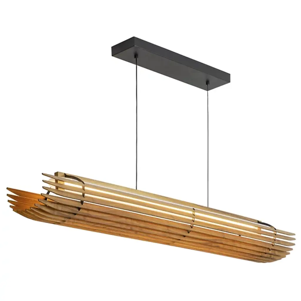 The Lex LED Linear Suspension by Cerno pairs elegant natural elements with a sophisticated contemporary design that is equally on-trend and eco-friendly. Handmade by artisans in the US, this fixture features energy-efficient LED lighting that is housed behind a curved boat-like shade made using elegant wood slats, all accented with a glass hurricane shade and suspended from the ceiling for a definitive appeal. This light is a smart and understated addition to a variety of spaces, from kitchens to dining rooms and much more.