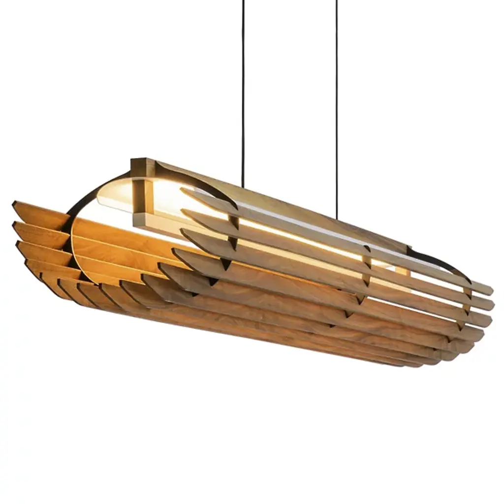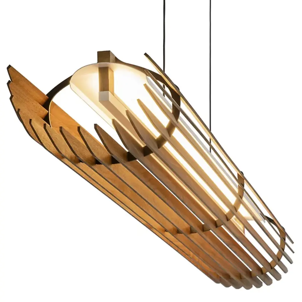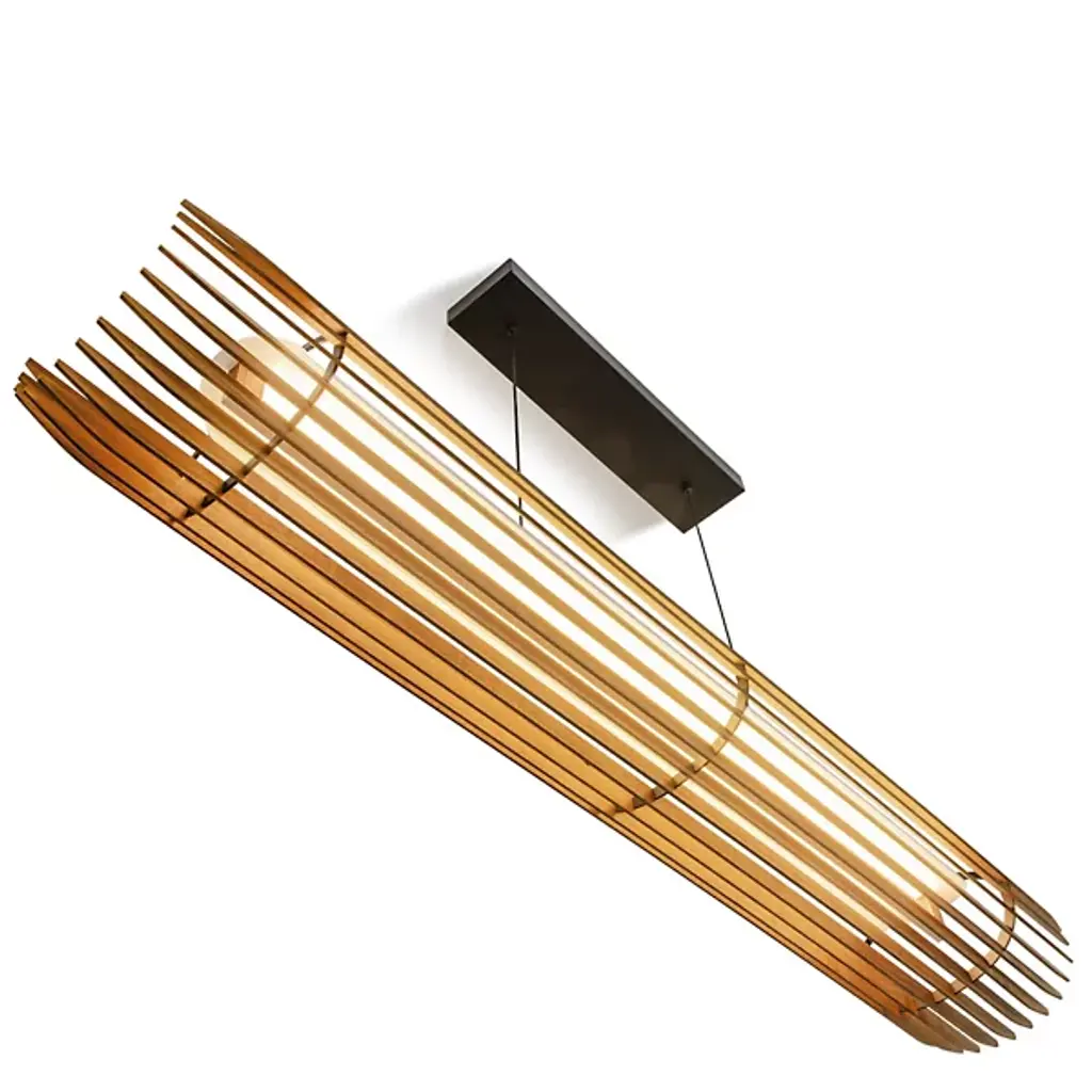 The Lex LED Linear Suspension by Cerno pairs elegant natural elements with a sophisticated contemporary design that is equally on-trend and eco-friendly. Handmade by artisans in the US, this fixture features energy-efficient LED lighting that is housed behind a curved boat-like shade made using elegant wood slats, all accented with a glass hurricane shade and suspended from the ceiling for a definitive appeal. This light is a smart and understated addition to a variety of spaces, from kitchens to dining rooms and much more.