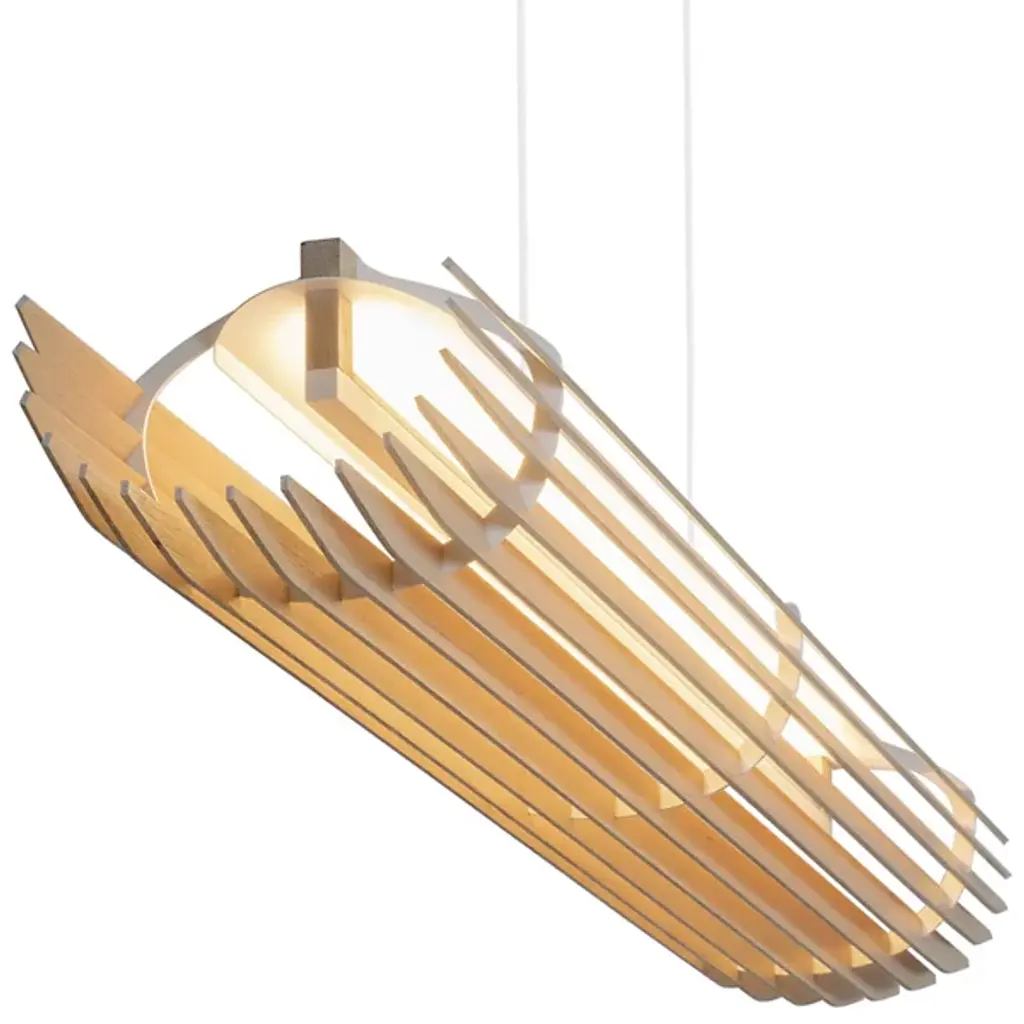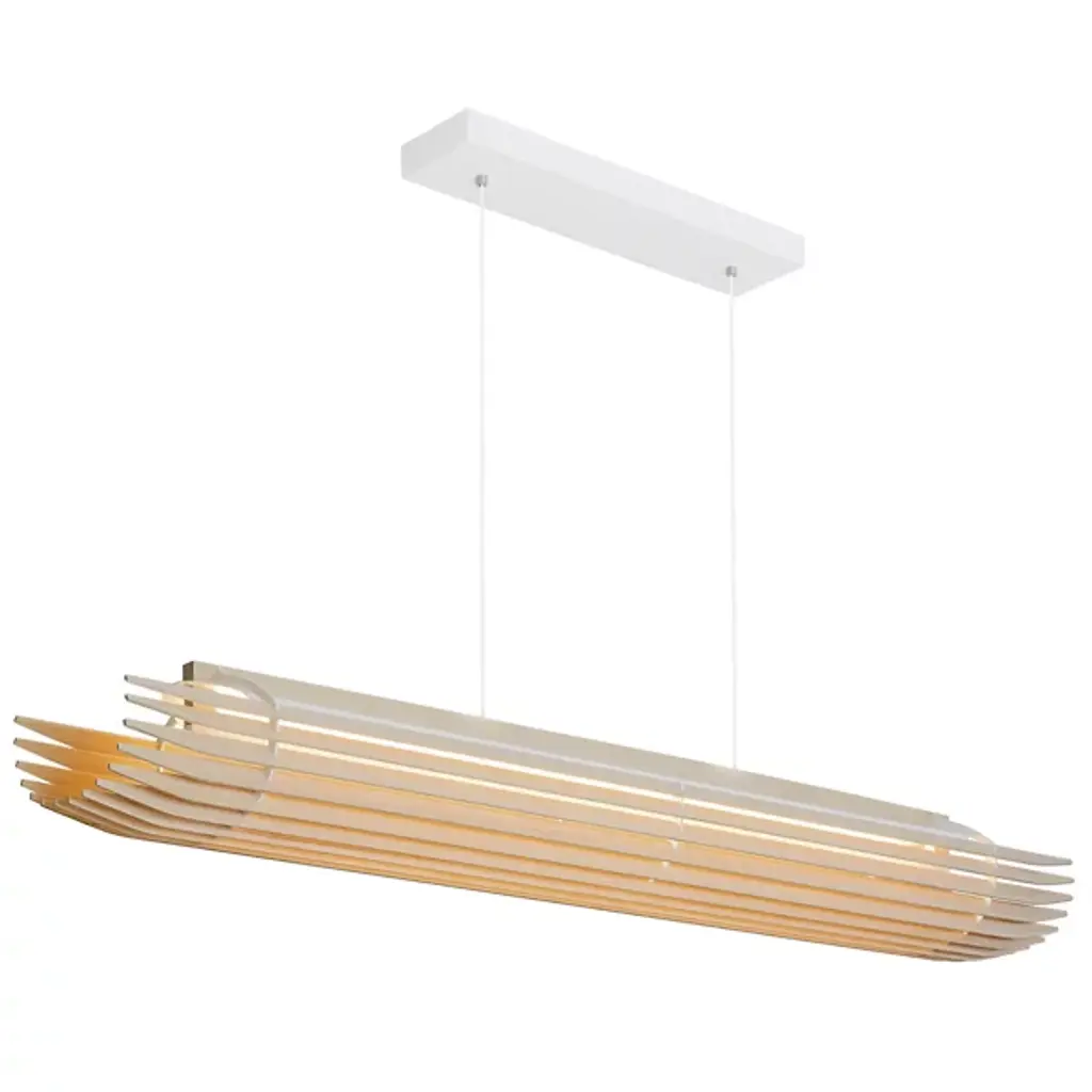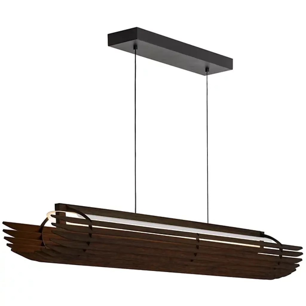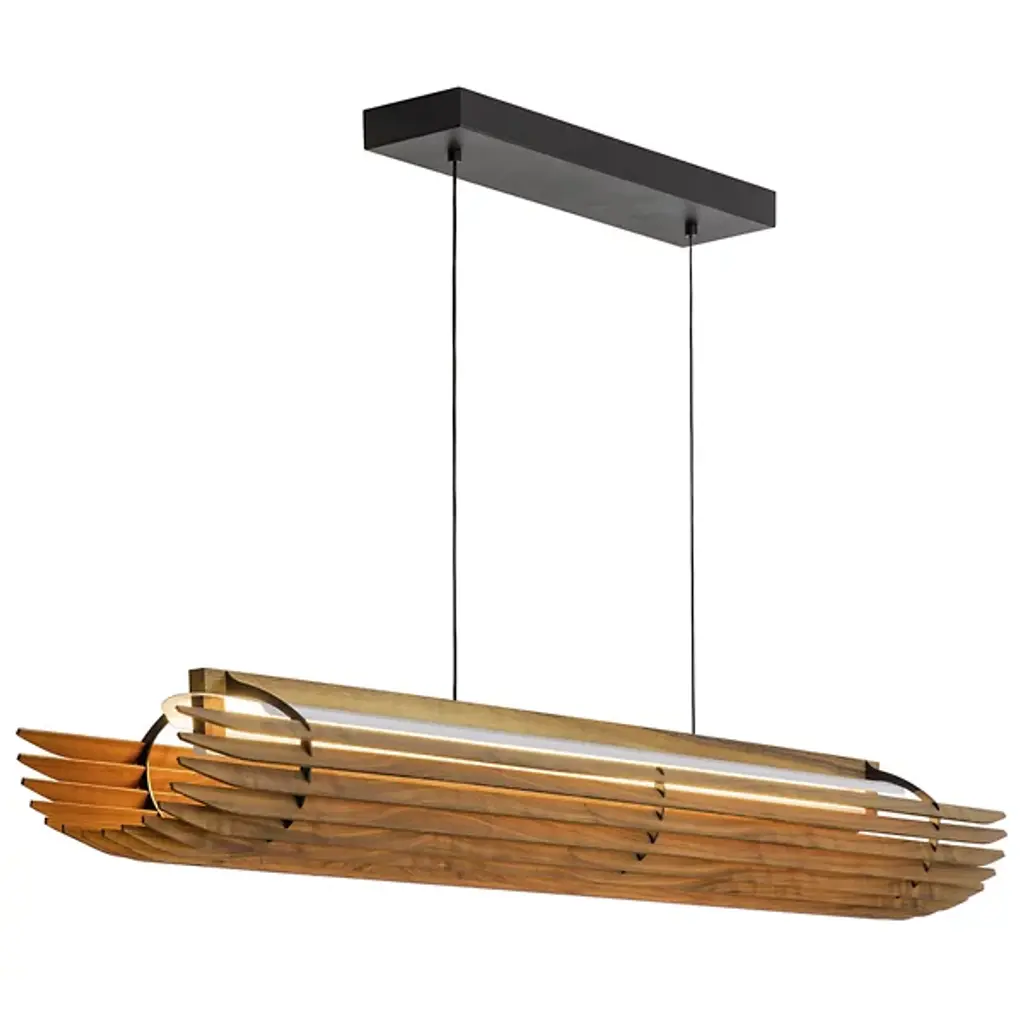 The Lex LED Linear Suspension by Cerno pairs elegant natural elements with a sophisticated contemporary design that is equally on-trend and eco-friendly. Handmade by artisans in the US, this fixture features energy-efficient LED lighting that is housed behind a curved boat-like shade made using elegant wood slats, all accented with a glass hurricane shade and suspended from the ceiling for a definitive appeal. This light is a smart and understated addition to a variety of spaces, from kitchens to dining rooms and much more.