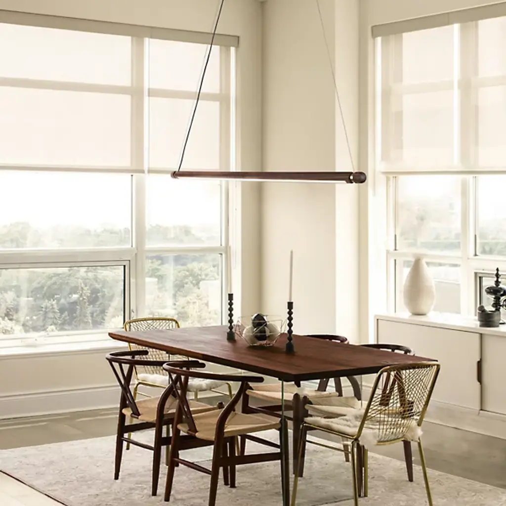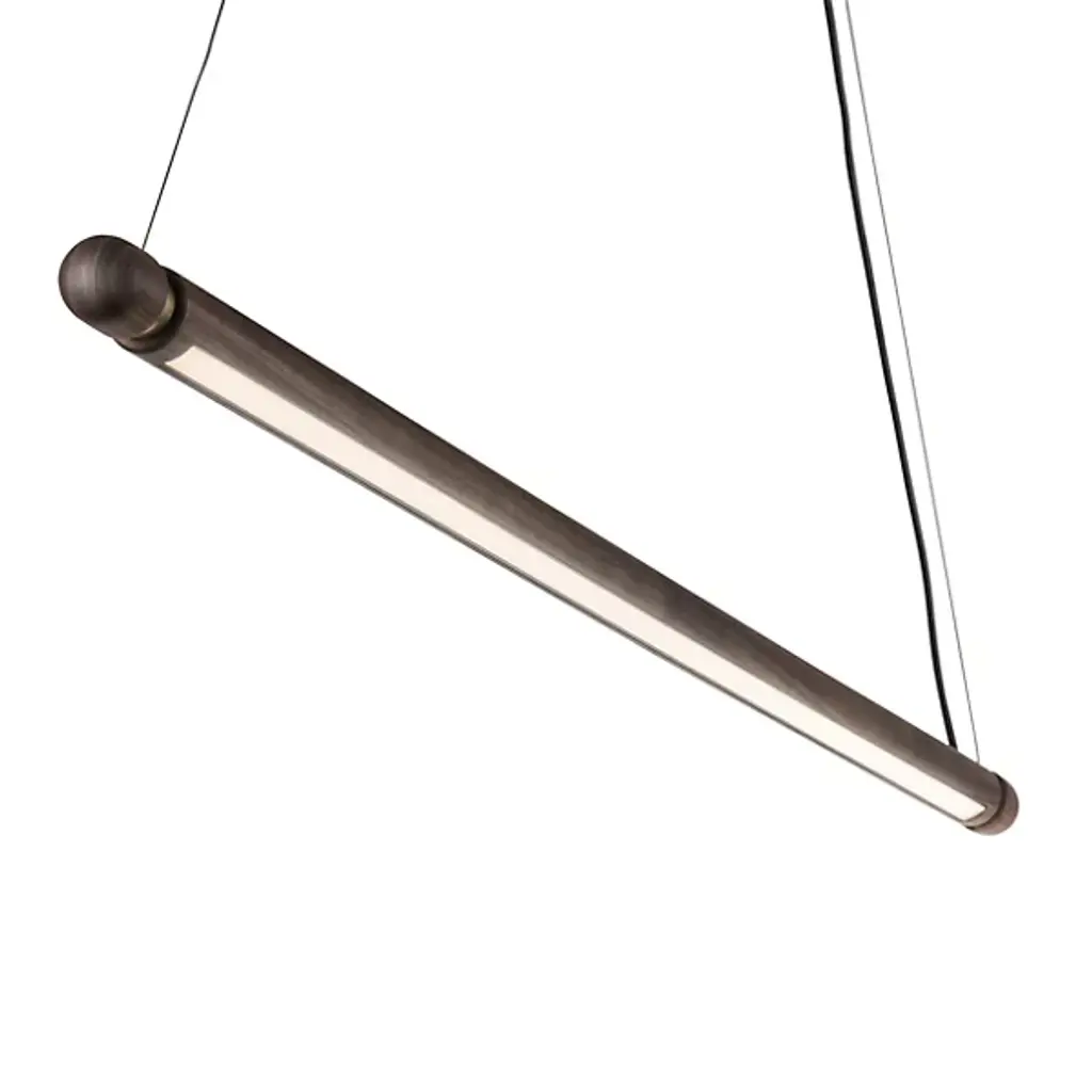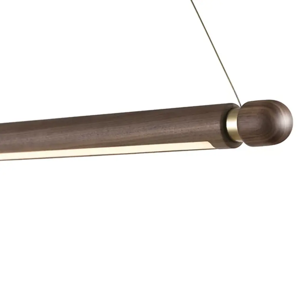 The Linea Horizontal LED Linear Suspension from Nomon offers unforgettable and elegant illumination to large inside spaces. Made in Spain, and suspended from a flaring canopy via slim cables, this simple and soothing design from the mind of Andres Martinez places strong and energy-friendly LED lamping inside a cylinder of natural wood. The fixture's body directs the light, while metallic collars at either end provide stylish and strong accents that draw the eye.