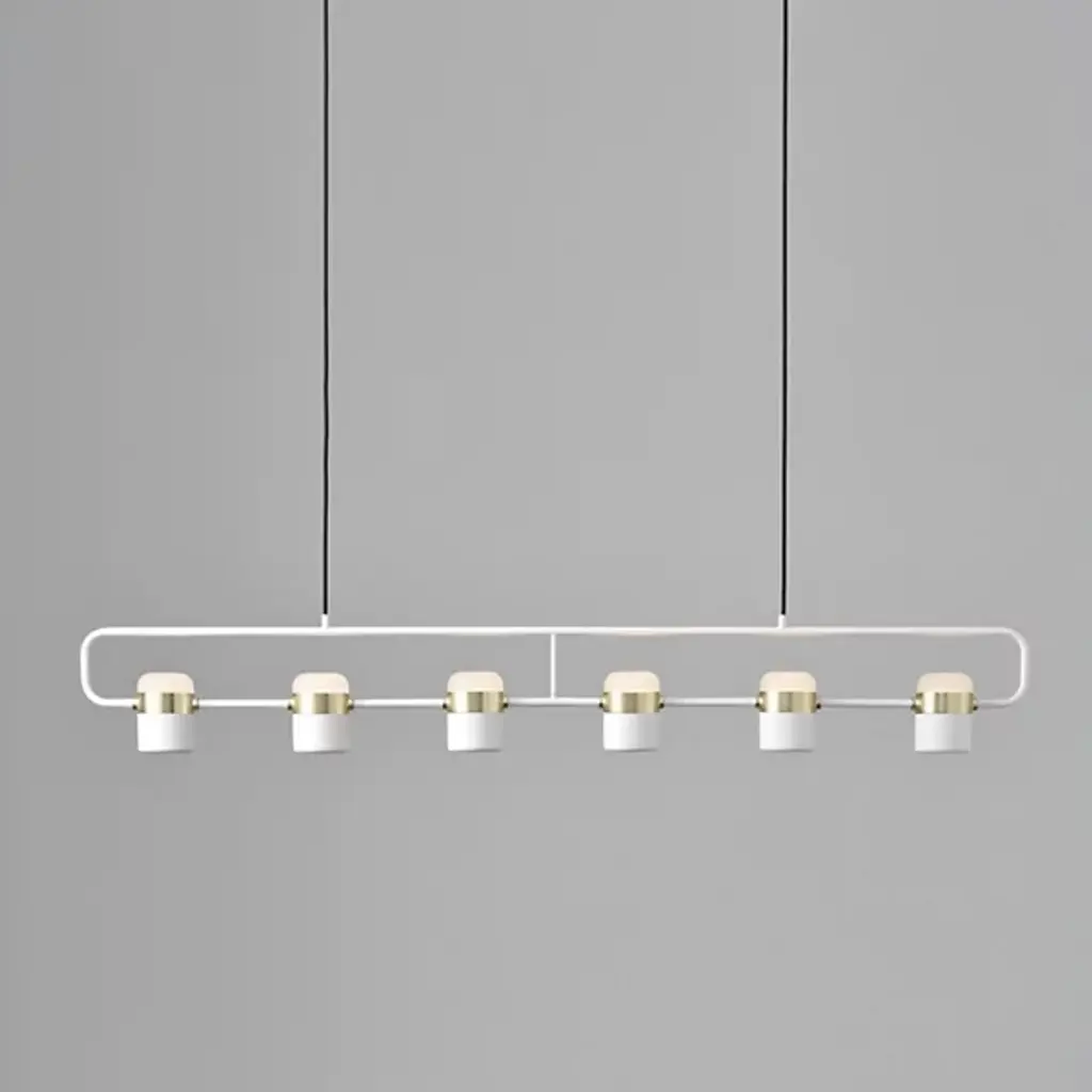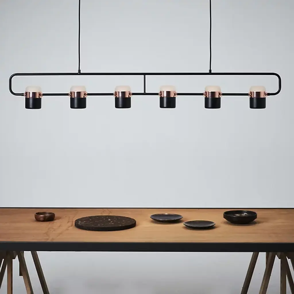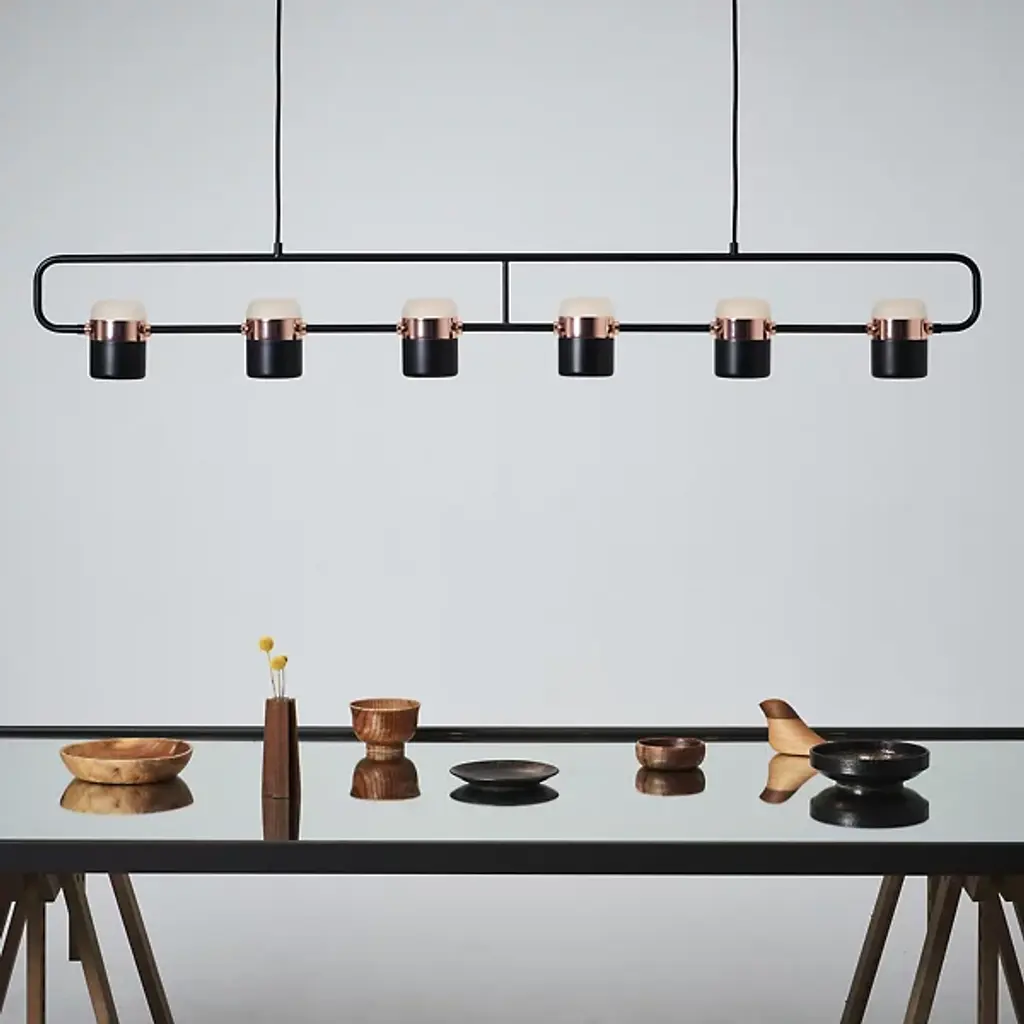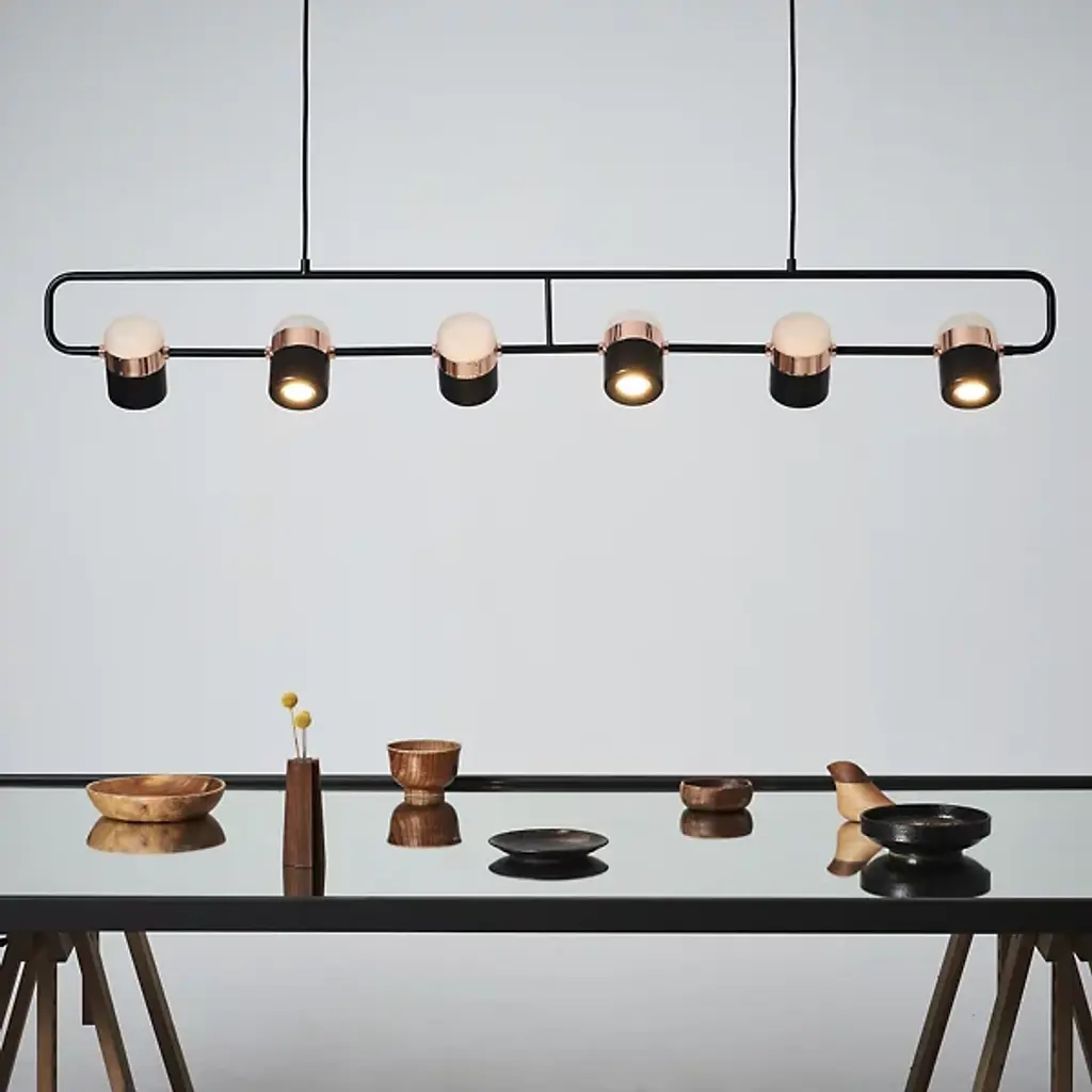 Effortlessly chic, the Ling PL6 LED Linear Suspension from Seed Design is a choice addition to a dining space or kitchen. Inspired by patterned metal fences built around balconies and windows, this fixture descends from an elongated canopy via two downrods. An open frame supports a series of cylindrical shades that glow brightly with light from integrated LEDs. Each shade can be adjusted to direct its light in any direction, allowing the piece to provide upward, downward, or ambient light with ease.