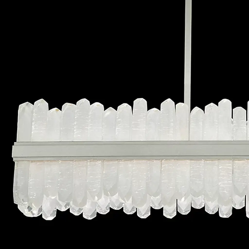 Enliven your interior spaces with the organic opulence of the Lior 898040 LED Linear Suspension from Fine Art Lamps. A restrained rectangular metal frame hangs suspended from a stepped ceiling mount via parallel downrods, holding energy-efficient LEDs in a housing open on both top and bottom. This lamping is then gentled by translucent spires of art glass faceted to look like variant-height rock crystals, exchanging direct brightness for a natural glow from within.