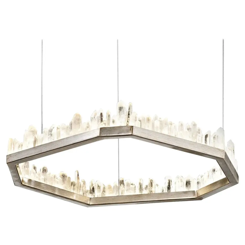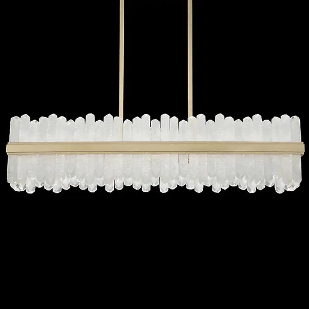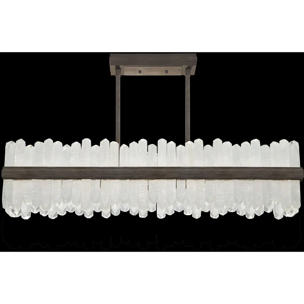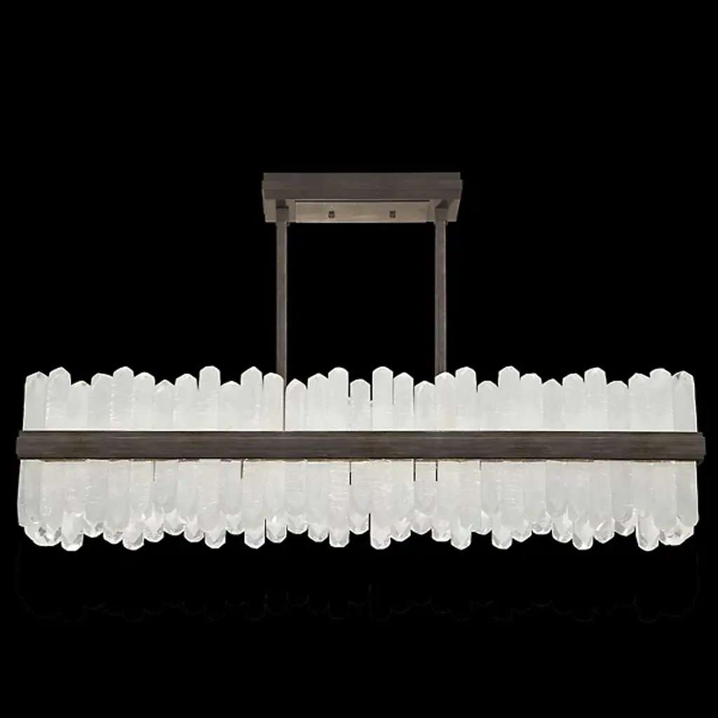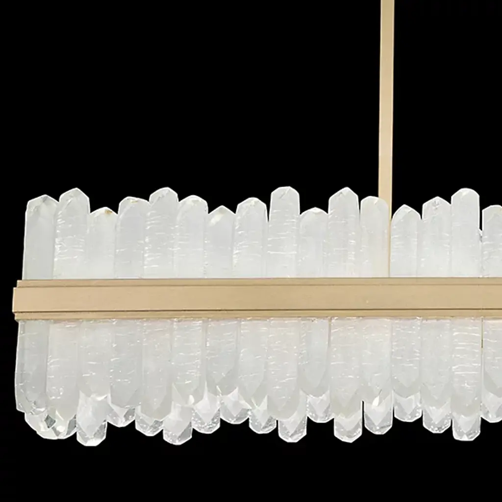 Enliven your interior spaces with the organic opulence of the Lior 898040 LED Linear Suspension from Fine Art Lamps. A restrained rectangular metal frame hangs suspended from a stepped ceiling mount via parallel downrods, holding energy-efficient LEDs in a housing open on both top and bottom. This lamping is then gentled by translucent spires of art glass faceted to look like variant-height rock crystals, exchanging direct brightness for a natural glow from within.