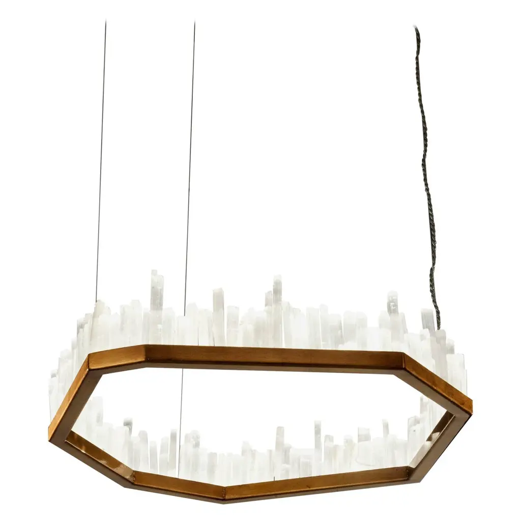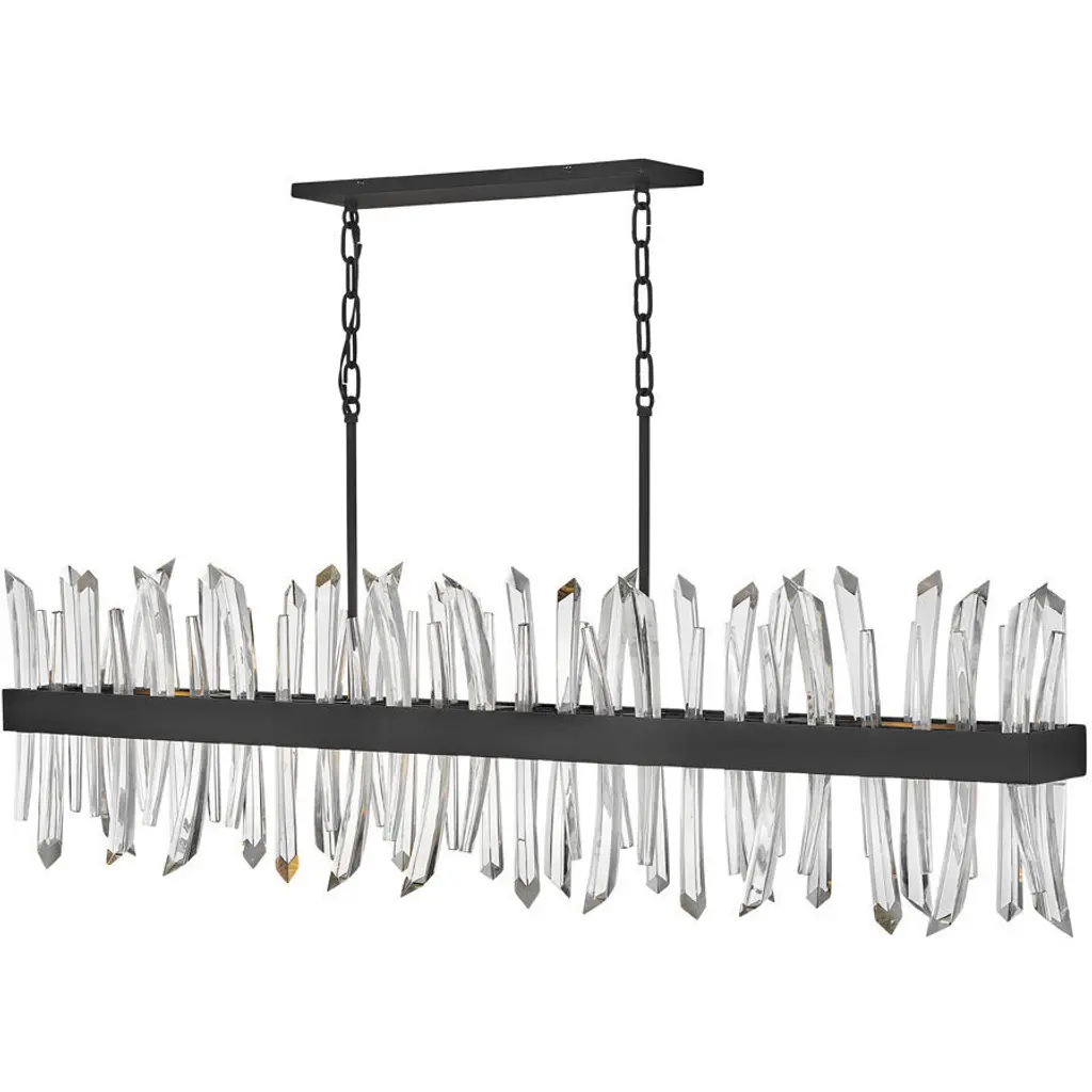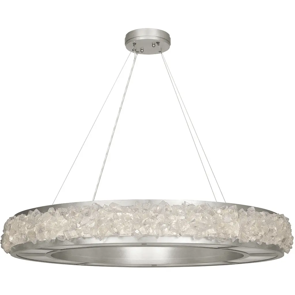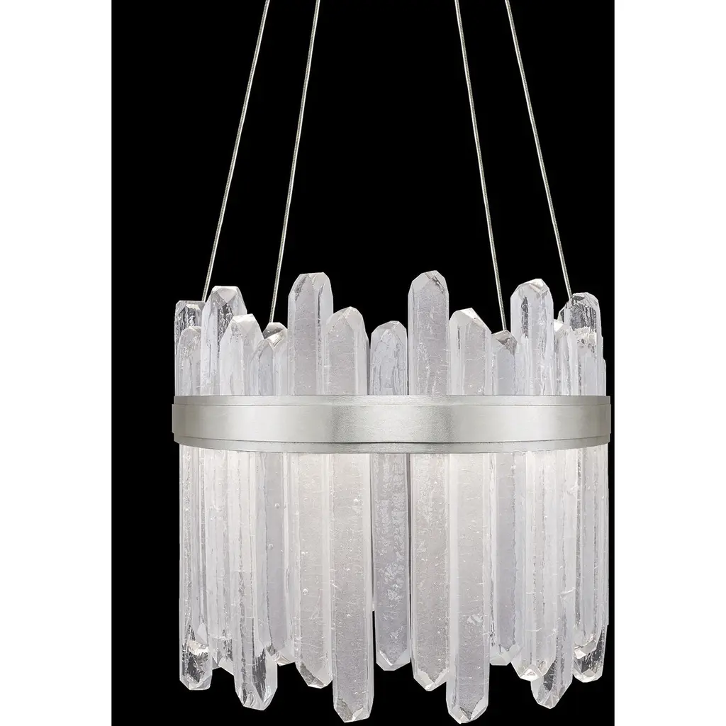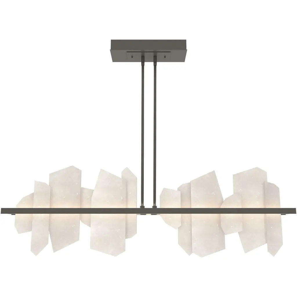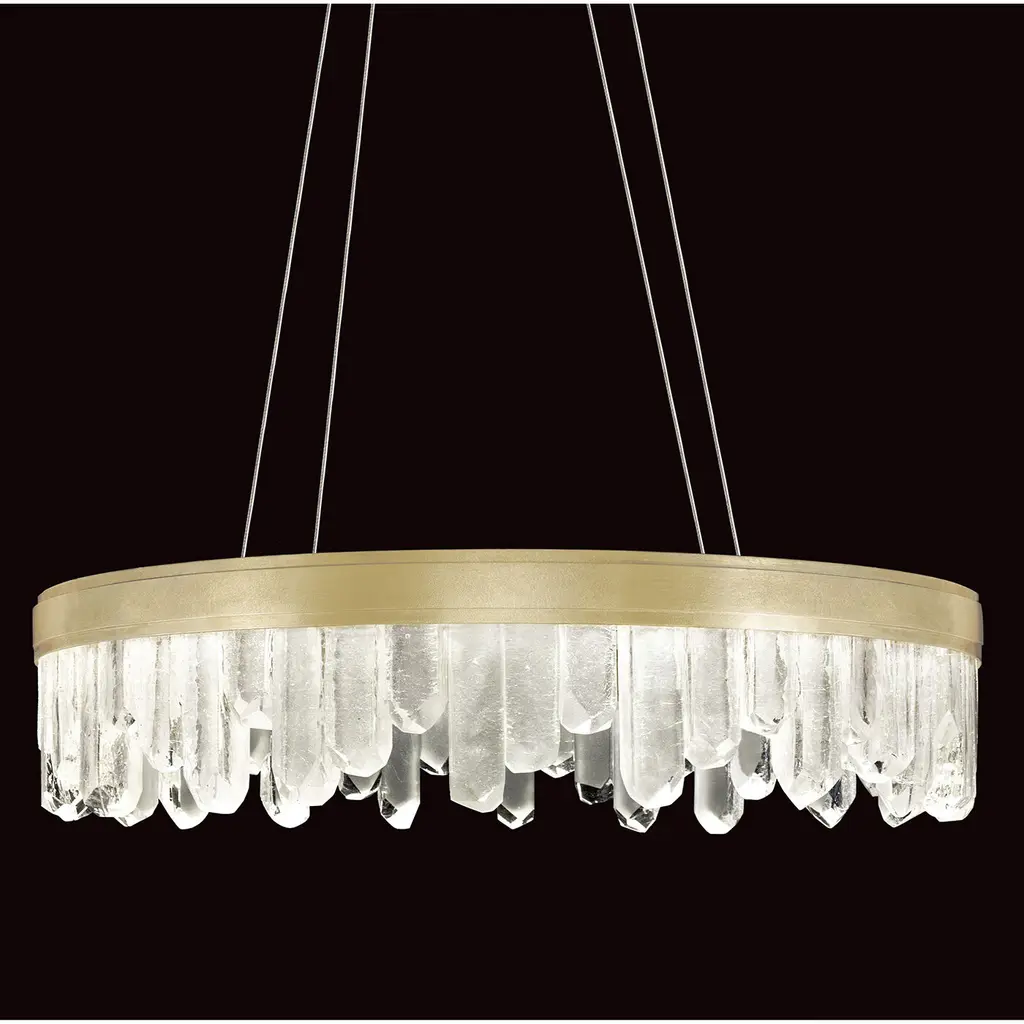 Enliven your interior spaces with the organic opulence of the Lior 898040 LED Linear Suspension from Fine Art Lamps. A restrained rectangular metal frame hangs suspended from a stepped ceiling mount via parallel downrods, holding energy-efficient LEDs in a housing open on both top and bottom. This lamping is then gentled by translucent spires of art glass faceted to look like variant-height rock crystals, exchanging direct brightness for a natural glow from within.