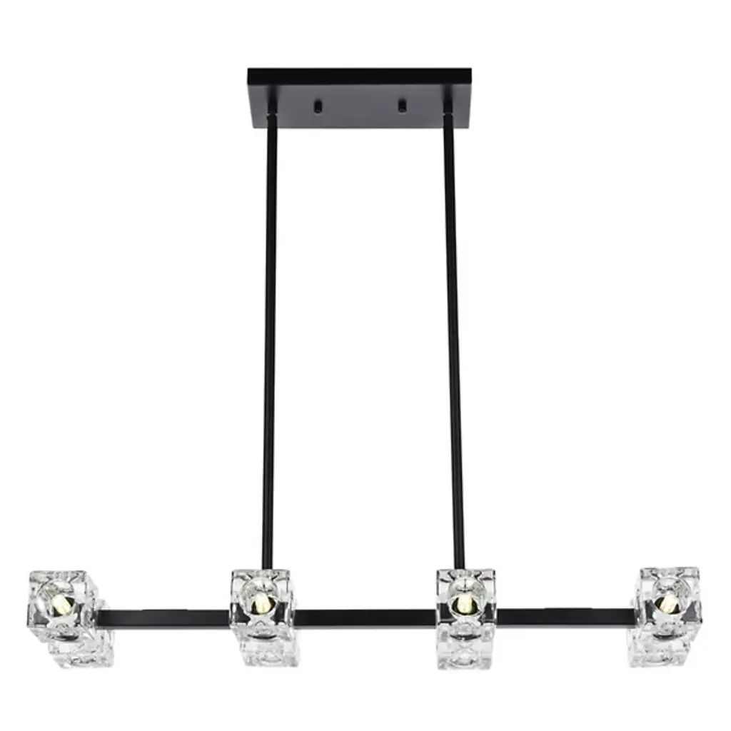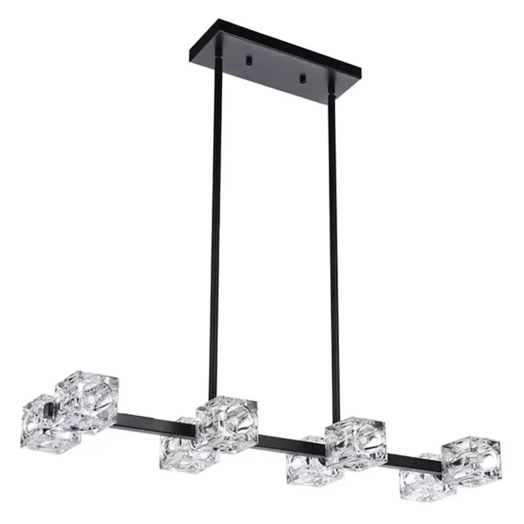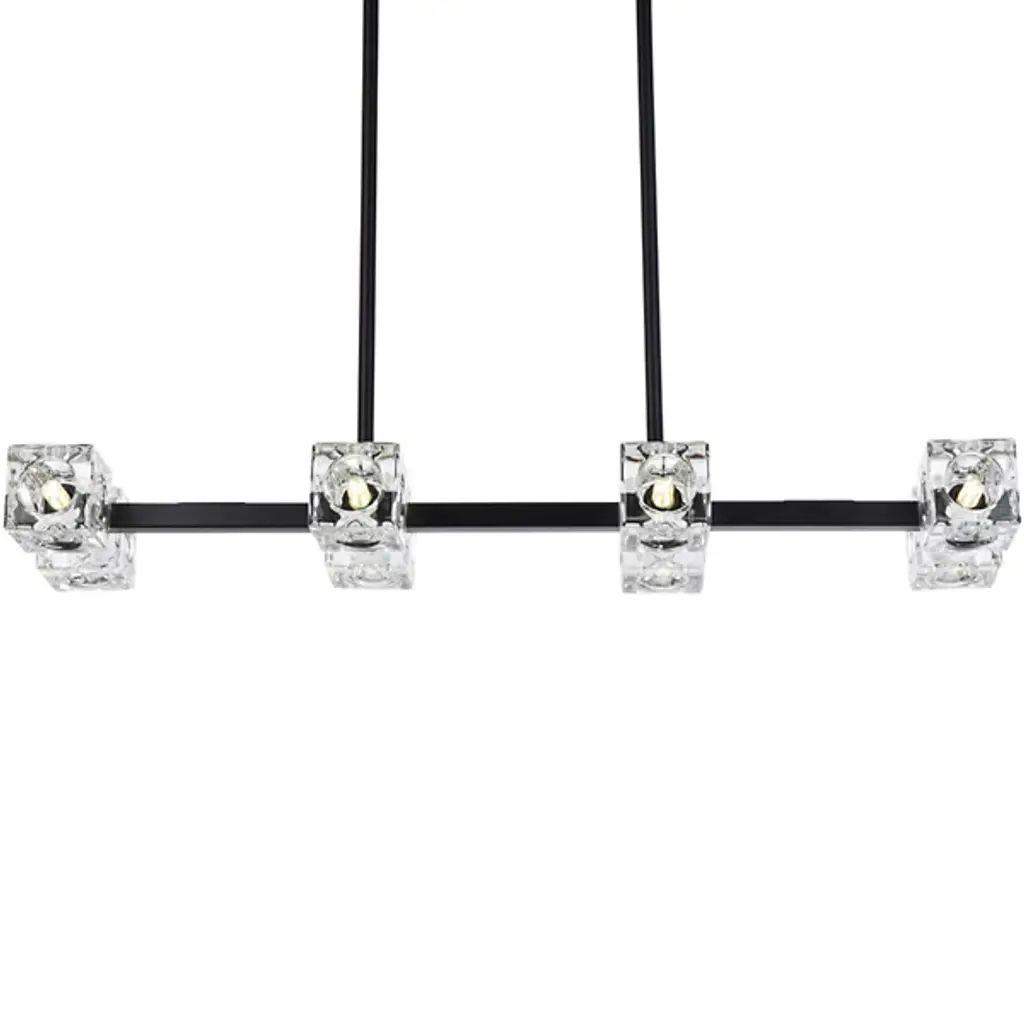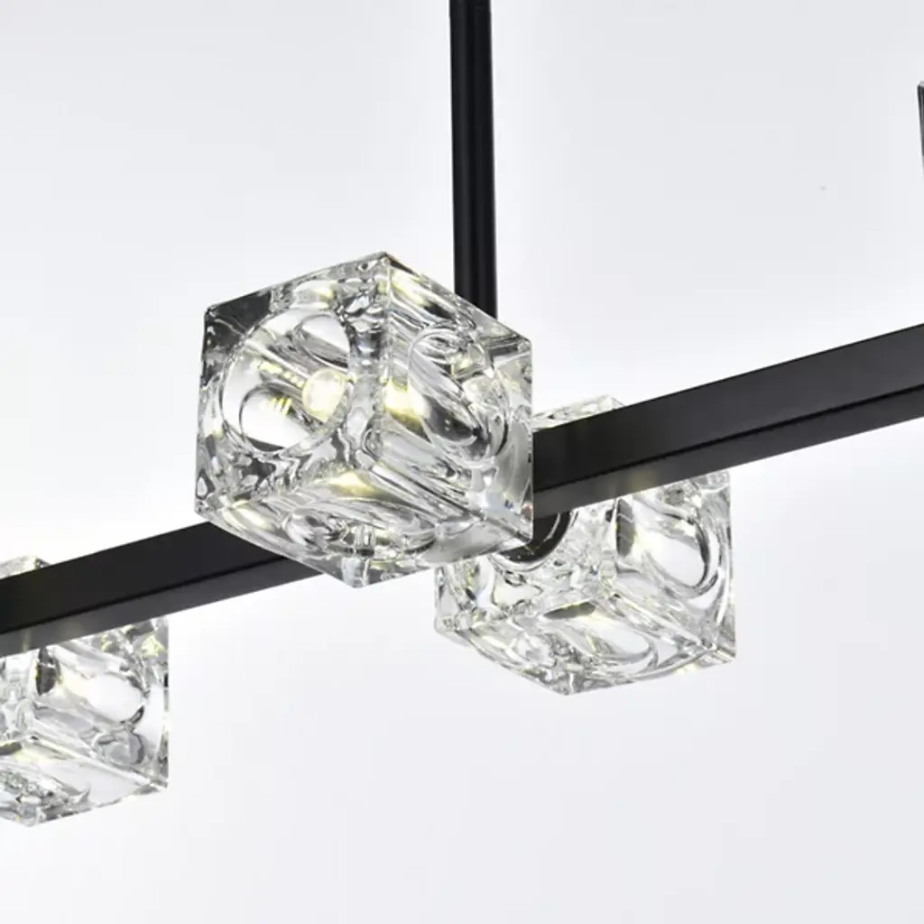 The Lira Linear Suspension from Huxe is at once simple and sculptural. It features eight lights with distinctive dimpled square glass shades, offering a uniquely textured look. Its durable iron support structure blends simple contemporary design with industrial elegance. Descending from a rectangular canopy, it includes two slim rods set in parallel for stability and a refined, modern character. This fixture shows off elements of Mid-Century Modern and Transitional styles, making it a versatile and sophisticated addition as it distributes a mellow ambiance around any interior space.