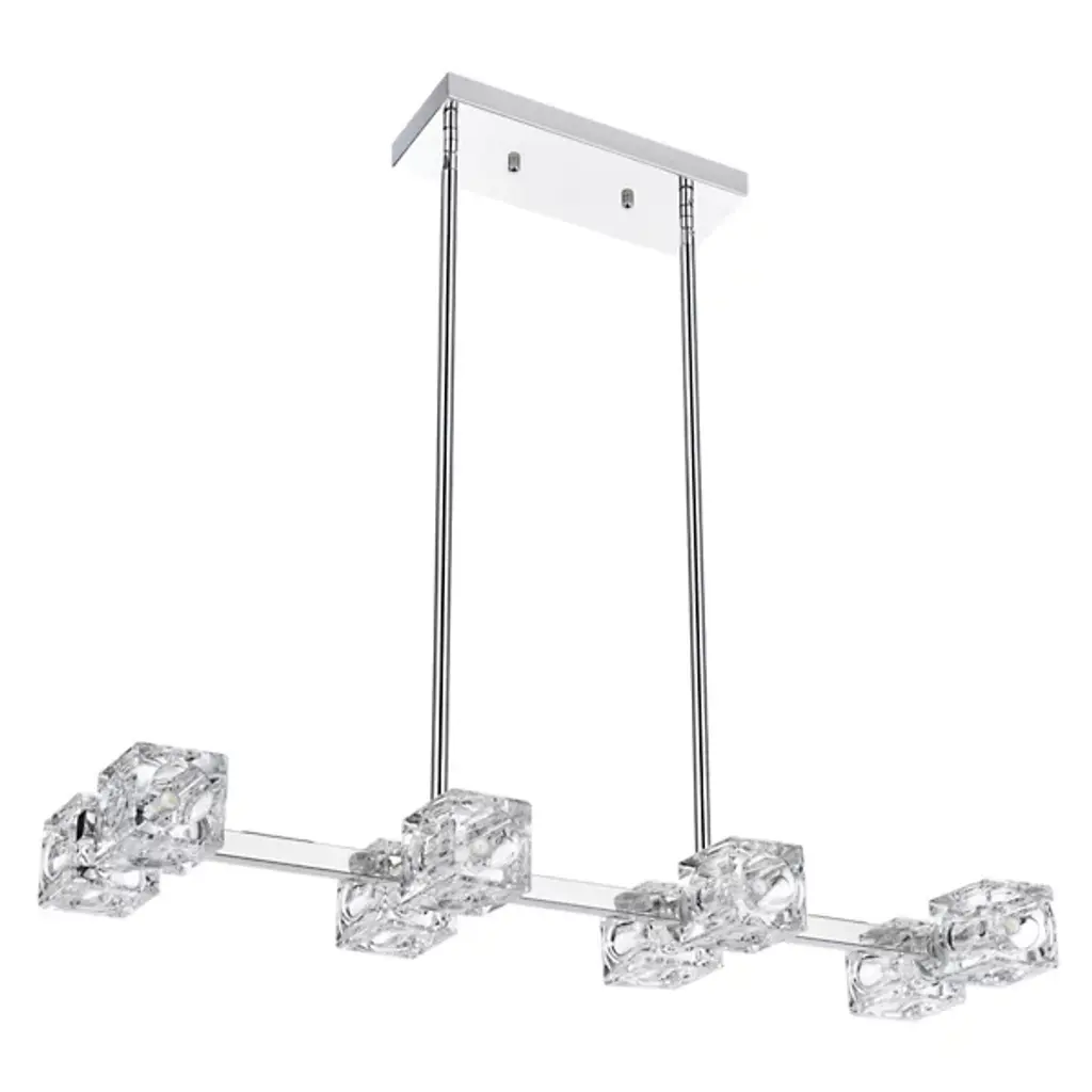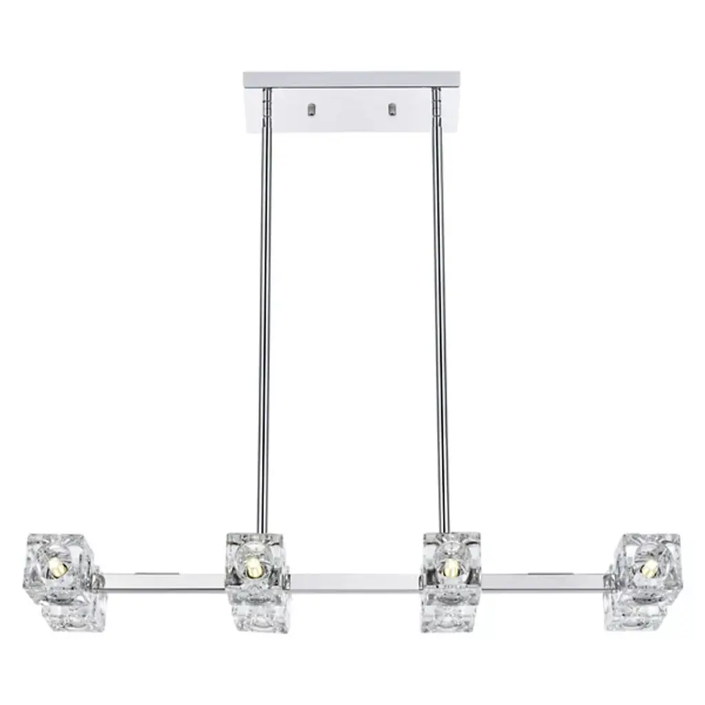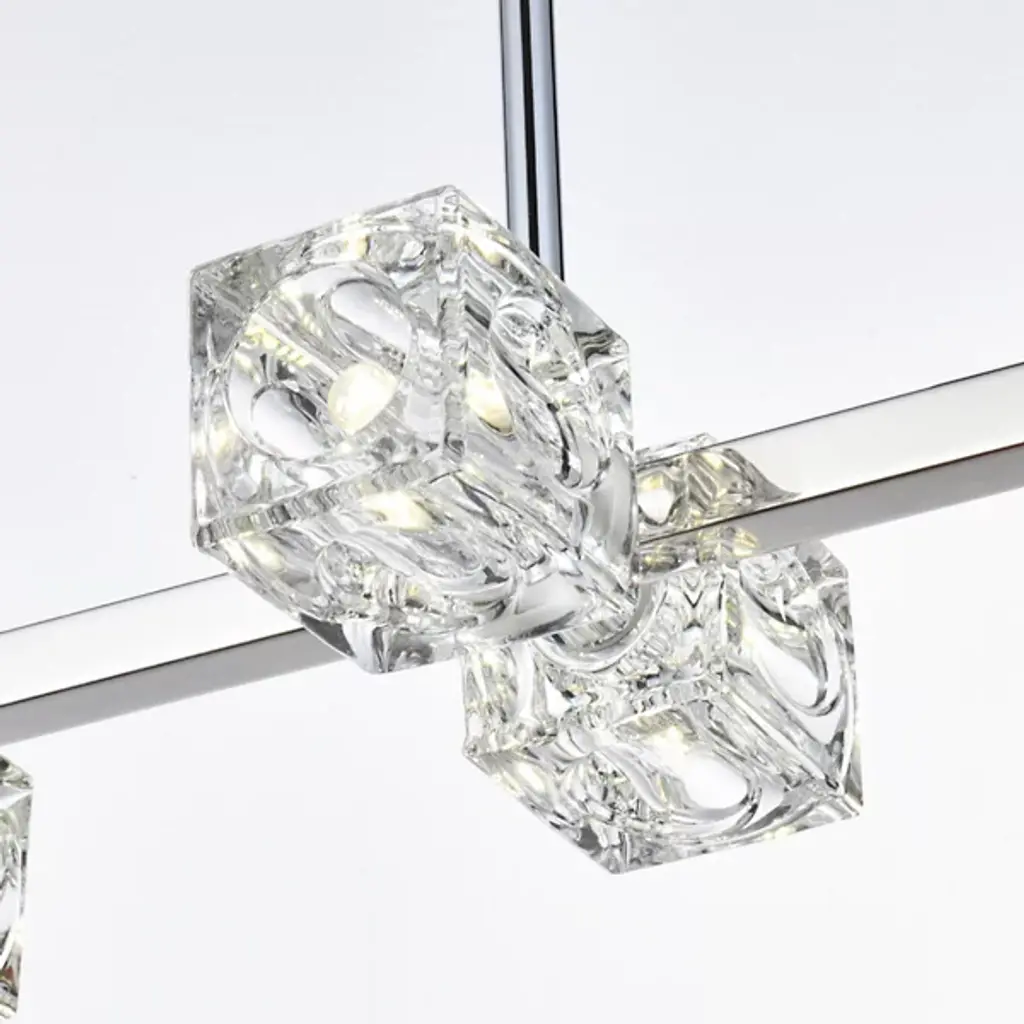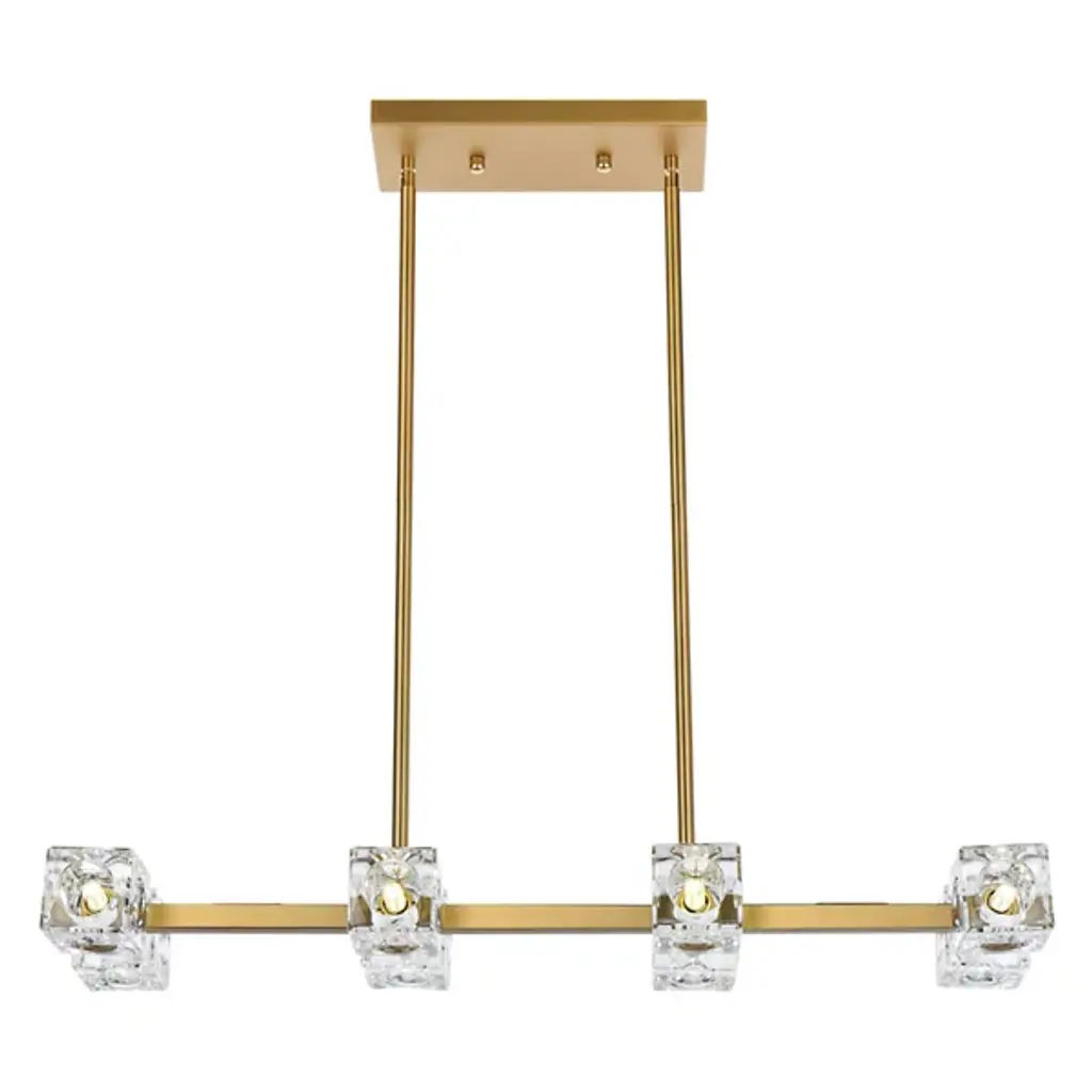 The Lira Linear Suspension from Huxe is at once simple and sculptural. It features eight lights with distinctive dimpled square glass shades, offering a uniquely textured look. Its durable iron support structure blends simple contemporary design with industrial elegance. Descending from a rectangular canopy, it includes two slim rods set in parallel for stability and a refined, modern character. This fixture shows off elements of Mid-Century Modern and Transitional styles, making it a versatile and sophisticated addition as it distributes a mellow ambiance around any interior space.