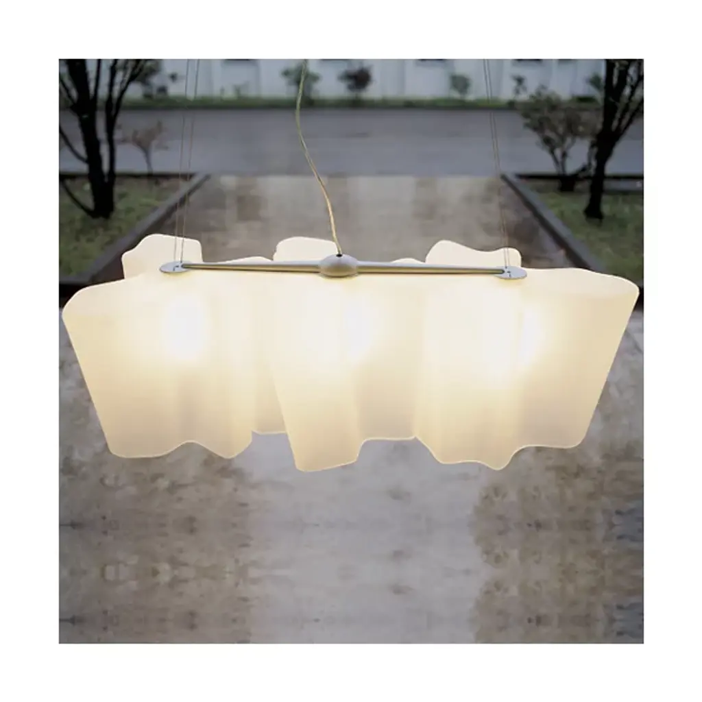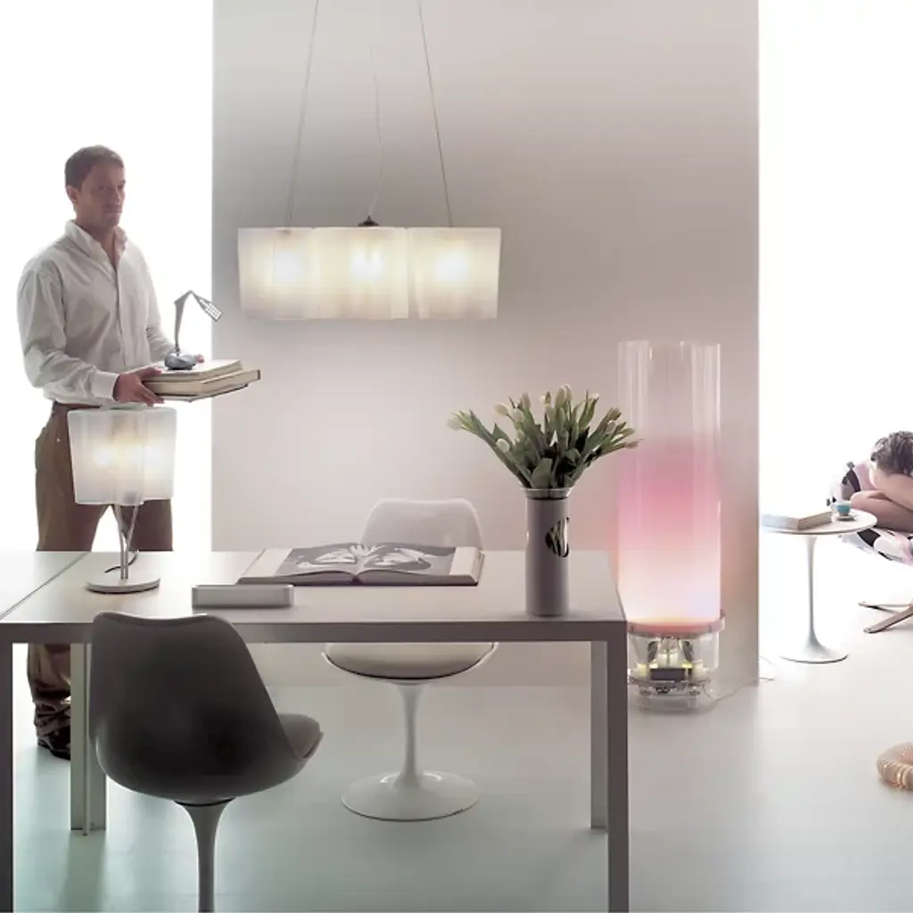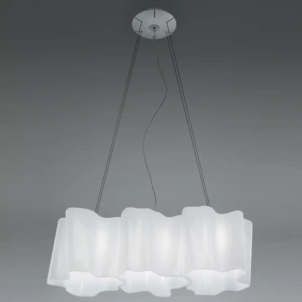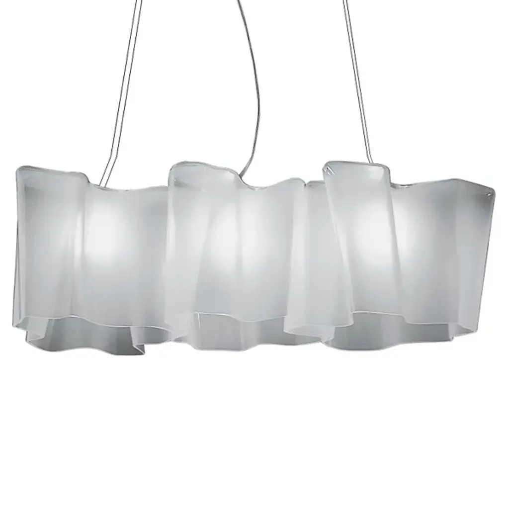 Over lengthy dining room tables, the Artemide Logico Triple Linear Suspension provides beautiful diffuse illumination and a sense of harmony. It features three of the distinctive Logico shades, the various folds of the hand-blown glass overlapping and connecting the three shades into one linear configuration. Designed by Michele De Lucchi and Gerhard Reichert.