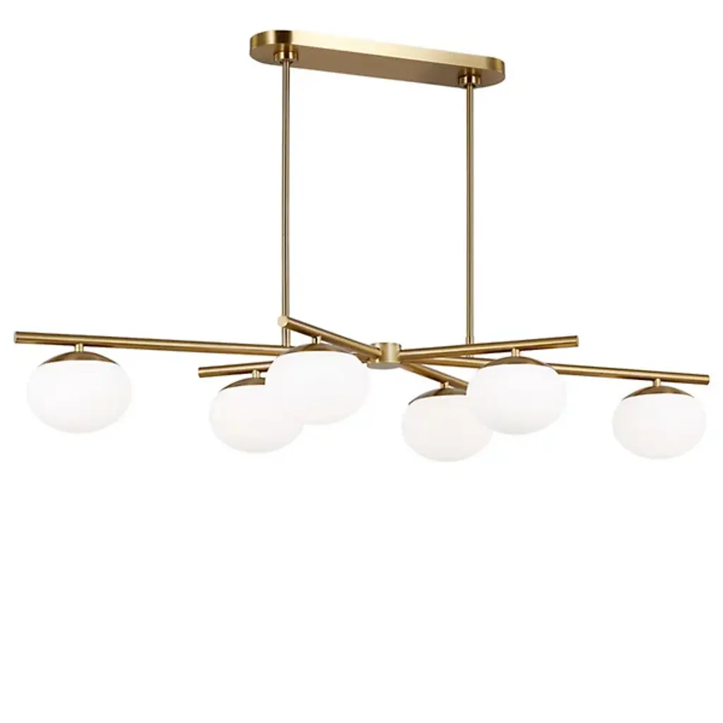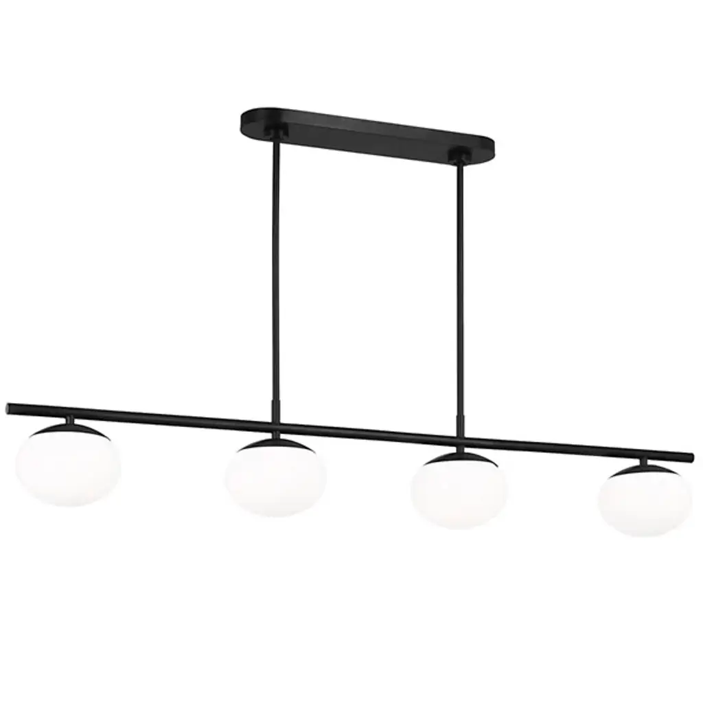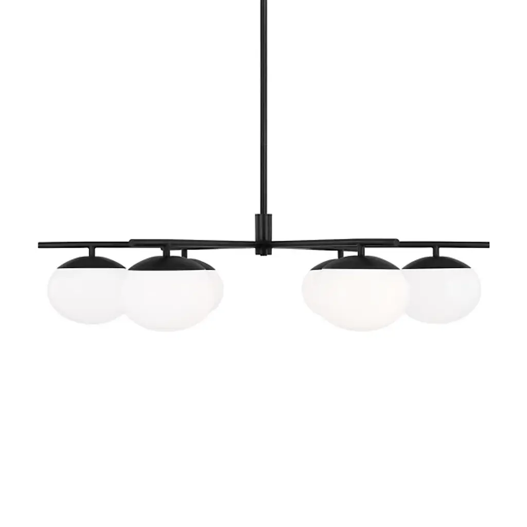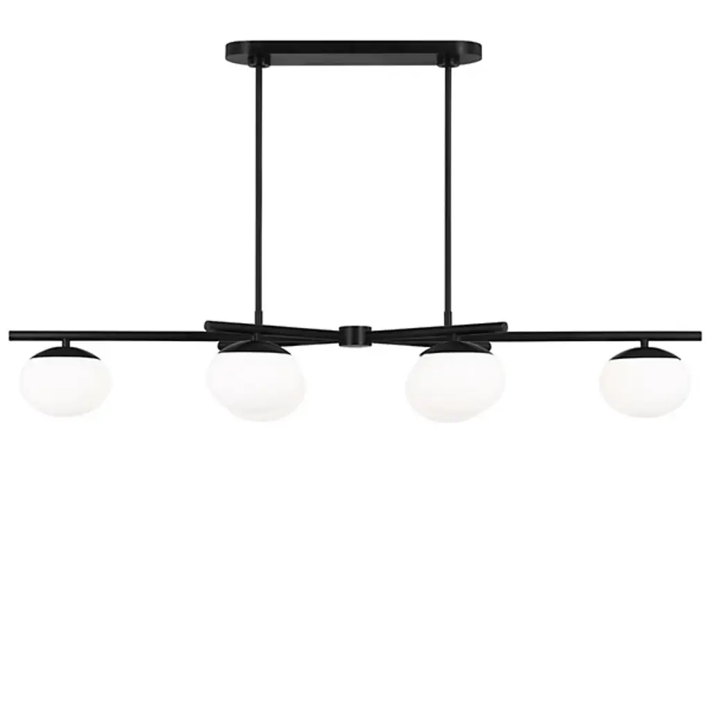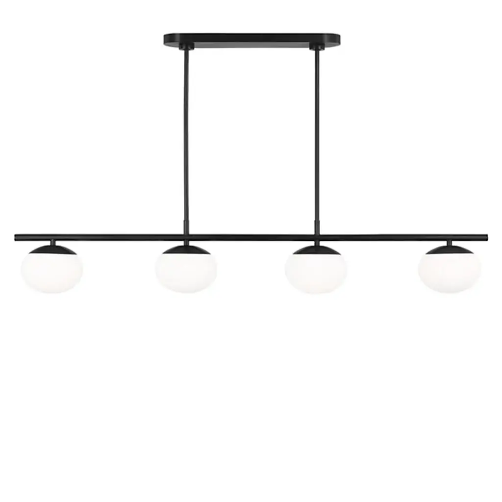 Creating for the high-quality lifestyle brand ED, Ellen DeGeneres brings her unique vision to life with the mid-century modern Lune Linear Chandelier. Beautiful orbs of milk glass serve as diffusing shades for this piece. Each shade seems to suspend from the minimal horizontal steel rod that hangs from the matching canopy above. Because this item is suitable for dry interiors or damp locales, it allows many options to make a luxurious statement.