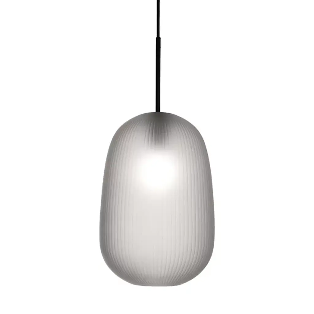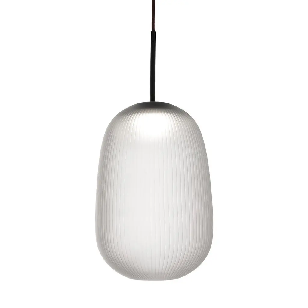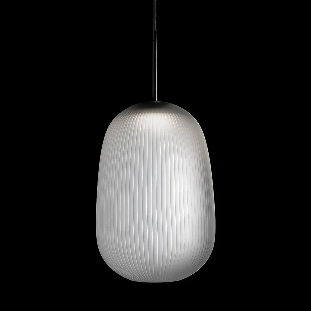 Suspension lamp bearing the name of an ancient divinity, made of frosted blown glass characterized by thin lines that create a pleated effect.