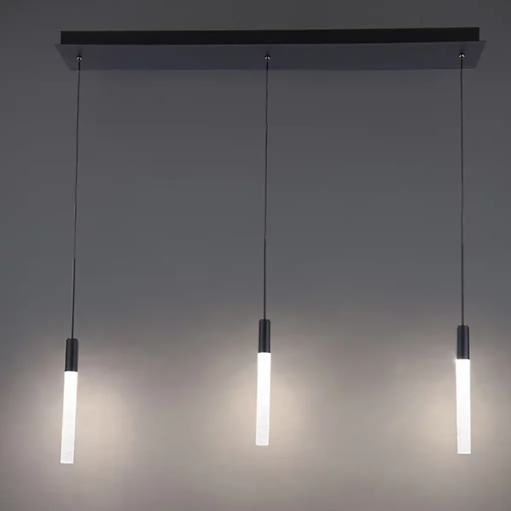 Bring a sense of artful contemporary style to your indoor spaces with the Magic LED Linear Pendant from Modern Forms. A narrow aluminum rectangle forms the low-profile canopy, dropping an orderly string of integrated LEDs set into small metal housings. The lamps are dimmable to adapt to your changing lighting needs, and each one is set above a textured rod of Piastra crystal that lends transforms bright downlight into a more welcoming ambiance.