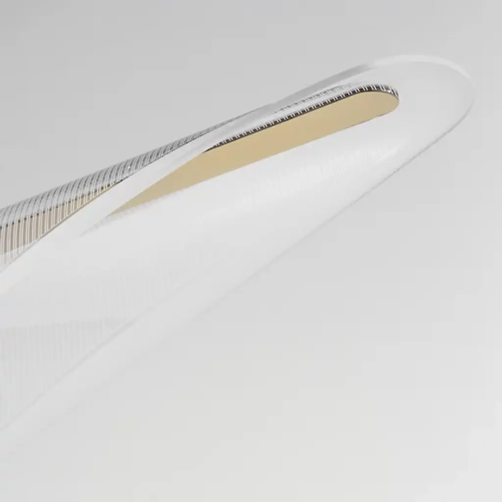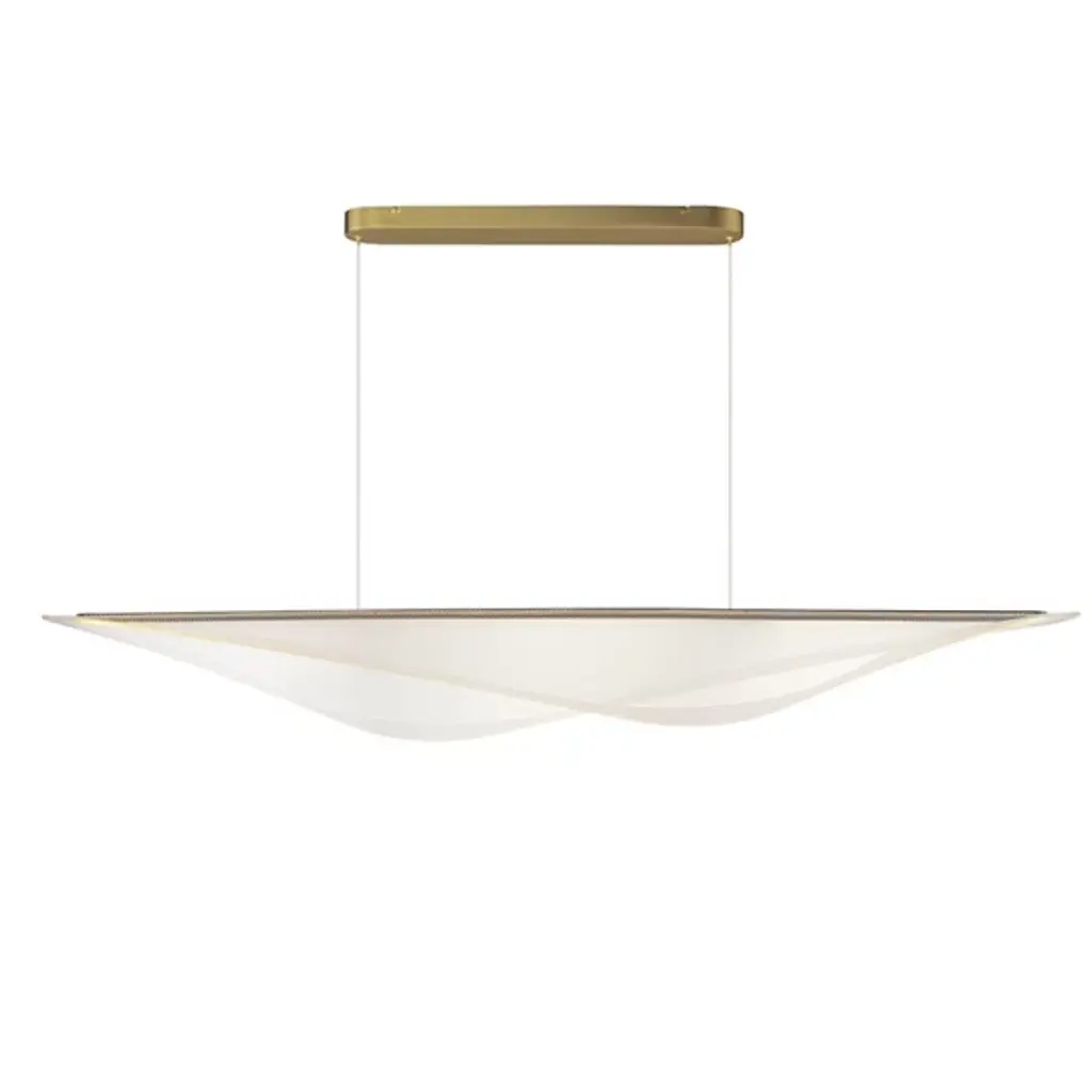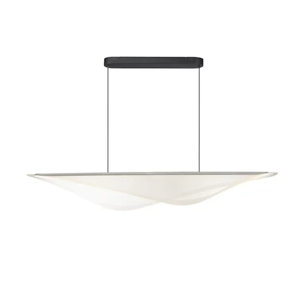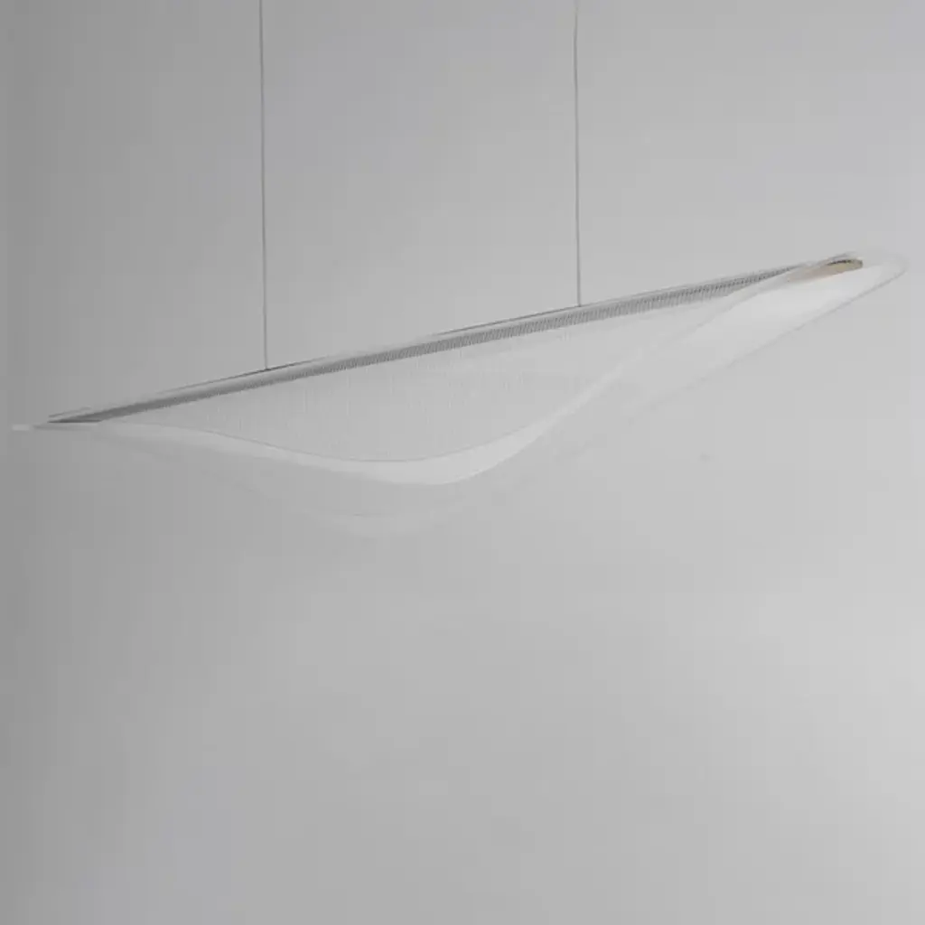The Manta LED Linear Suspension from ET2 Lighting is an exemplar of contemporary lighting design that seamlessly blends art and innovation. This fixture features a singular transparent acrylic panel, delicately folding at its center in an undulating shape and curl. The acrylic is meticulously designed with a patterned etching along its surface, featuring a frosted edge. The LED light source is discreetly housed within a metal casing, adding an element of warmth. It is crafted from high-quality aluminum, steel, and acrylic.