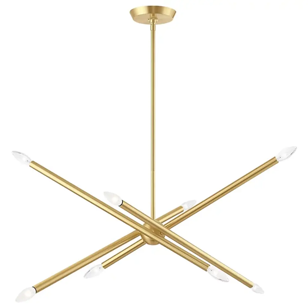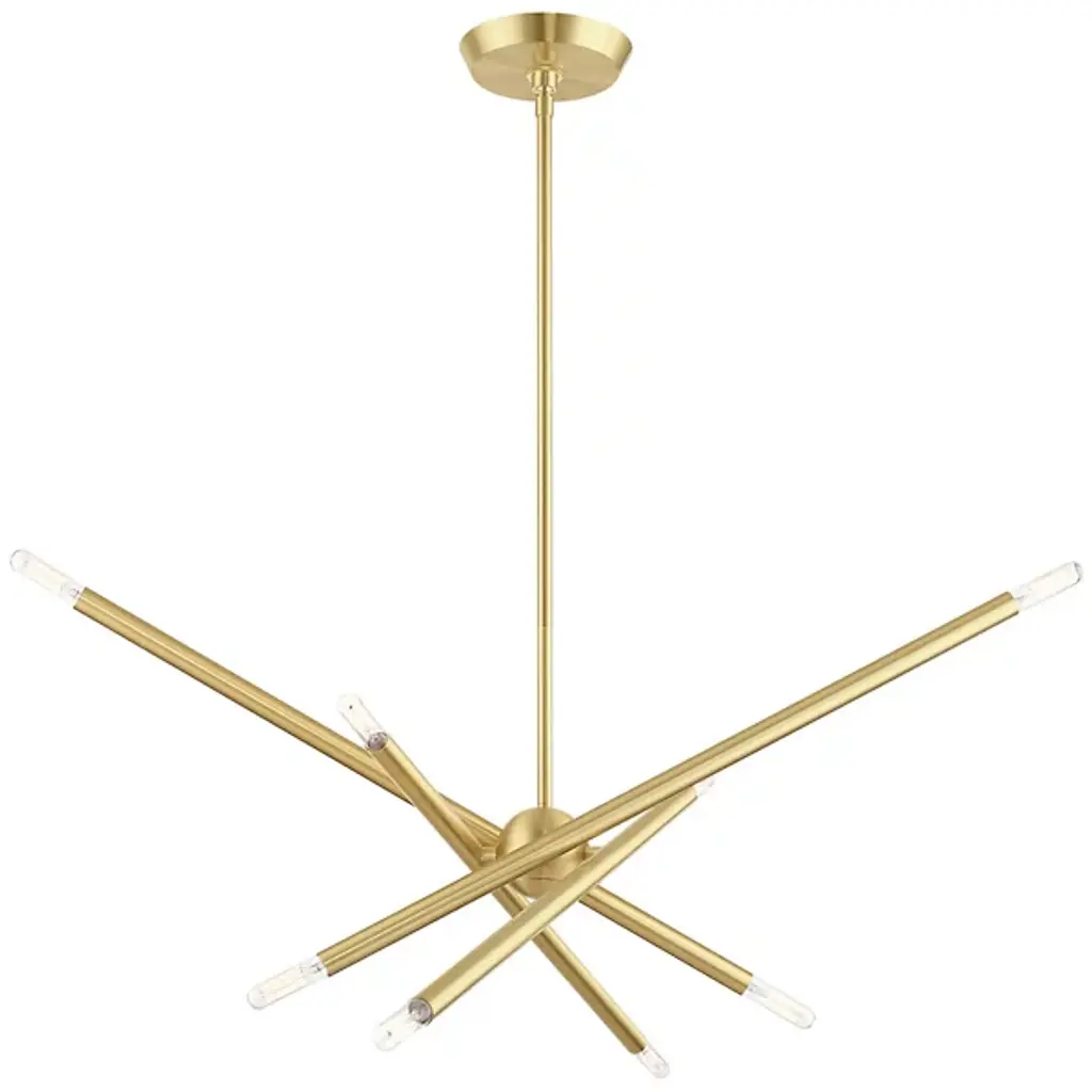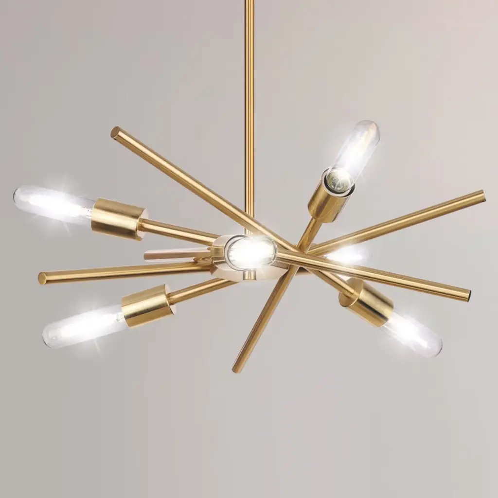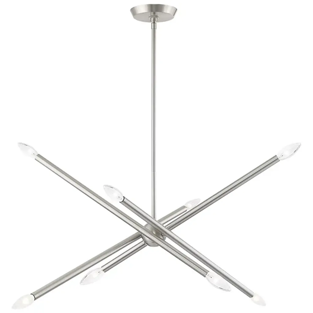 Add angular and artistic expression to inside living areas with the sleek style of the Mariann Linear Suspension from Alder & Ore. A steel fixture with a touch of mid-century Sputnik design, it uses a sleek disc canopy with an angled edge to secure the fixture, dispatching a thin, strong downrod that terminates in a lower spherical for the fixture’s lamping. Candelabra-style lamping with vintage bulbs emerges from either end of slender cylindrical housings angled for arresting advantage, casting a dazzling display of bright and reflected light that’s also damp-listed for that extra touch of go-anywhere flair.