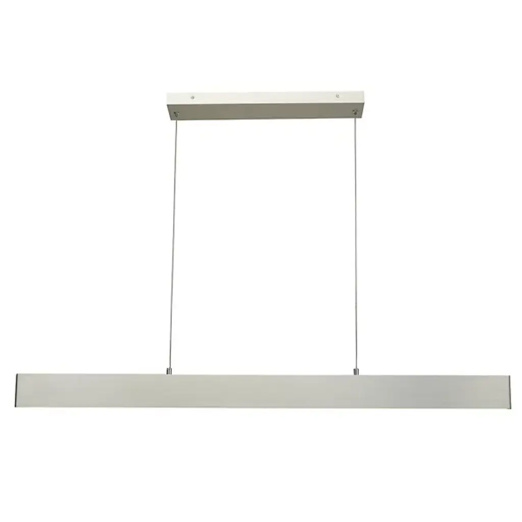 The Mario LED Linear Suspension Light from Huxe complements a dining room's modern sensibilities with a slick, streamlined composition. The structure is milled into its rounded bar shape and finished with a sophisticated brushed texture by hand. Ultra-sleek aircraft cables power the piece and suspend it with tasteful vertical accents. The aircraft cables demarcate the edges of an opening on the top surface of the housing. Its bottom side is completely left open, capped as the top with an acrylic diffuser. Dynamic illumination is realized as integrated LEDs produce an accented uplight and uniform downlight