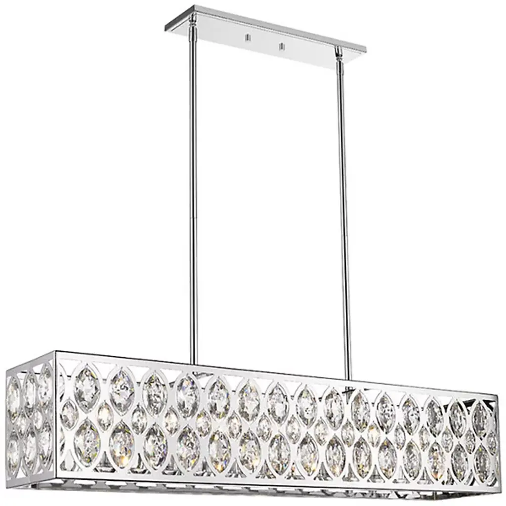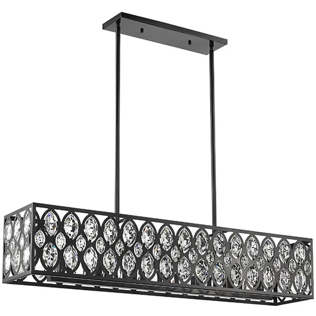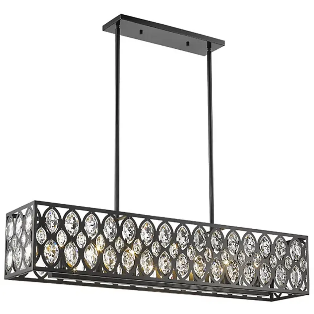 Elegance meets glamour in the Mckinley Linear Suspension from Alder & Ore. It's ideal for a Hollywood Regency-style home but the perfect addition to a hallway. The steel shade features captivating ellipse-shaped cutouts adorned with shimmering clear crystal pendants, creating a striking contrast. With candelabras tucked behind the crystals, this low-profile fixture offers illumination. It casts a captivating fractalized pattern along the walls and footpath, adding a touch of drama to your space.