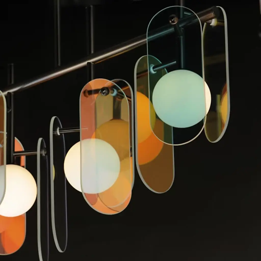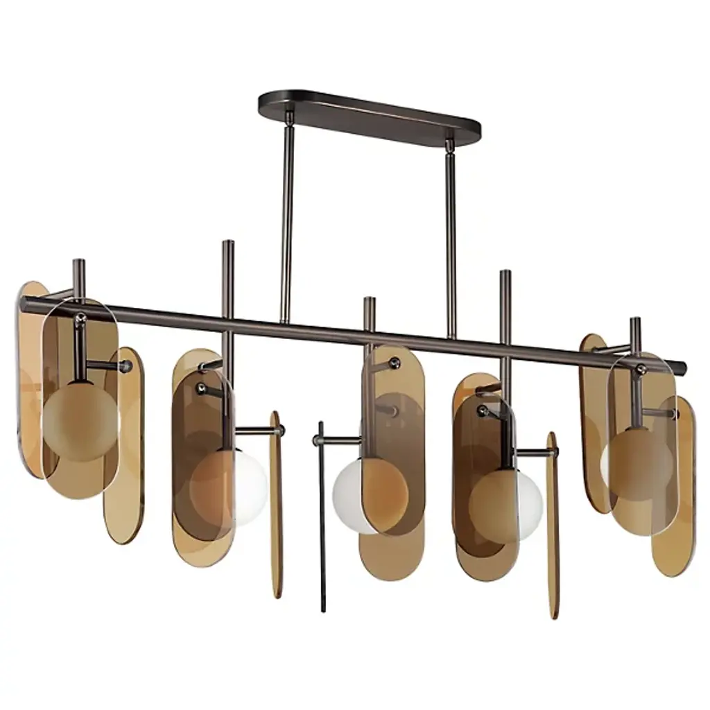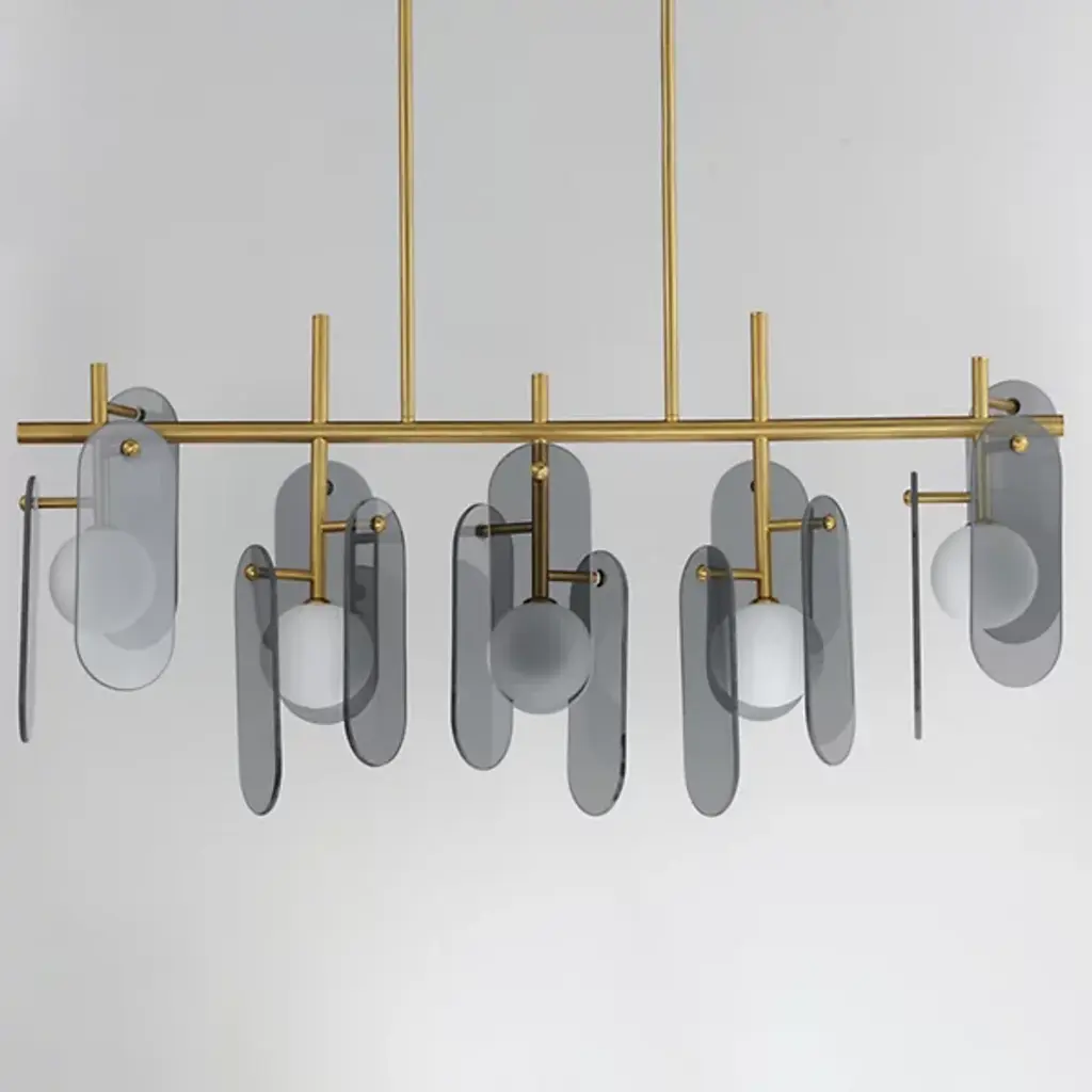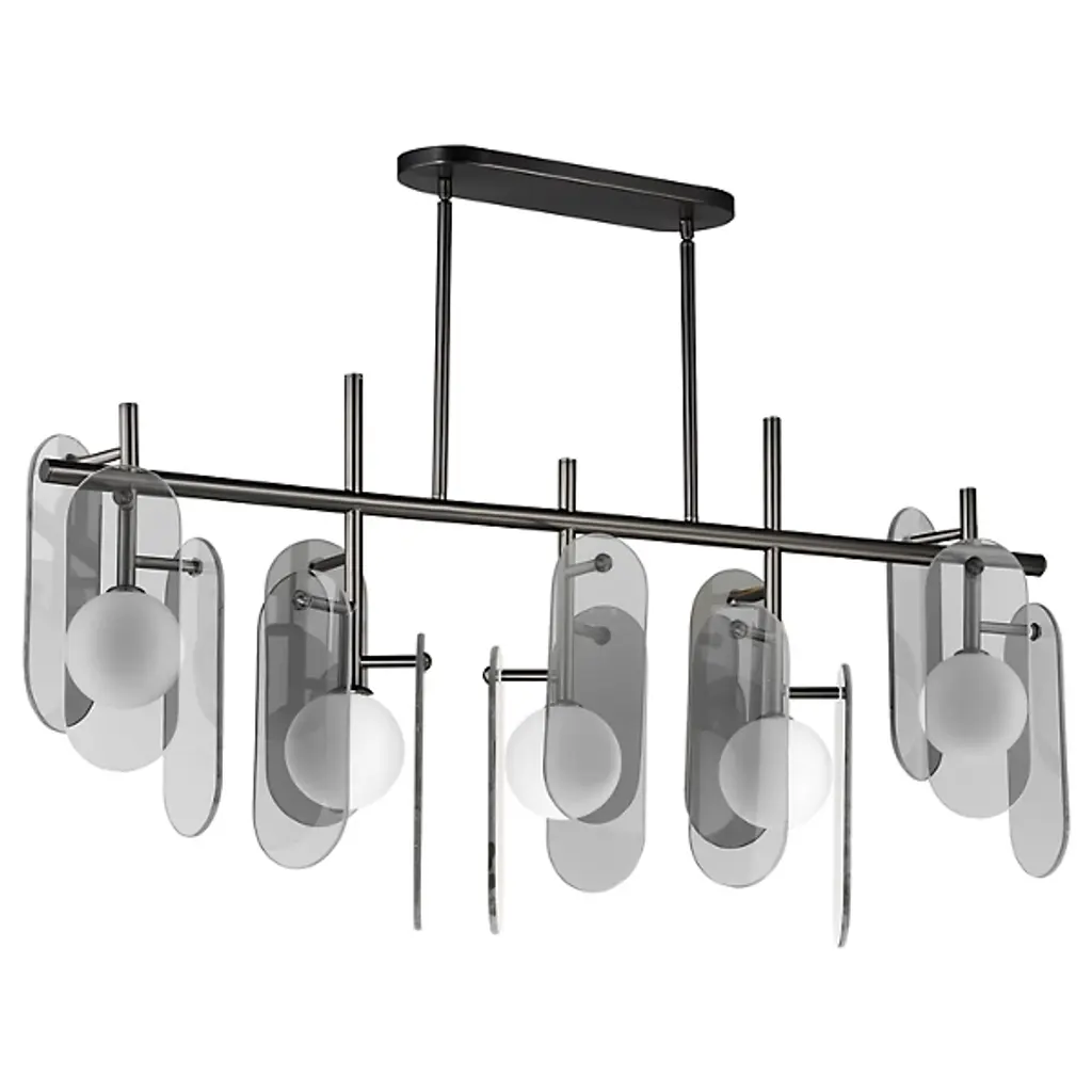 Fashioned as an ode to the timeless allure of glass, the Megalith Linear Suspension from Studio M embodies enduring elegance. Supported by robust iron stems descending from an oval canopy, it extends to cradle an assortment of oval-shaped translucent glass panels, each bathed in the gentle glow emitted by white-cased glass globes at their core; the fixture presents a captivating spectacle of indoor illumination. A diverse array of color options are available for the glass shades and the metal finish, ranging from subtle hues to vibrant tones, allowing for critical customization. The piece exudes an air of luxury and refinement, imparting a sophisticated ambiance that combines aesthetic allure with customizable versatility.