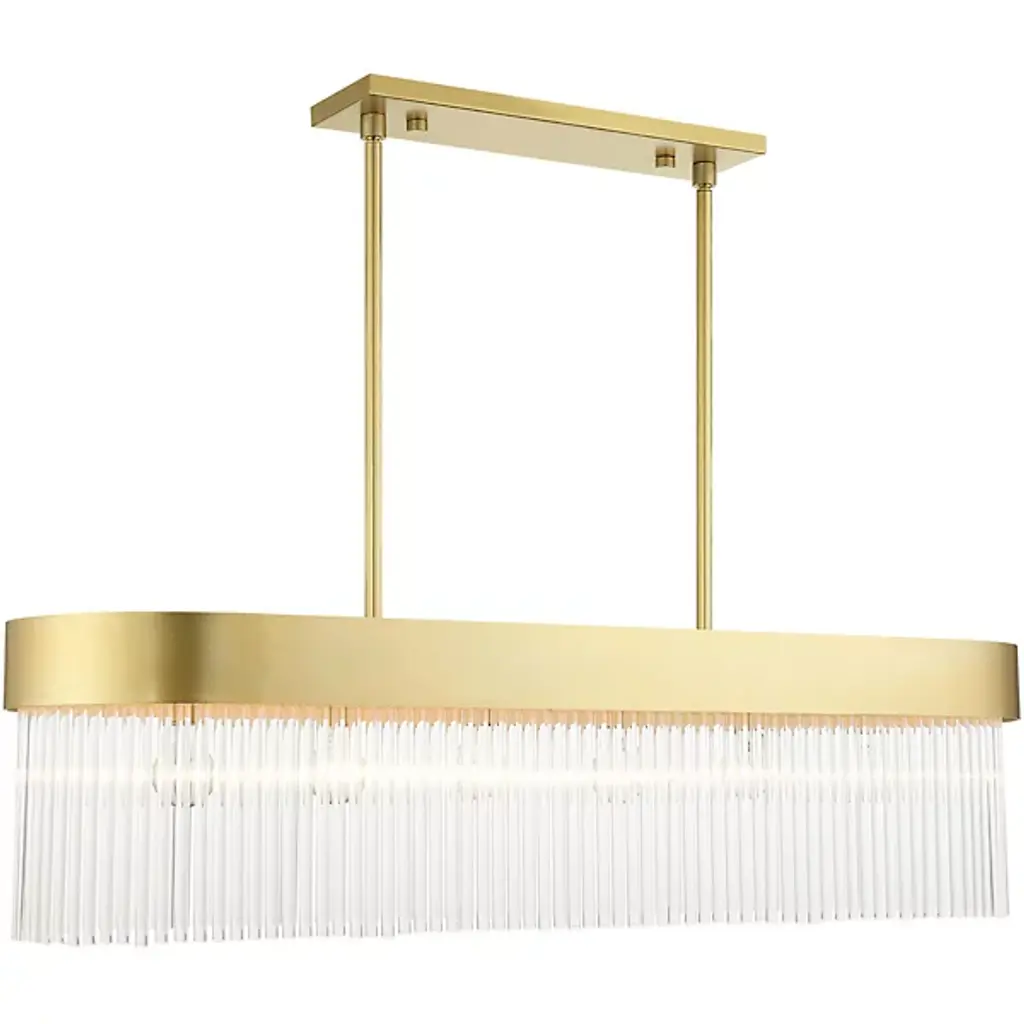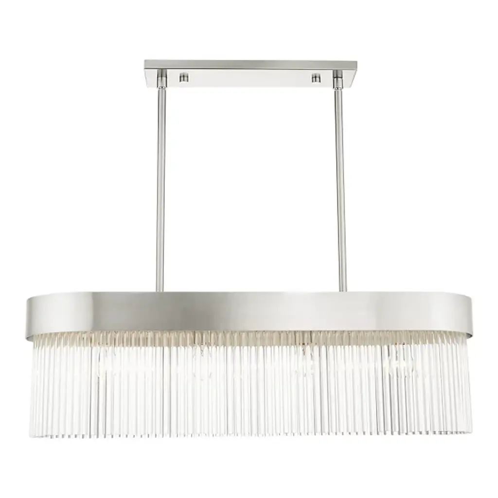 The Melanie Linear Suspension by Alder & Ore brings a refined flavor of elegance to spaces through a clean silhouette lined with shimmering decoration. Suspended from a pair of downrods, a smooth, oval-shaped metal frame allows a collection of clear crystal rods to wrap around the light source like a decorative curtain. This design playfully reflects, refracts, and filters the bright light provided by the arrangement of lamps within. The luminaire’s warm, filling aura and handsome linear silhouette lend to a sophisticated touch to rooms.
